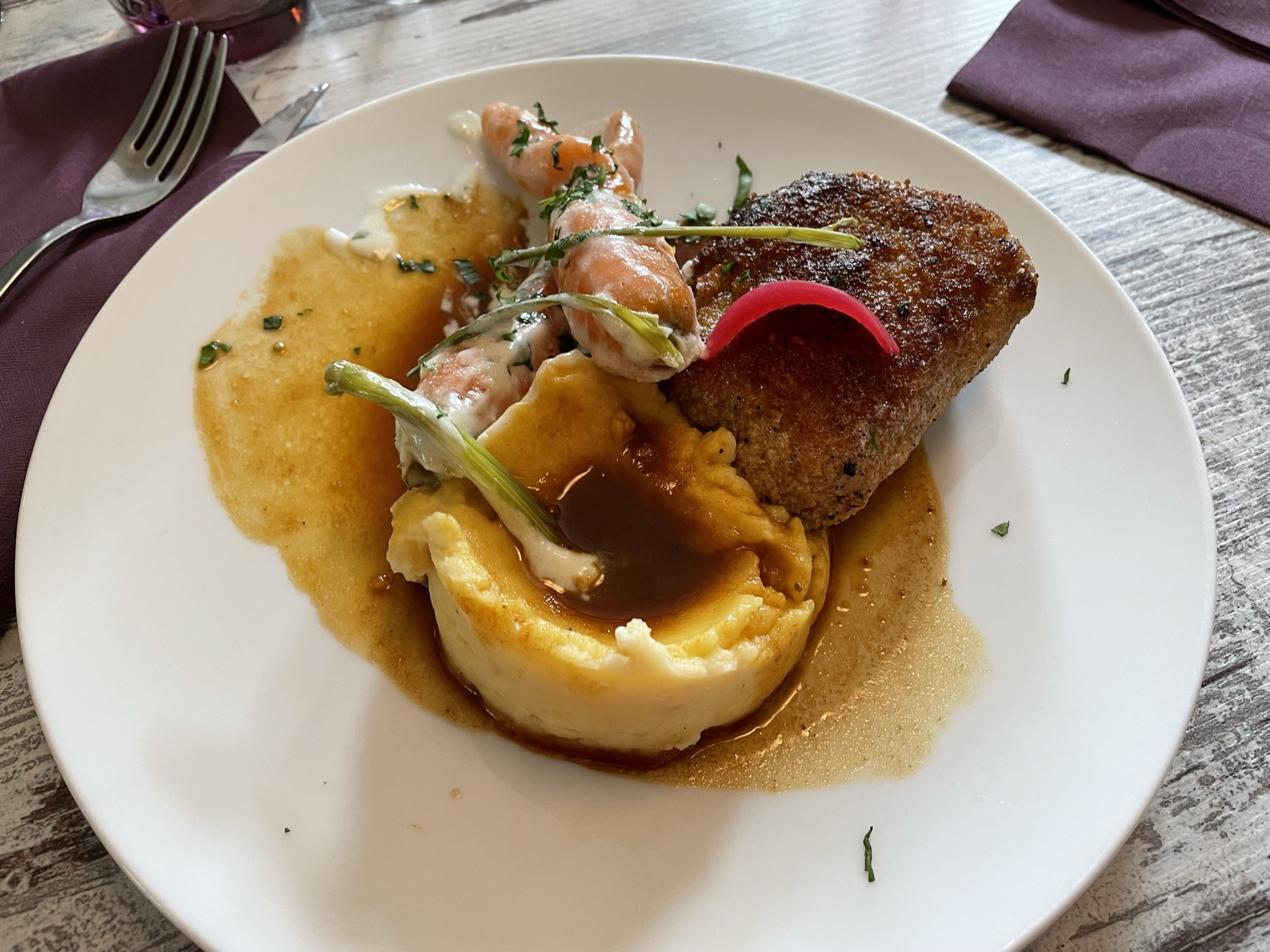 Posté le 16/11/2024 à 16:55"Nous étions 4 adultes et 2 enfants. Accueil très chaleureux, présentation du menu très détaillé, le chef est un passionné! Des produits locaux. Par contre, la terrine de poisson pas très goûteuse. Les Crozets trop secs. Le Burger sans sauce, accompagnement pomme de terre grenaille trop molles. Les suprêmes de volaille excellent. Bon vin bio local. Les desserts très bons, sauf la glace enfant, un bâtonnet industriel, 9 additifs dont 4 à risque (il y a pourtant de très bons fabriquant de glace dans la région...). Bilan mitigé pour nous, surtout vu les tarifs pratiqués..."