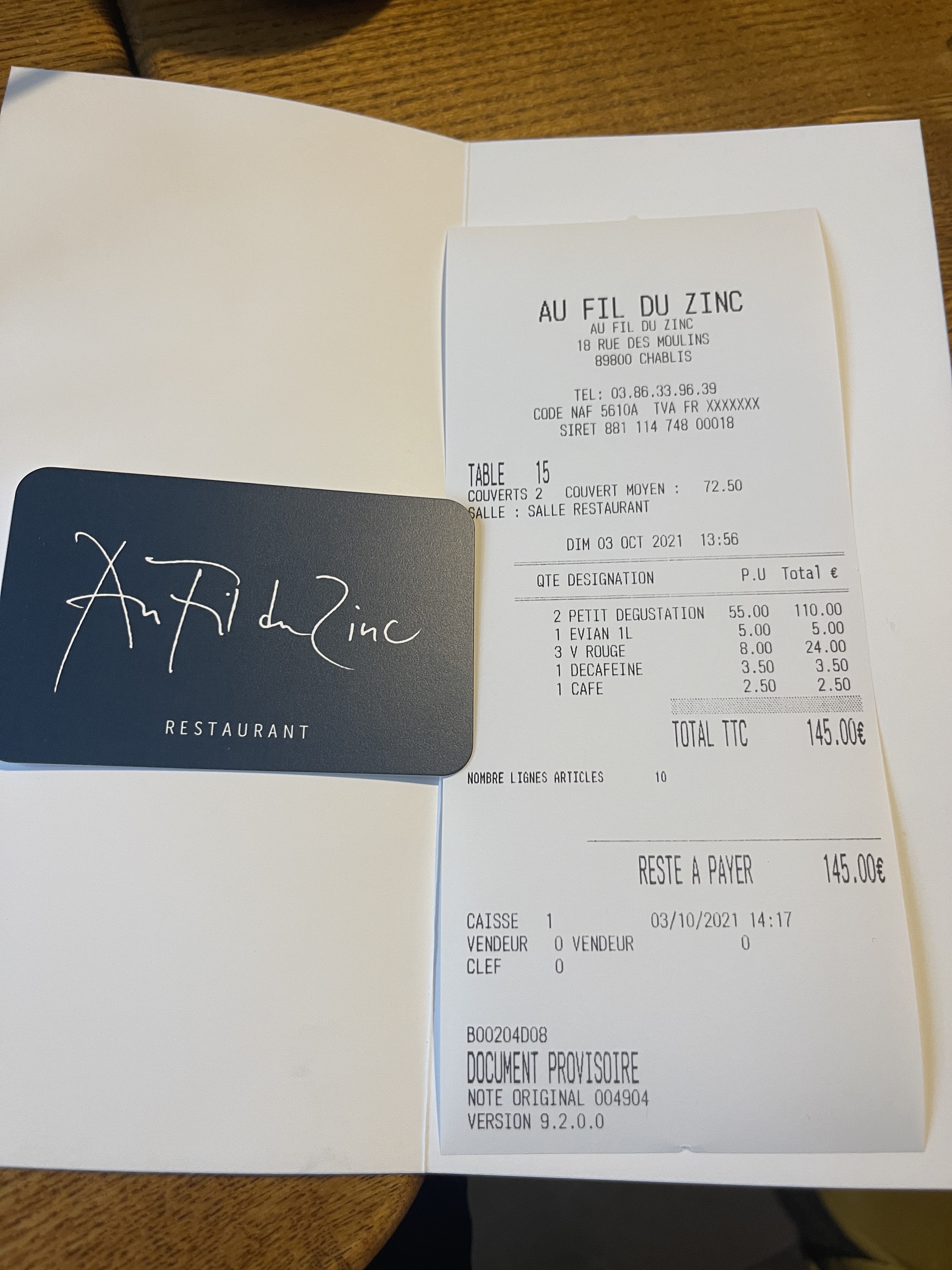 Nous avons pris le menu dégustation en 7 services mais il ne nous en a été servi que 6. Et nous avons pris une bouteille de Chablis Grand Cru à plus de 100€ qui nous a été amenée déjà ouverte, ce qui ne se fait pas du tout, surtout pour un vin à ce prix. La nourriture était bonne et le cadre sympathique.