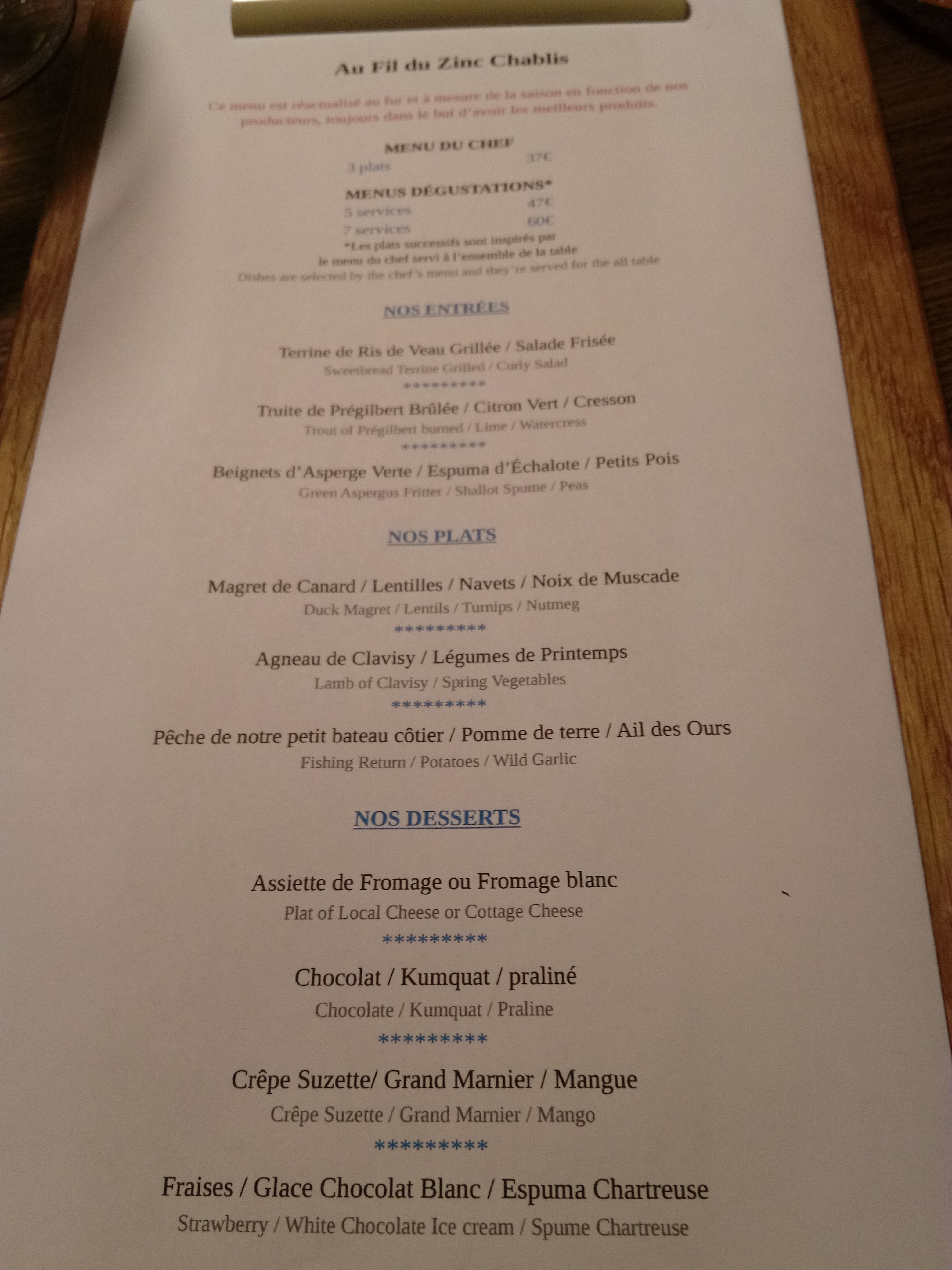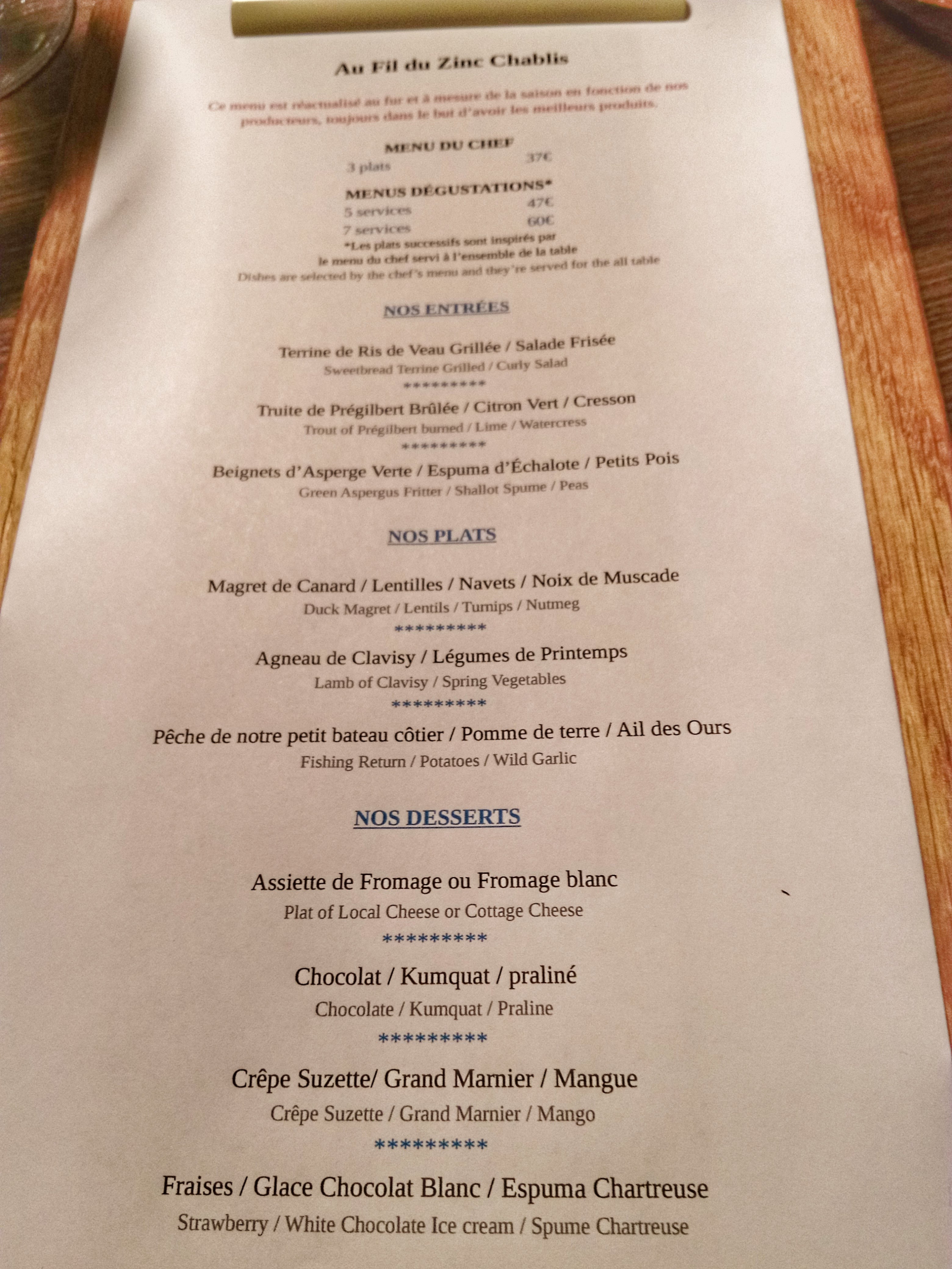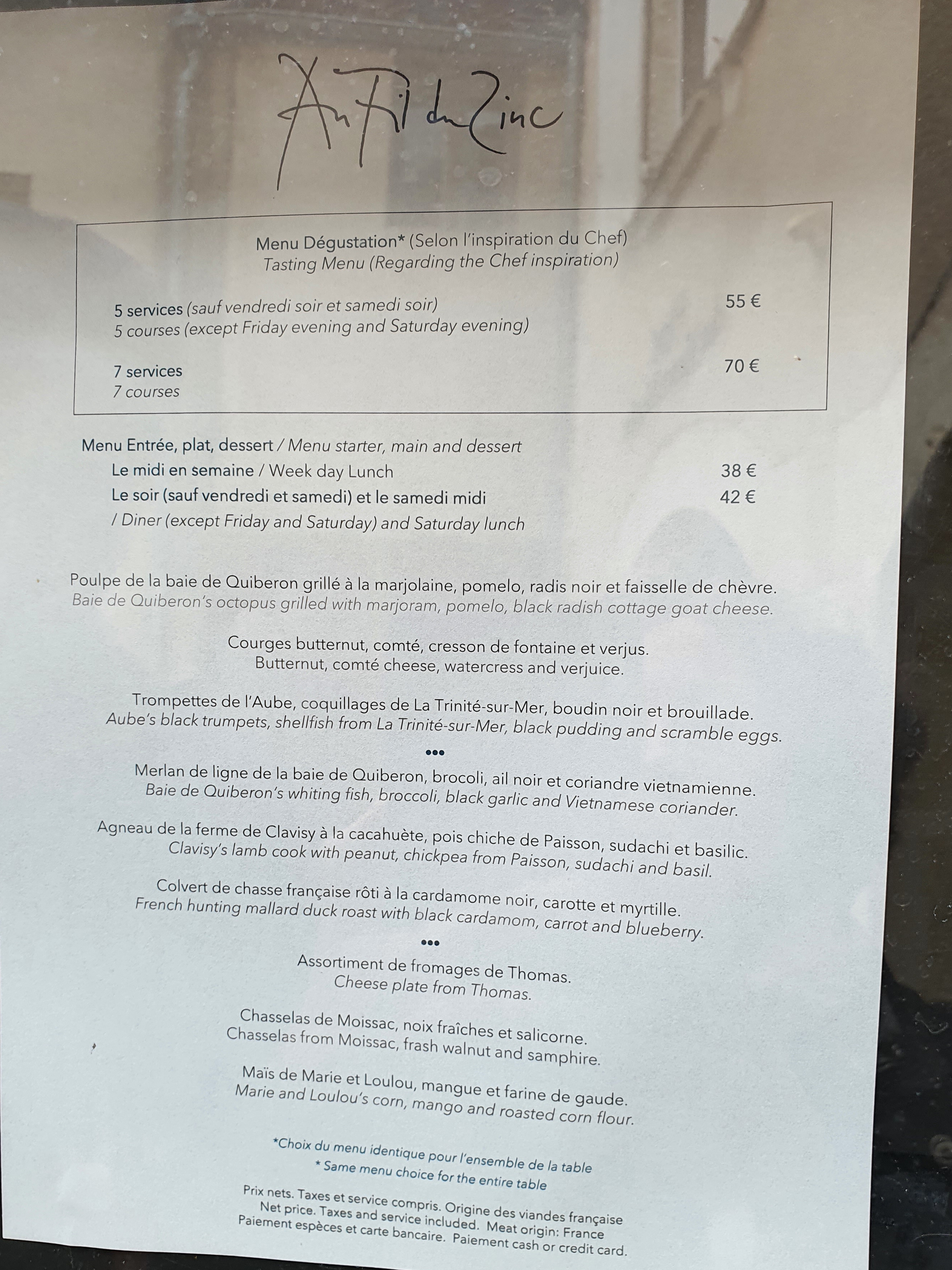 Menu unique à 7 plats pour ce soir. Nous étions à la fois inquiets et curieux de savoir ce que nous allions manger. . Cela commence par un tryptique avec 3 plats en 1 . Le feux d'artifice de saveurs débute ainsi .... Belle harmonie en bouche avec des mariages improbables de différents aliments qui s'unissent finalement parfaitement. Grand bravo à toute l 'équipe du fil du zinc. Petit bémol: le choix est limité pour ce qui concerne les vins rouges locaux du département de l ' yonne...