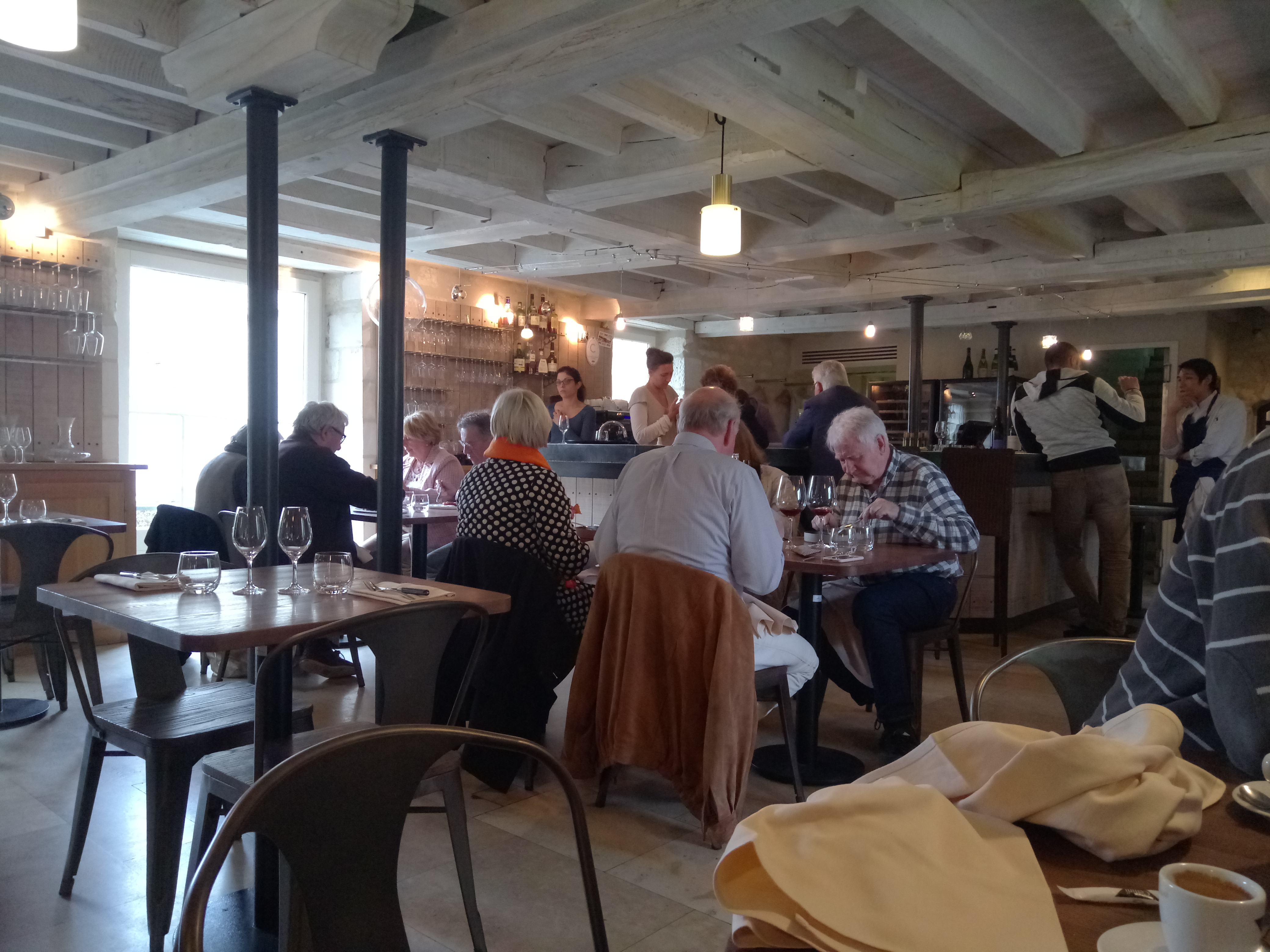 Une expérience mitigée... Nous attendions ce déjeuner avec beaucoup d’impatience, pressés de goûter ces fameux vins qu’on ne trouve qu’ici, et alléchés par les commentaires positifs. Sur les points positifs, justement: très belle carte de vins, des plats goûteux et originaux (l’agneau est à tomber par terre). Une belle expérience culinaire, nous nous sommes régalés. Un joli restaurant, bien placé. Sur les points négatifs: placés juste à côté des toilettes, première déception. Un serveur très aimable, l’autre un peu moins. Les points qui m’ont vraiment surprise: qu’on ne me change pas mon verre entre deux bouteilles de vin (différents...). Qu’on débarrasse les assiettes alors que l’un des convives n’avait pas terminé son plat. Qu’on ne prenne pas la commande du dessert du petit dernier. Qu’on me dise, quand je rectifie sa commande, que c’est embêtant car c’est compliqué au niveau du procès en cuisine (??). Qu’on me demande de garder mes couverts pour le plat d’après. Qu’on nous annonce un menu à 7 plats, qu’on ne nous en serve que 6, et qu’on justifie, à ma demande, surprise de voir arriver le fromage au lieu du poisson, et non de manière pro-active, qu’il y a eu un souci en cuisine et qu’on nous a du coup augmenté les quantités sur les autres plats. Bref ce ne sont que des détails techniques, mais leur accumulation, dans un restaurant de ce standard, a créé de la frustration et a légèrement gâché l’expérience.... Peut-être de tout petits points à revoir sur la technicité du service pour que l’expérience soit complètement réussie!