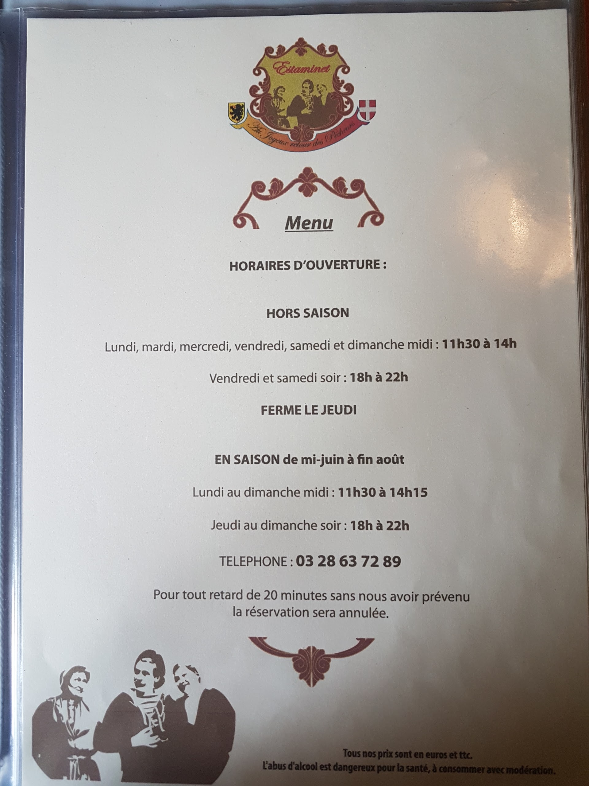 Posté le 30/07/2012 à 19:15"Plusieurs passages au Joyeux Retour des Pêcheurs, et à chaque fois l'accueil est toujours cordial, la cuisine variée, sympa, et faite sur place. L'addition est très raisonnable (menu du jour autour de 15 €). Les mois d'hiver les fondues, raclettes, tartiflettes rappelent les origines savoyardes de la patronne. Tout ceci servi avec le sourire dans un cadre typiquement estaminet régional. Bref, nous, on y retourne samedi!"