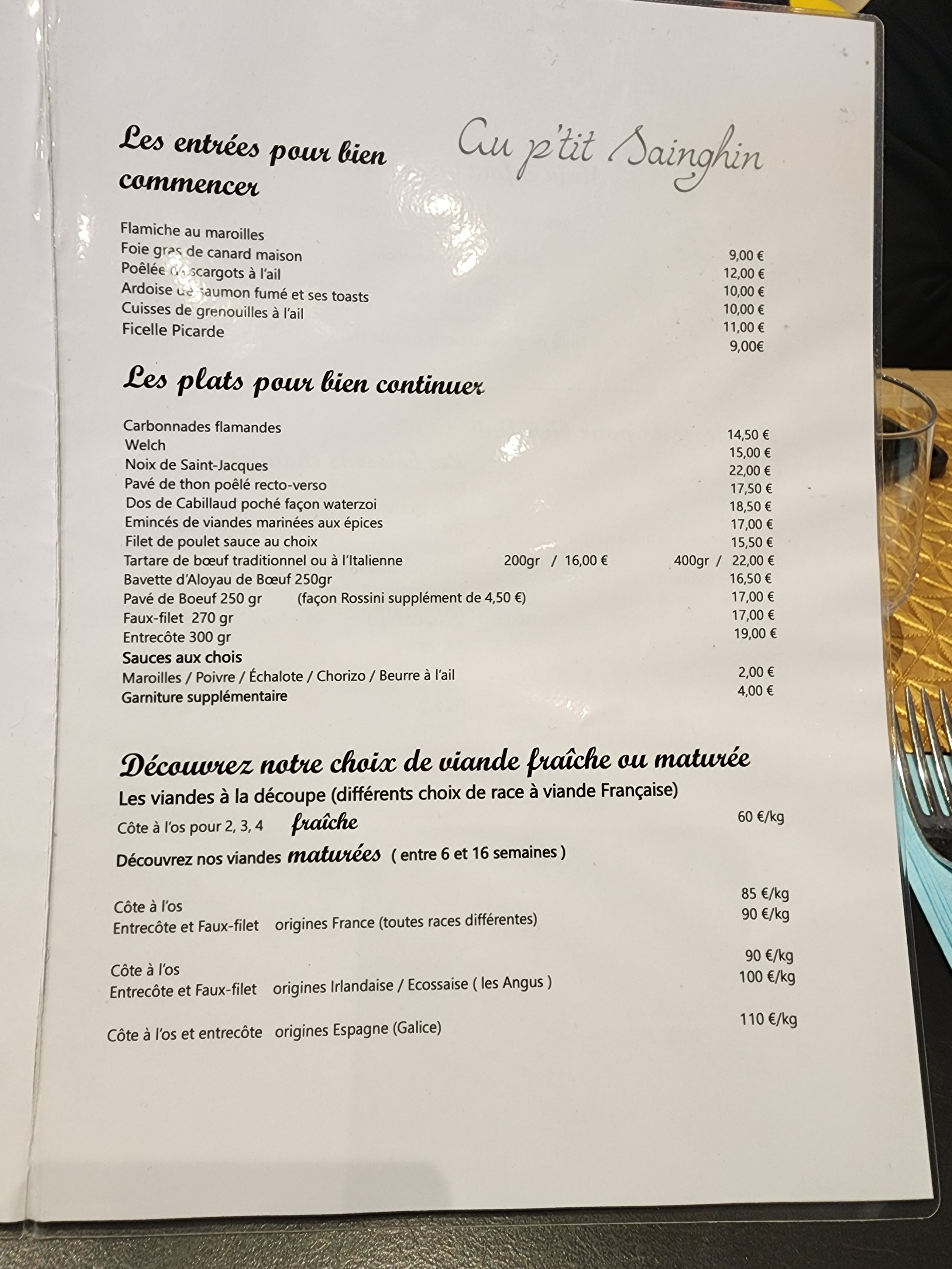 Vous aimez la bonne viande ? L’excellence du goût dans votre assiette ? Vous devez absolument tester ce restaurant. Dans la commune de Sainghin-en-Melantois, Au P’tit Saighin va vous séduire dès l’accueil pour la réservation. Oui mieux vaut réserver ! Chaleureux dès l’entrée, déco avec mélange de style, tu sens que le patron aime chiner ! Carte simple ! Une carte des vins sélectionnés avec soin. Et le conseil du chef ! La viande , avec cave de maturation. La viande est coupé et présenté avant cuisson. Frites , salade ou risotto, et l’assortiment de sauce. Cuisson exactement comme vous le souhaitez ( là aussi belle maîtrise) . La mise en bouche est juste parfaite, saveur, tendreté. Le vrai parfum de la bonne viande . Navré ami Vegan ! Mais là c’est vraiment succulent ! Bravo 🎉 Et toujours le même rituel , la patron passe de table en table avec son équipe ! Car là aussi tu sens qu’il y a de l’amour pour le client.