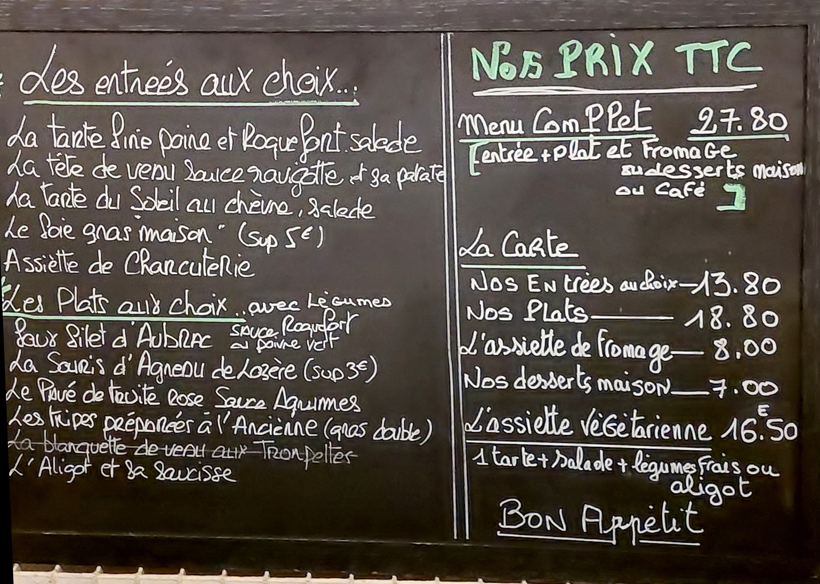 Posté le 30/09/2023 à 21:29"Formidable Parfait La patronne est super sympathique et rigolote Les plats sont copieux et excellents Prix correct Entrées : salade cevenole, tête de Veau ravigote Plats : rôti de veau sauce aux cèpes, tripoux averonnais Fromage et glace 35 euros par personne"