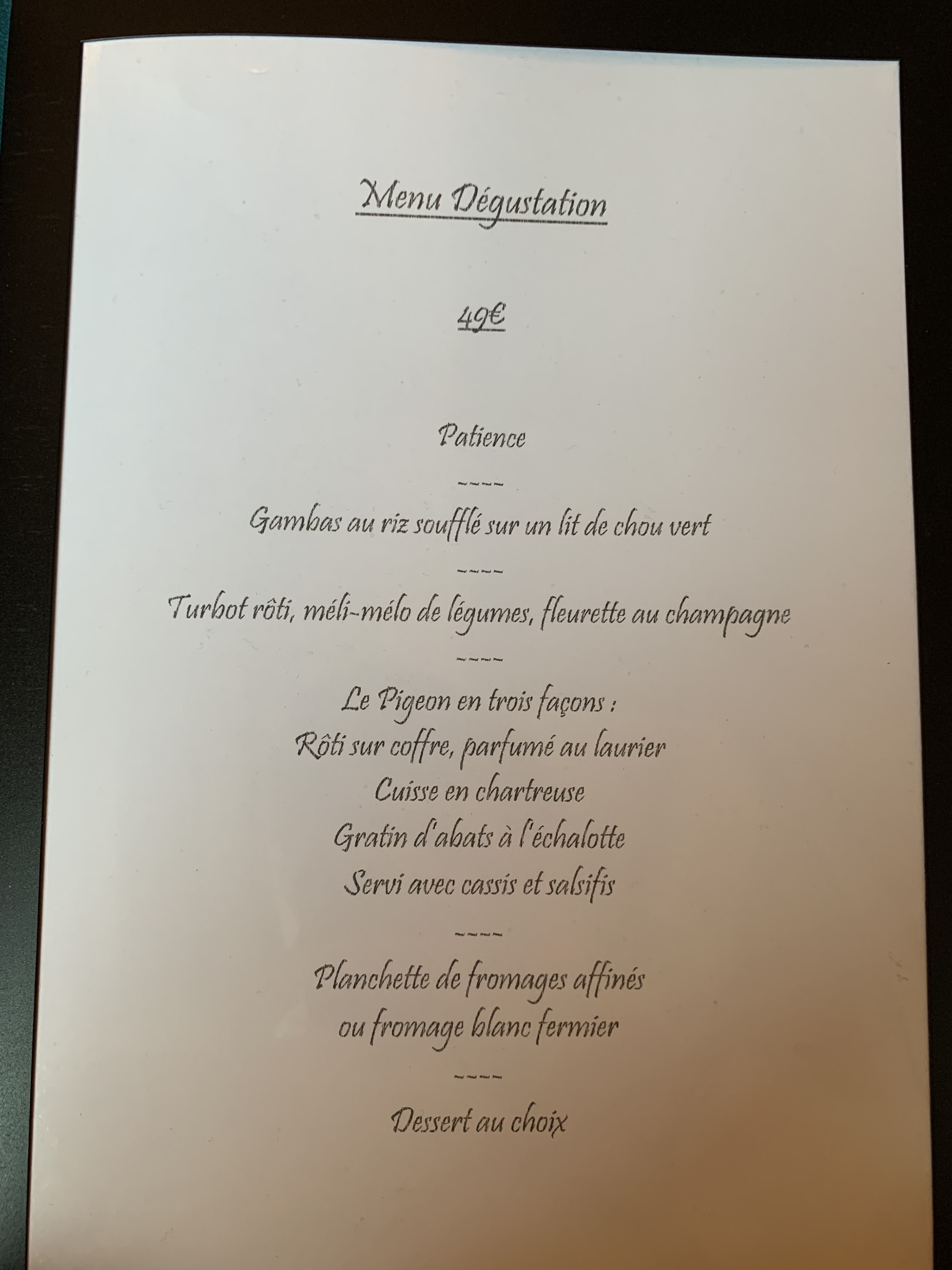 Je n'ai rien a redire sur le lieu super convivial , très bonne cuisine sauf que c'est dommage qu'il n'y ai pas au moins deux plats dans le menu a 18€ car celui qui ne mange pas de viande ou qui est végétarien est obligé de prendre le menu a 28€ ou alors ce qu'il m'est arrivé c'est de prendre un poisson avec un supplément de 6€. C'est un des seuls restaurant où j'ai rencontré ce problème peut-être a revoir Cordialement