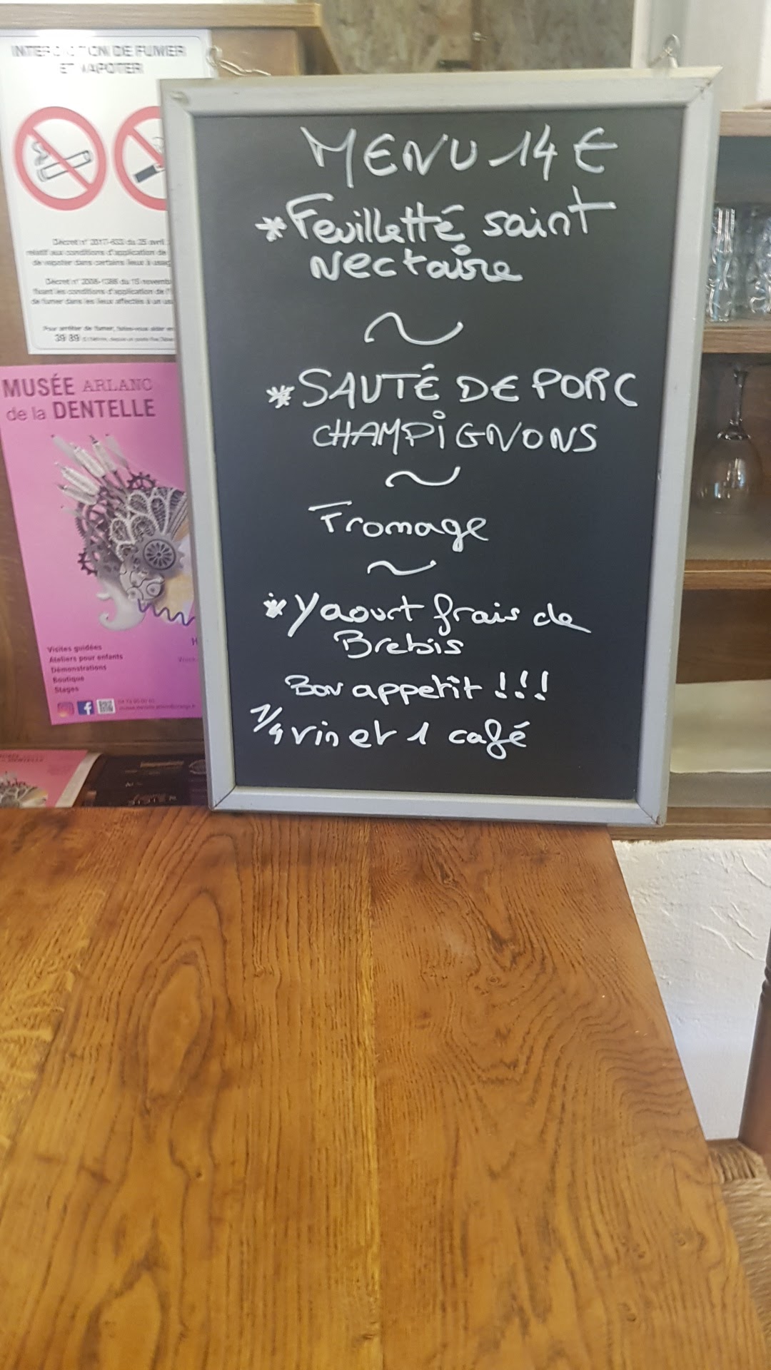 Repas de midi dans ce petit village calme au milieu d'une belle nature. Terrasse. Gentillesse de l'accueil (patron), jeunes serveuses professionnelles assurant un service rapide , cuisine copieuse et bonne avec excellent rapport qualité/prix.Délicieux fromage blanc au coulis de framboises....Clients heureux .