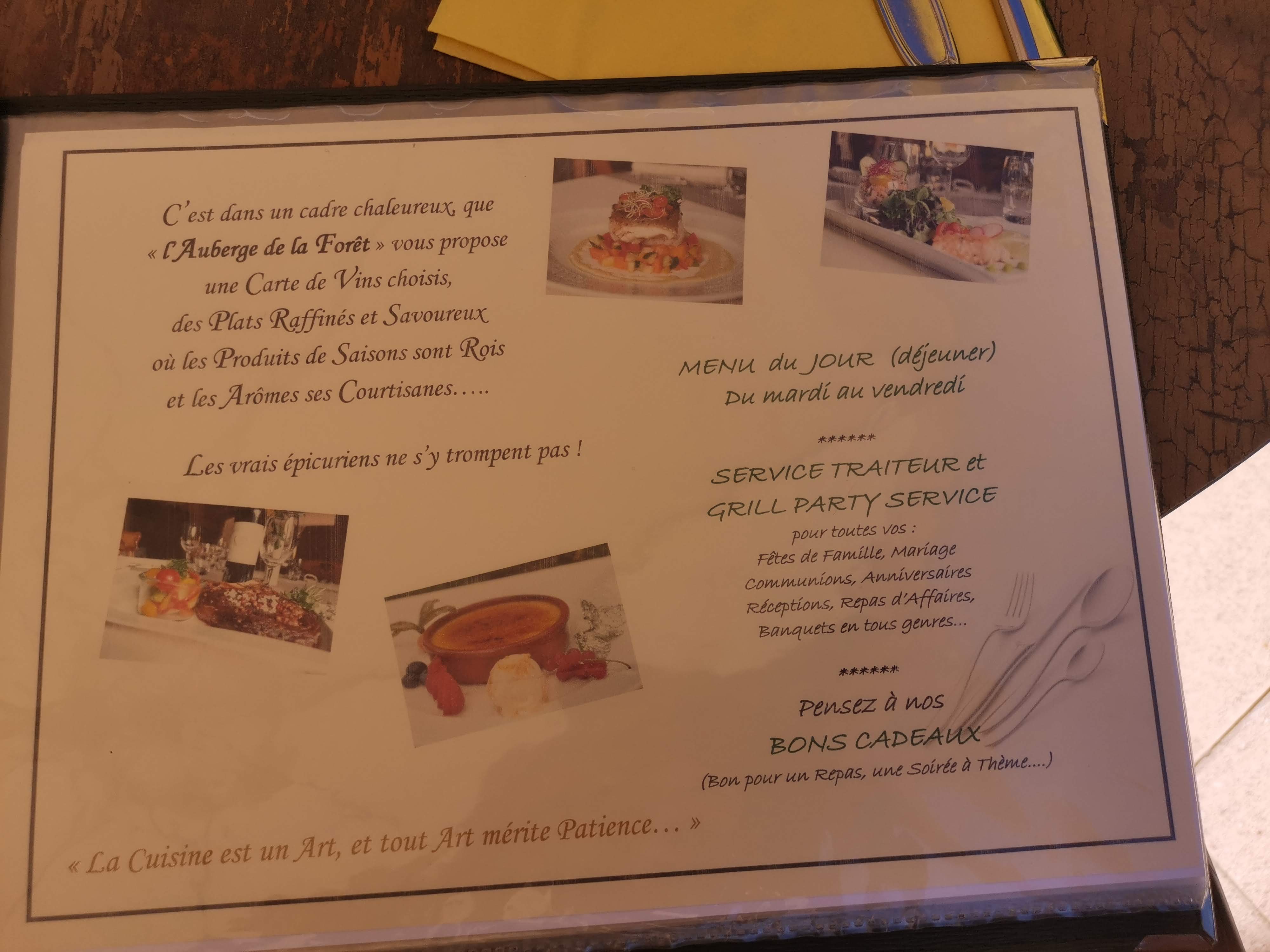 Nous sommes allés au restaurant de l'Auberge de la Forêt pour la première fois aujourd'hui. C'était très agréable de s'asseoir en terrasse, mais nous avons trouvé l'intérieur du restaurant encore plus beau. Ma femme a choisi le Cordon Bleu et moi L'onglet de Boeuf, les deux plats étaient excellents ainsi que les accompagnements. Avant cela, il y avait aussi « le salut de la cuisine », tout simplement délicieux. Nous avons senti l'excellent goût des plats sur nos langues tout au long de l'après-midi. Ce fut vraiment une magnifique journée pour nous au restaurant de l'Auberge de la Forêt et en Alsace. Nous aimerions certainement y revenir. Nous ne pouvons que recommander le restaurant.