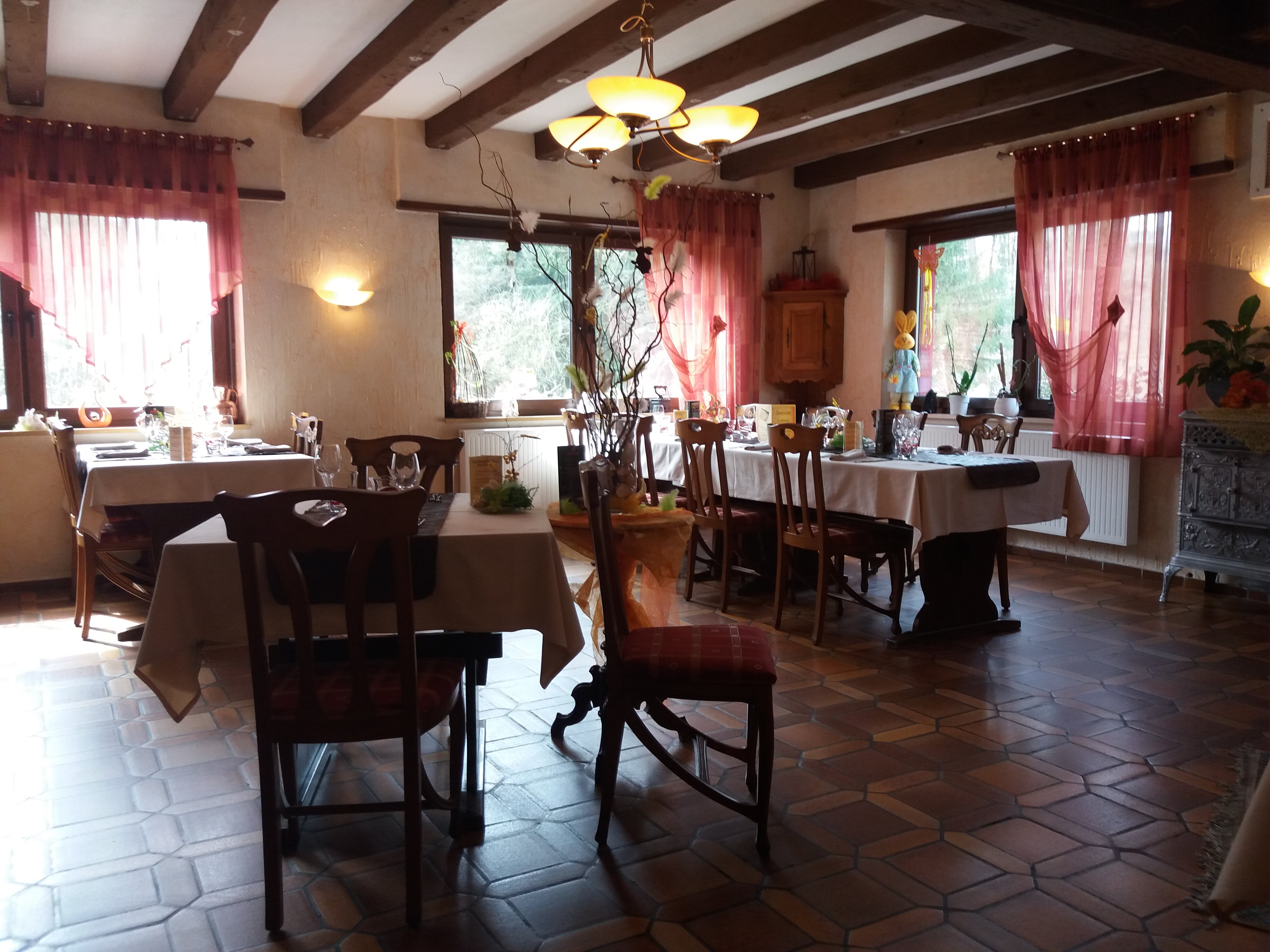 Endroit très pittoresque, belle terrasse en été, en bordure de forêt.Restaurant spacieux, ou l’on ne mange pas à côté du voisin, tables bien espacées. Nous avons juste profité du restaurant. Menu excellent, très bonne cuisine, du fait maison, plat super bien présentés, qualité de viande excellente. La qualité est au rendez vous , avec des prix corrects. L’accueil y est tres sympathique ainsi qu’un service sans faute, aimable et souriant. Très belle découverte !