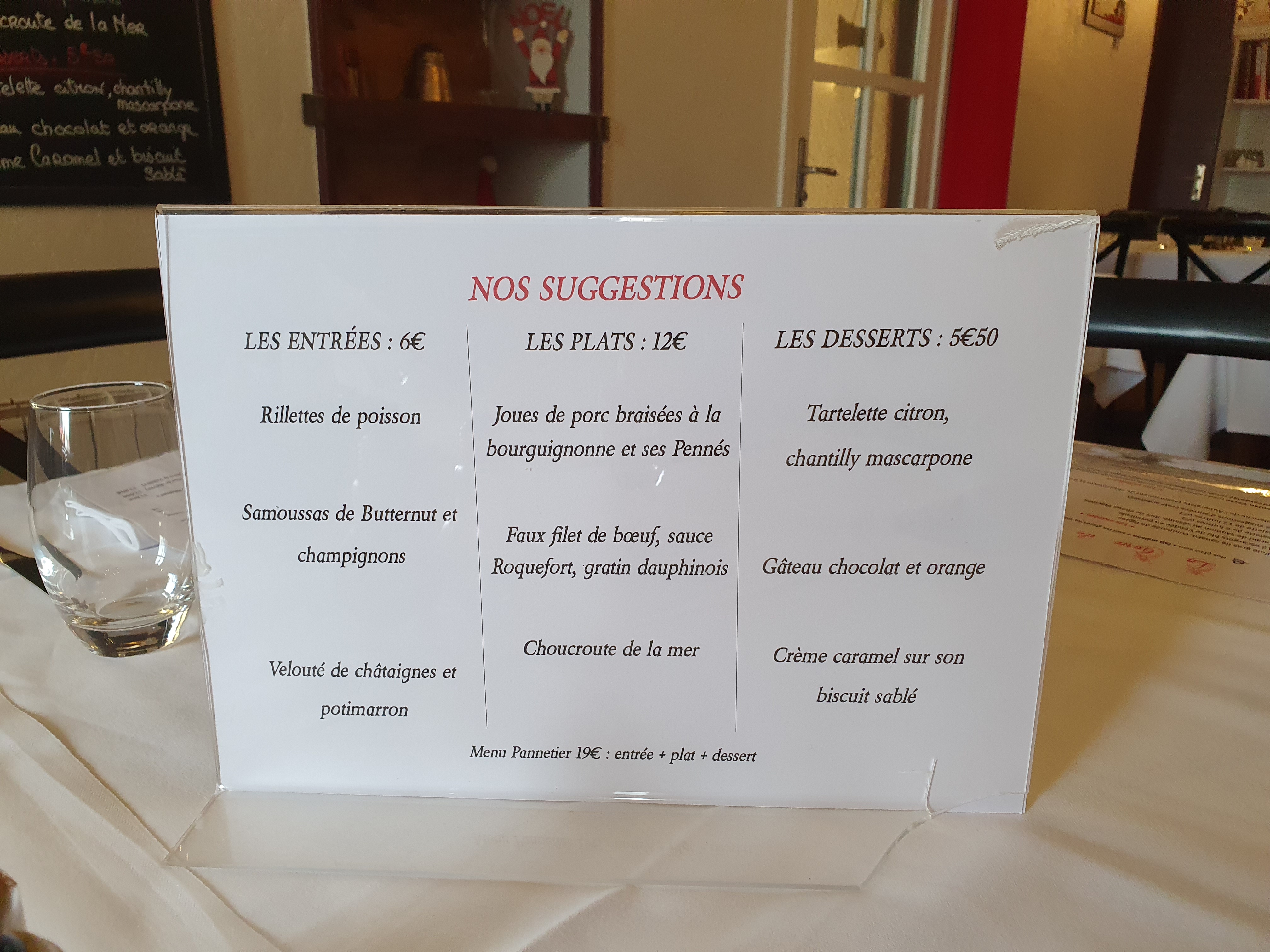 Nous y avons déjeuné lors du marché de Noël de Vouvant. Nous avions une belle table près de la cheminée où crépitait un bon feu bien agréable et avons très bien mangé, quantité et qualité : j'ai adoré le potage de saison...et la suite aussi. Nous avions choisi le menu à 16,50€. Chouette ambiance: Les serveuses étaient habillées en Père Noël et les serveurs en lutins. Le marché de Noël vaut le coup d'être vu, formidable. Très bonne et belle journée. J'y retournerai l'année prochaine! Merci.