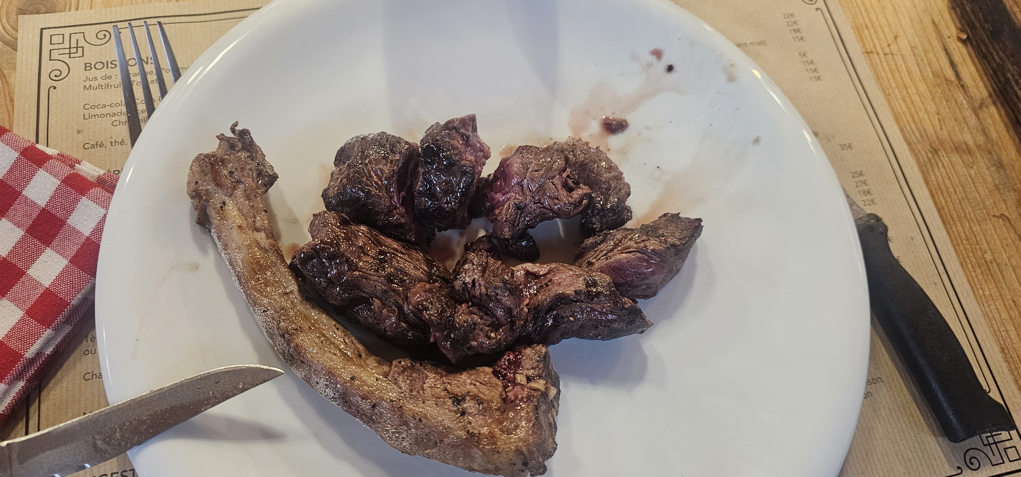 Cote a l os d 1 kg seuls 300 g dont comestibles le reste déchets gras et os.On nous prévient dur une ardoise les prix augmentent il nous rn coûtera 10 € de plus sur la côte.Nos salaires et retraites n ont pas explose comme vos tarifs, ! Le foie gras aussi a pris une augmentation mais seulement de 2 €. Il était très bon et la hausse raisonnable et compréhensible. Nous ne recommandons pas.