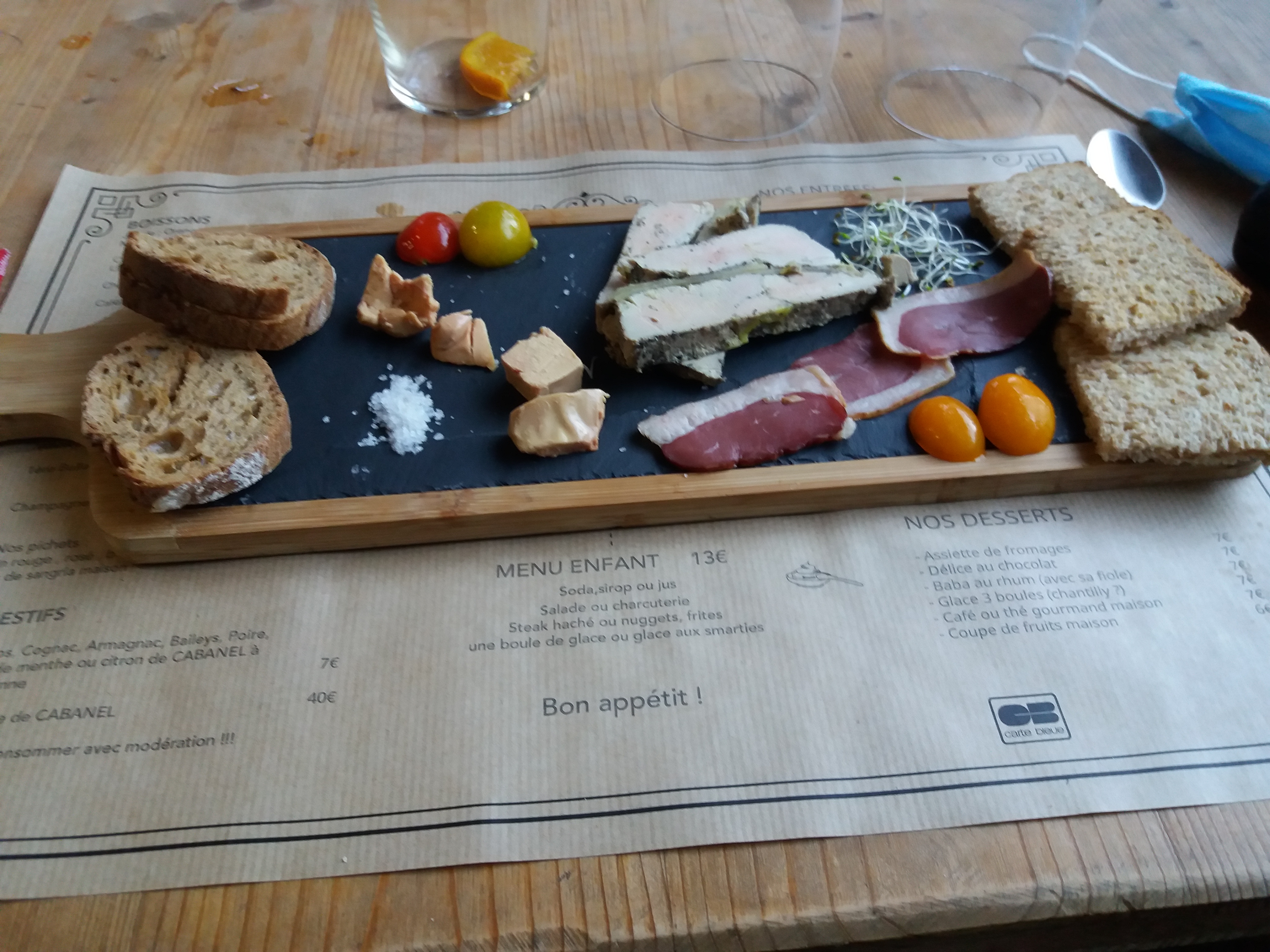 Endroit vraiment chaleureux avec un menu alléchant et des sourires dans la salle. Même s'il y avait du monde, nous avons trouvé le service un peu long. Pour flâner en couple ça passe mais avec des enfants 1h15 avant le repas ça fait long. Les menus enfants ont un bon rapport qualité/quantité/prix (15€ entrée plat dessert soda) Attention ce sont des nuggets et pas des tenders. Les frites maison c'est top. La soupe à l'oignon est très gourmande (trop de pain et pas assez d'oignons à mon sens mais le gruyère et le cochon dedans vraiment top) La demi pintade (plat du jour) manquait de cuisson et je n'avais plus assez faim pour demander de repartir au grill. Le magret, excellent. La sauce aux abats est en réalité une tartine de pain avec du foie mixé dessus. Le lieu est atypique Nous y reviendrons en famille pour goûter d'autres plats comme le gorille Rossini !!