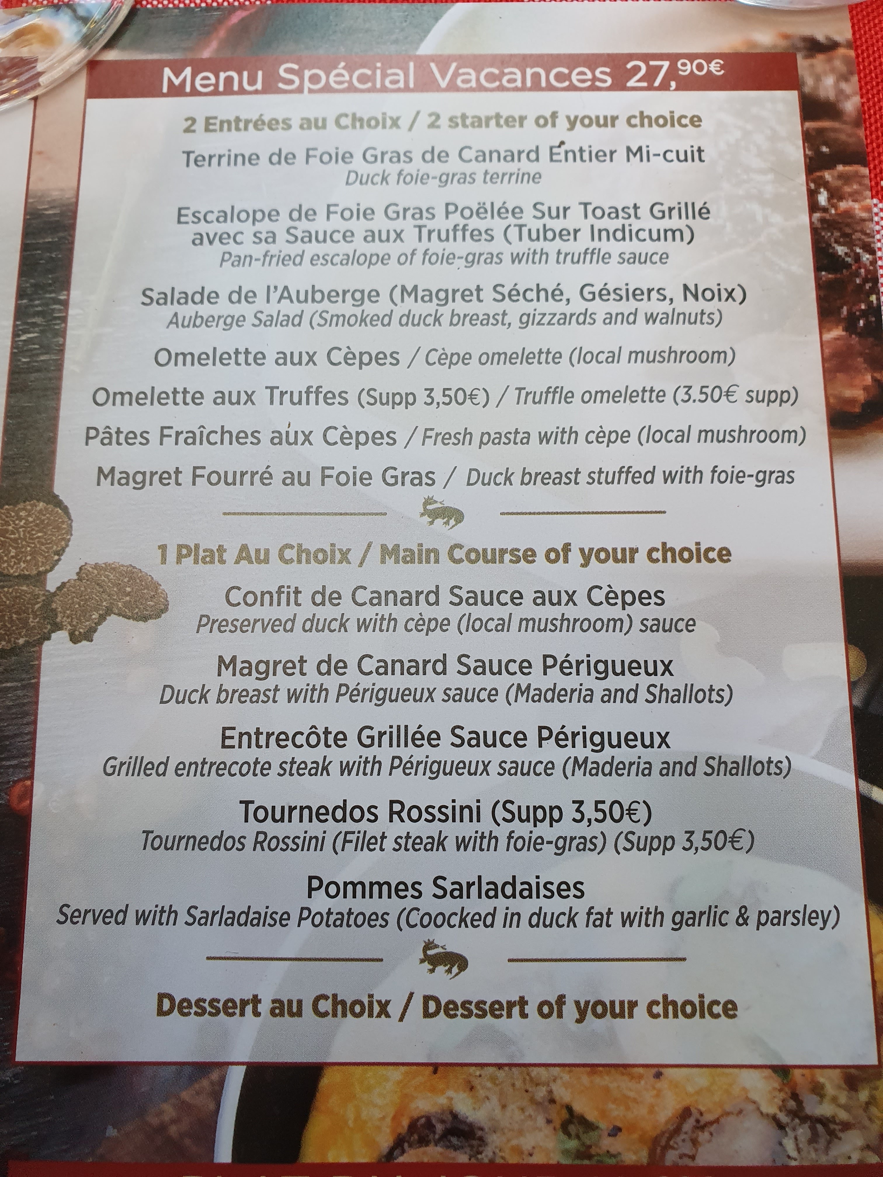 Très moyen pour le prix (menu à 23,50€) foie gras j en ai mangé de bien meilleur ! Celui ci était un peu aigre, le magret il s agit en fait d un petit demi magret, les pommes de terre à la salardaises tout juste cuites et servies tièdes, seule la tarte aux noix est sortie du lot ainsi que les escargots sauce cèpes Serveur très dynamique et agréable Bref déçue car j y suis allée en suivant les recommandations du petit futé 🤔