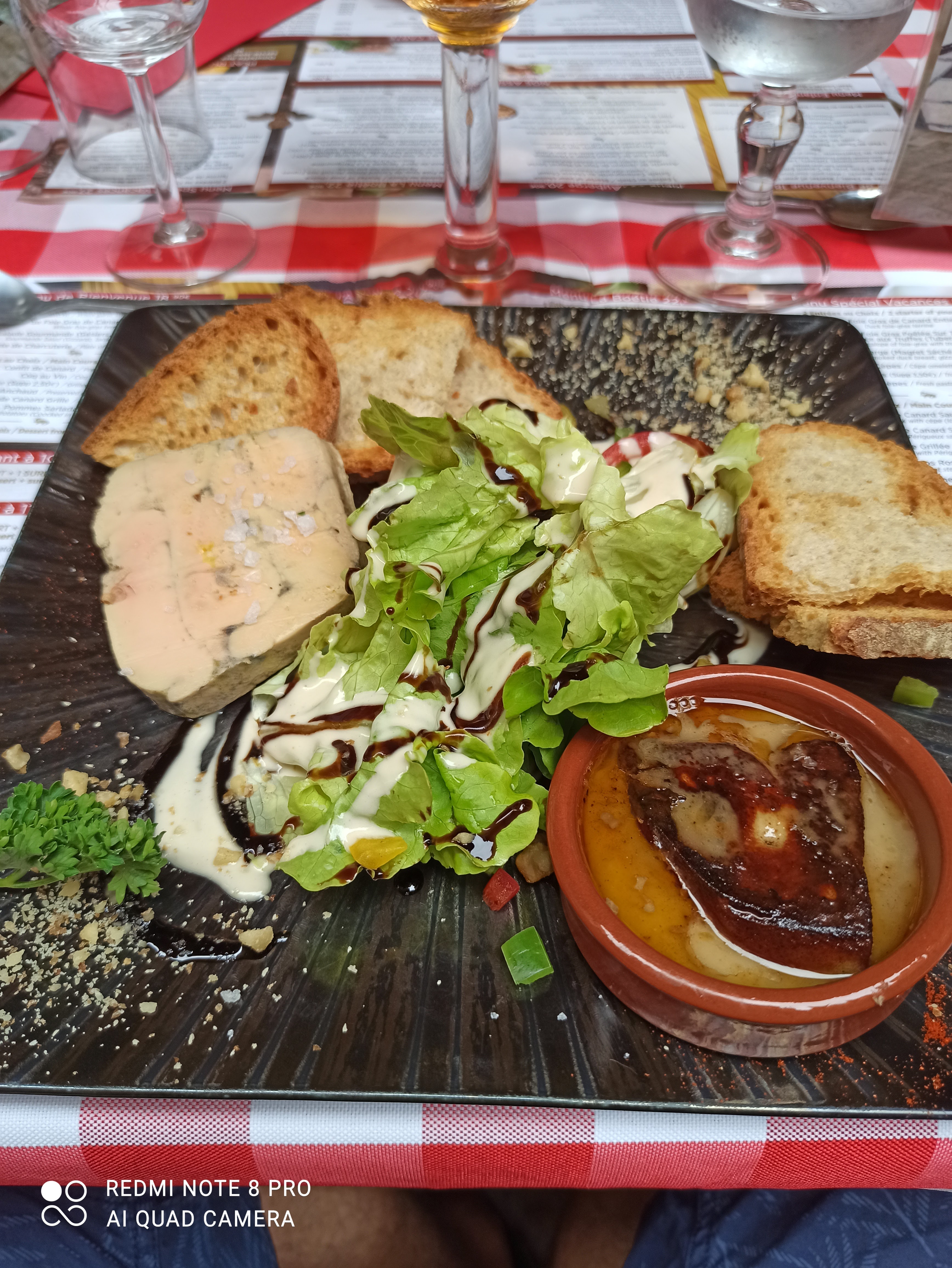 Décevant ! Nous avions réservé et nous nous sommes retrouvés au fond d’une impasse humide sentant le moisi… Assiette aux 3 Foies Gras et Terrine de Foie Gras de Canard mi-cuit entier : Foies gras trop salés servis avec de la salade et des tomates ! ! ! pas à la hauteur de la région ! ! !