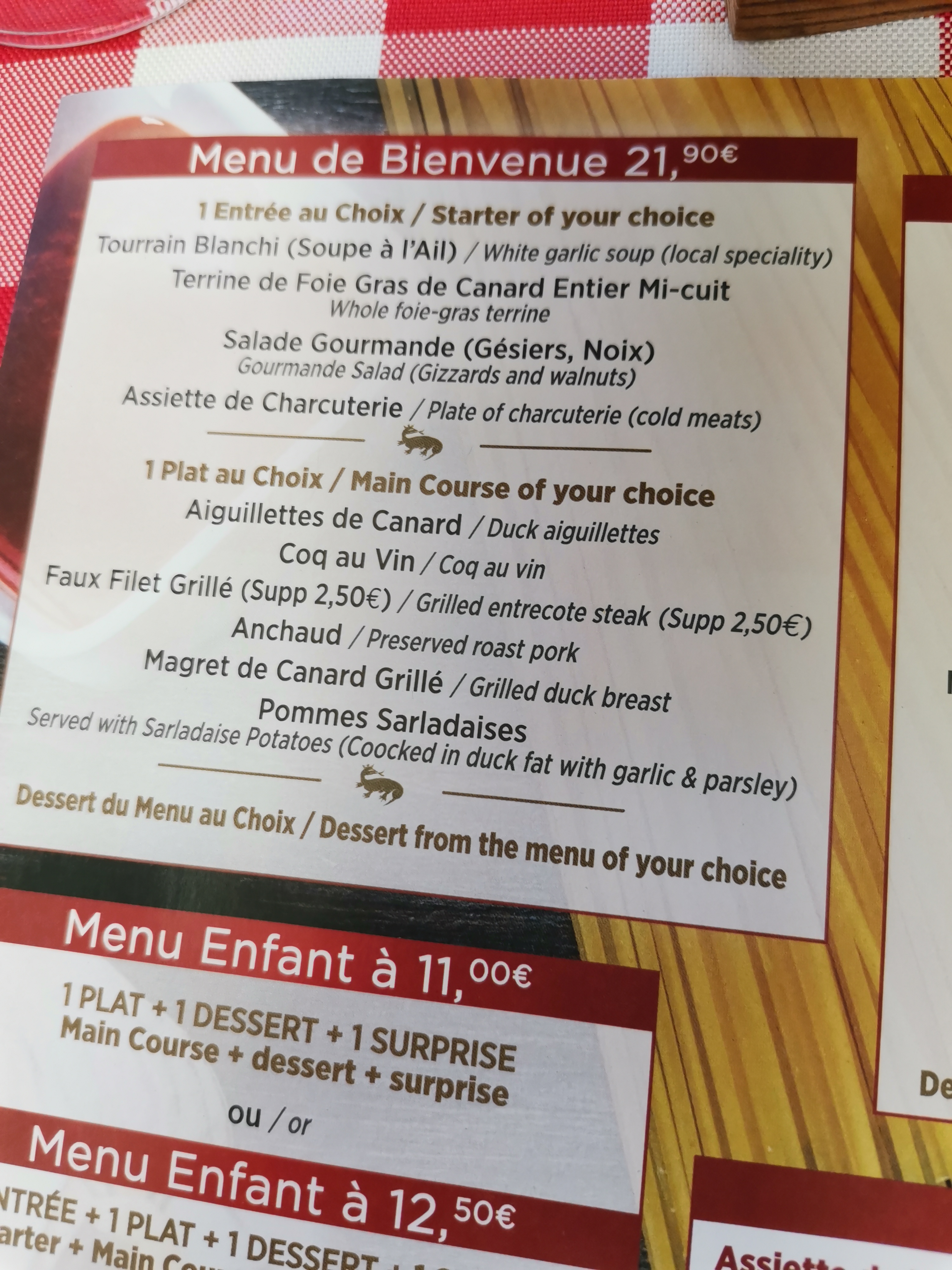 Piège à touristes, nous avons commandé 2 menus, foie gras insipide, idem pour l'anchaud. Aiguillettes de canard bien difficiles à manger car trop cuites (où réchauffées....?), pommes de terres salardaises..... réchauffées aussi. Seul les desserts étaient corrects. Service expéditif même si le personnel est plutôt cordial Extrêmement déçus.!! Bien dommage d'avoir ce genre d'expérience dans une si jolie ville, a éviter.