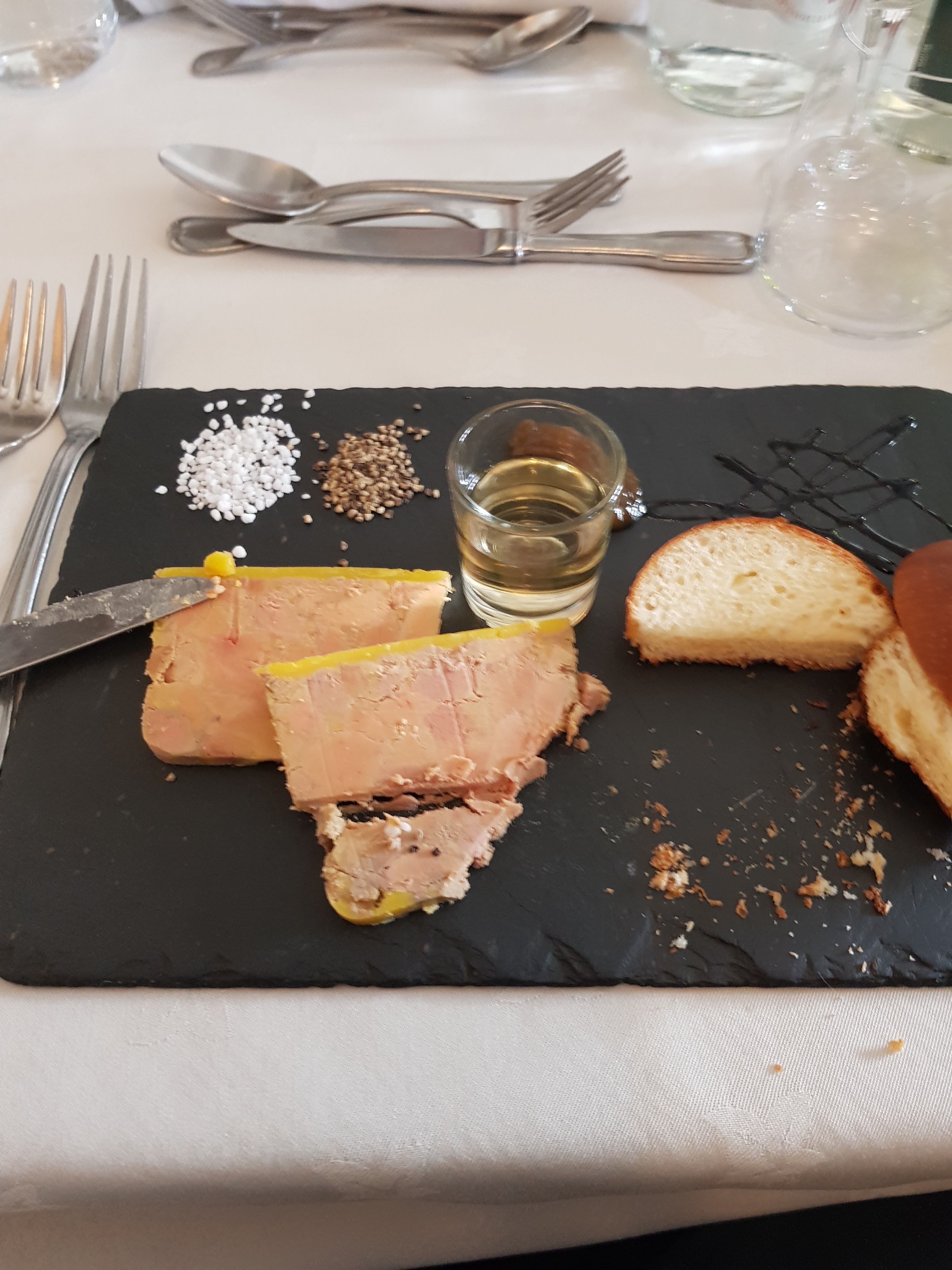 Très bon déjeuner. Classique mais frais et de qualité. Salade bien assaisonnée il manquerait juste un toast pour le foie gras. Poisson excellent, l écrasé de pomme de terre j'en aurais bien mangé plus 😁. Dessert top cuisson parfait du moelleux coulant au chocolat. Le nougat très bon mais on aurait bien ajouté des pistaches ds la glace plutôt que sur le dessus. Bon rapport qualité prix en tout cas. Un peu sombre la grande salle ms il pleuvait.
