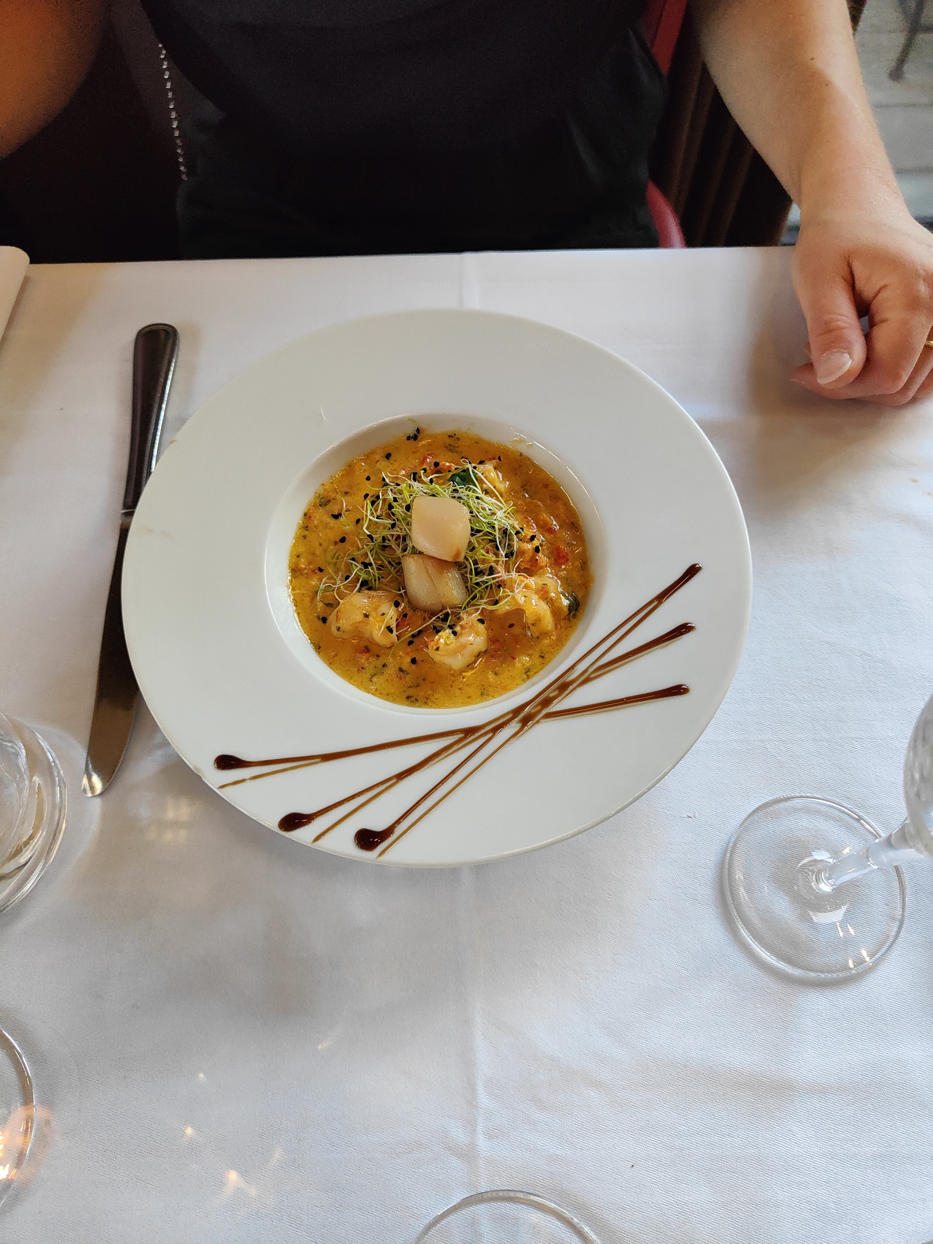 Très déçu par cette adresse. Même si l'équipe est très accueillante et sympathique cela ne rattrape pas la qualité des mets et boissons. Concernant la nourriture: l'entrée avait un vrai problème d'assaisonnement, le plat était fade et sans saveur, dommage pour des Saint Jacques et langoustines. Le plat ( risotto et gambas) était raté, le risotto détrempé, notamment. Le dessert était a l'inverse plutôt frais et agréable Les boissons sont hors de prix pour une qualité médiocre. Le vin conseillé par le patron était une affreuse piquette qui grattait et piquait la gorge Le service, ultra rapide entre l'apéritif et l'entrée, s'est soudainement ralenti, au point d'attendre presque une heure pour avoir le plat. A se demander si ce n'est pas une manœuvre pour nous faire consommer des boissons. Bref, très dommage car la promesse était attractive dommage que la résultat en soit a ce point éloigné. Il y a dans la région de bien meilleures tables qui sont moins cher