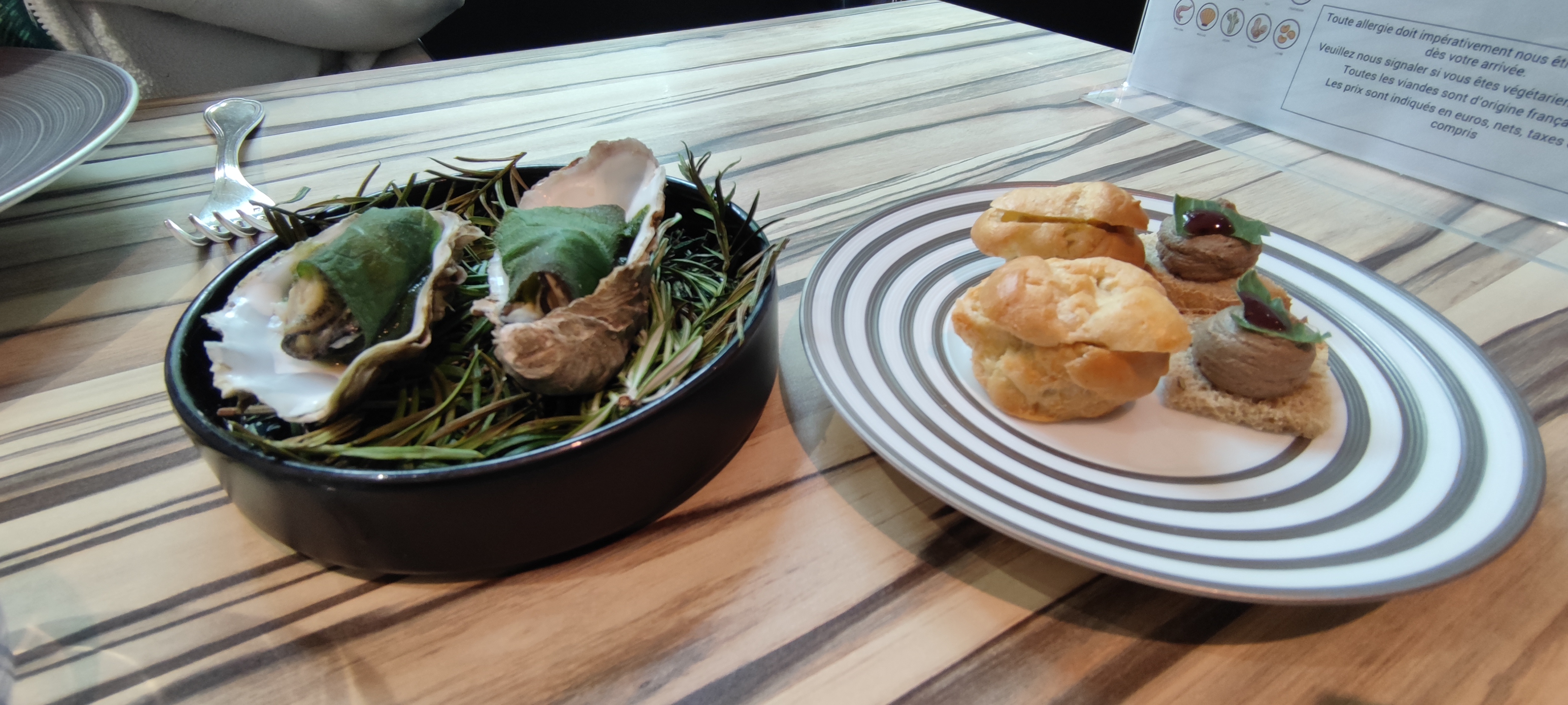 Un peu déçu, cher pour la prestation. menu à 33 euros, pas de choix, lentilles en entrée et lentilles en accompagnement du plat d'un poisson blanc ordinaire. Des assiettes noires pour l'entrée, c'est un peu démoralisant. Les serveurs en jean et t-shirt siglé marques américaine, bof ! Les couverts en métal argenté, cela en jette mais pas terrible dans la bouche. Le vin est bon mais cher. Quand au dessert je regrette mon choix de la glace fumée, cela sent le poisson. M.