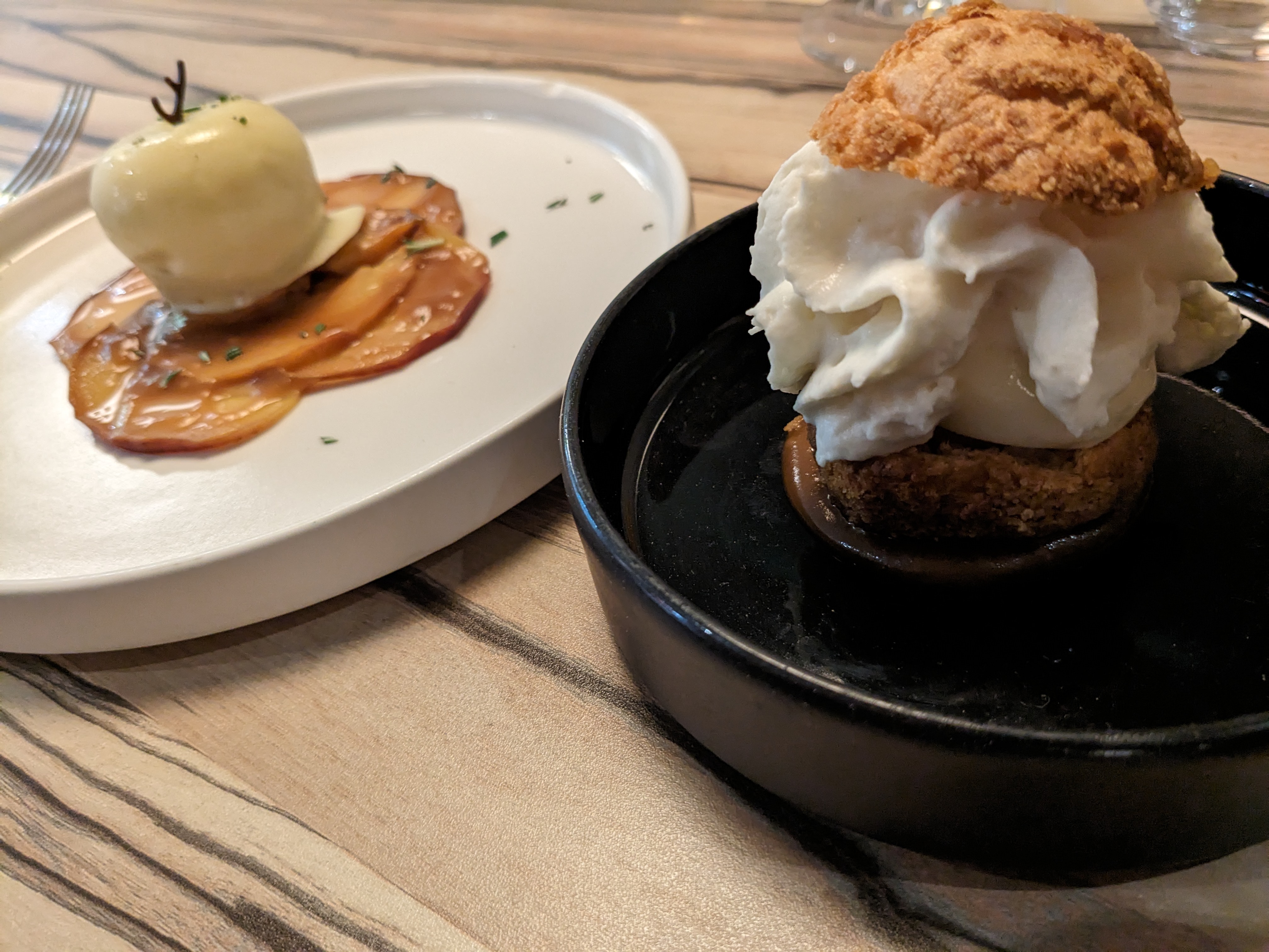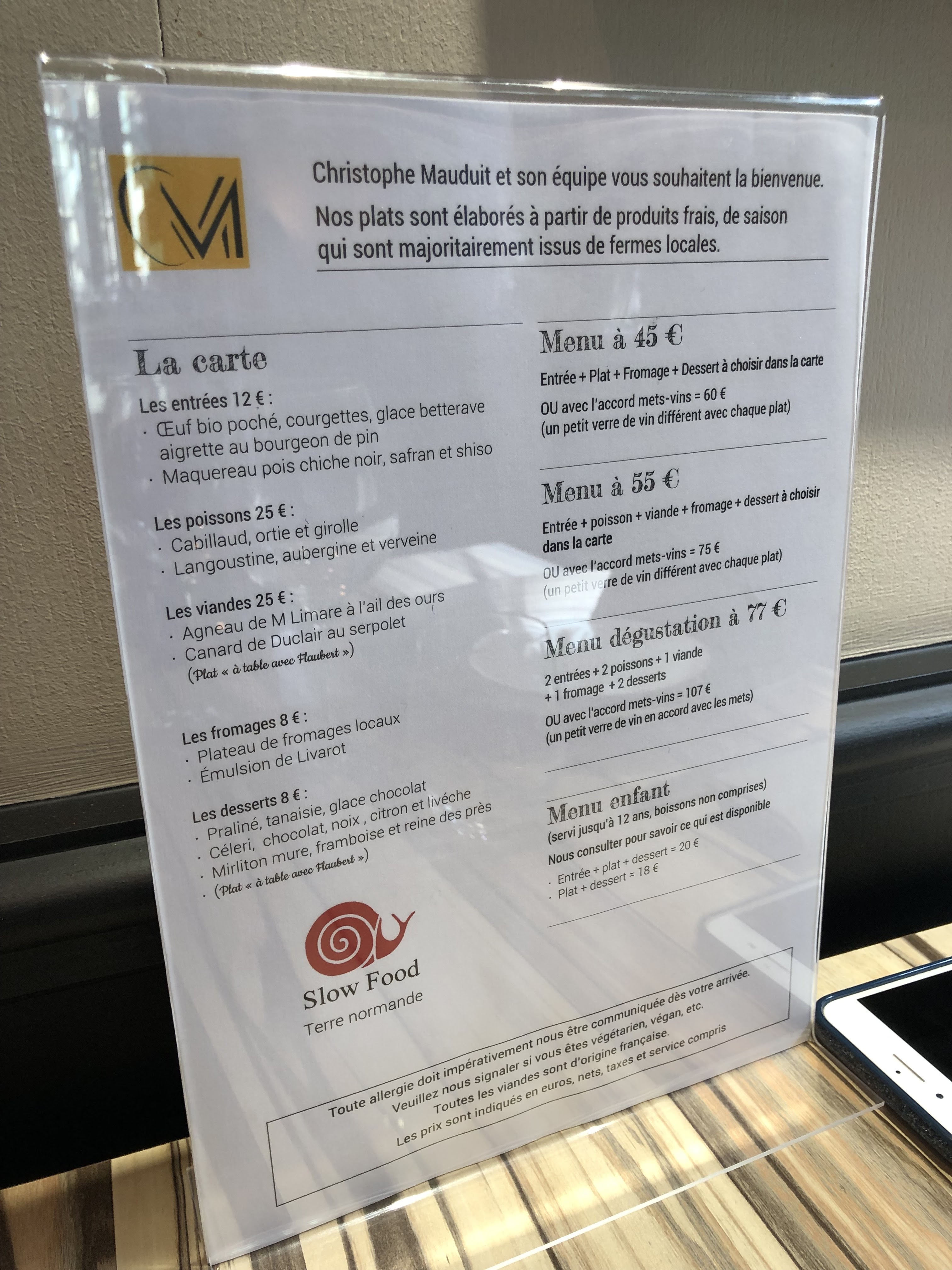 Plats originaux et savoureux avec de très bon produits : - Maquereau en entrée : chips d'arrêtes innovantes et délicieuses - Poisson bien cuisiné et présenté - Emulsion de Livarot à goutter absolument - Accord met / vin pas toujours parfait et mériterait un peu de rigueur - Service très sympa - Couverts Christofle magnifiques
