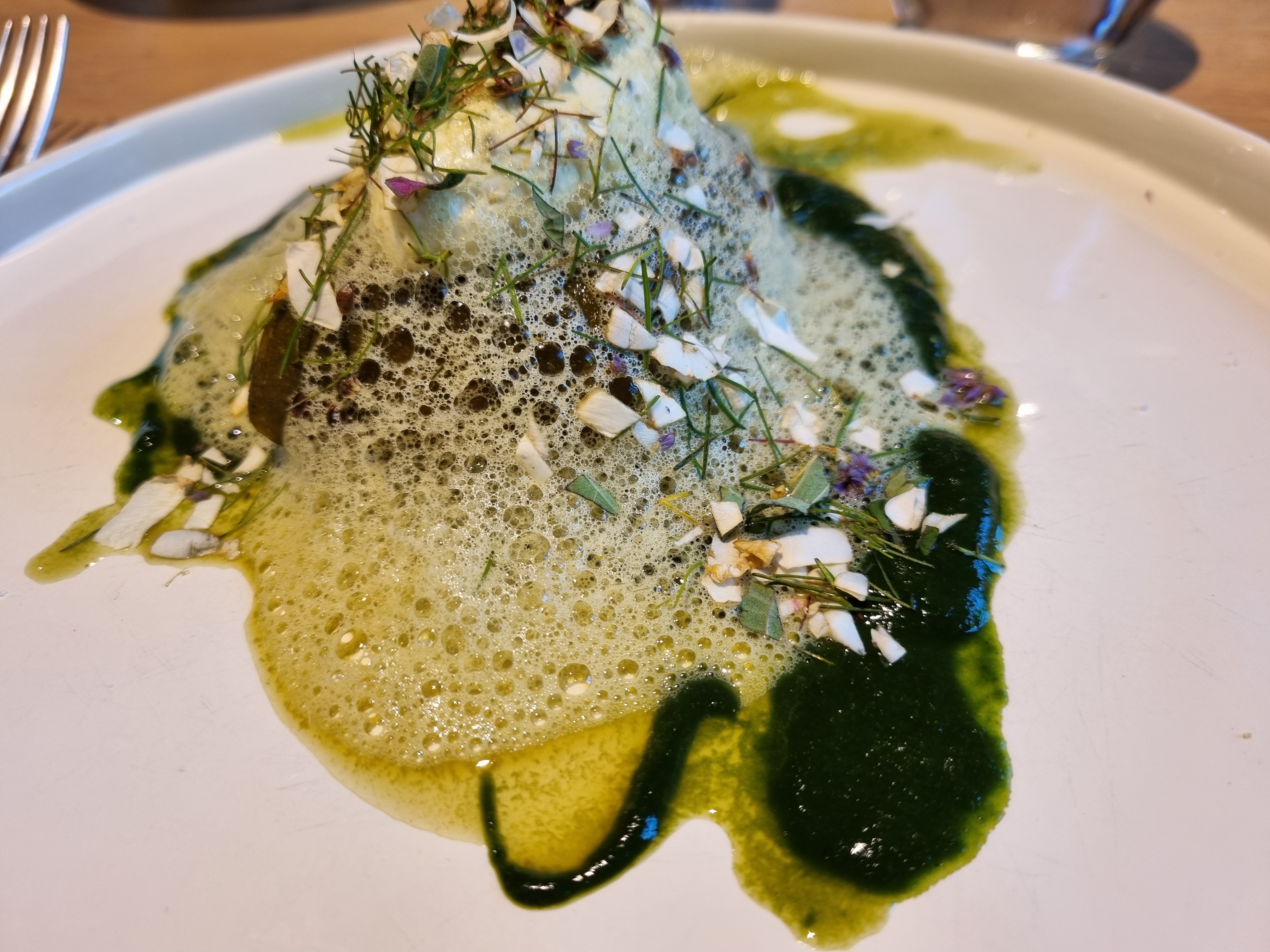 Bel endroit et service très agréable. Pour les plats, le concept d'utiliser au maximum des plantes (orties, primevère etc...) et les produits locaux est intéressant mais ne nous a pas convaincu. La présentation est jolie mais nous avons été déçus par le goût.