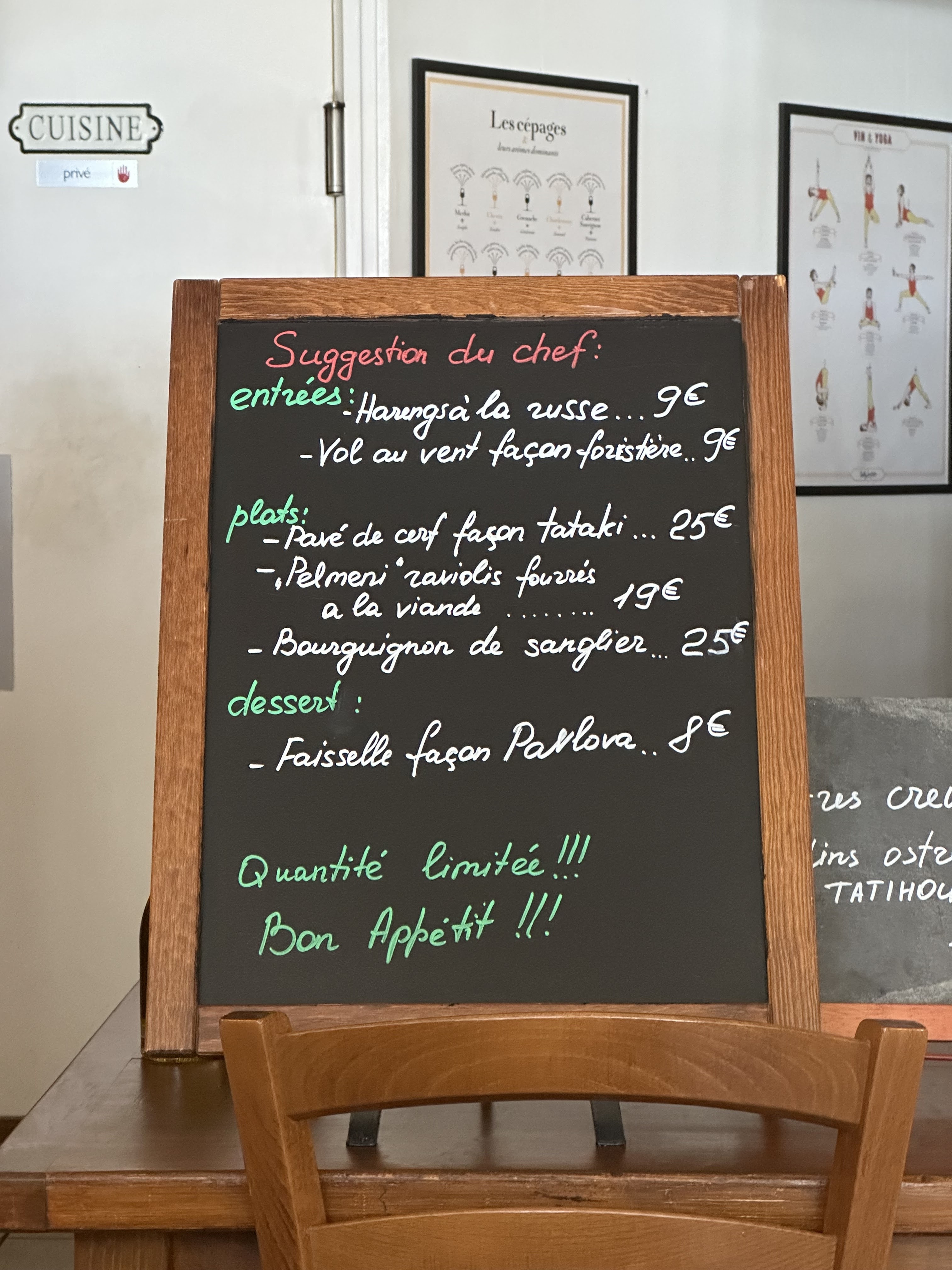 Posté le 30/12/2023 à 06:30" Très savoureux, le menu comprend des boulettes et du hareng, les plats français sont très savoureux, nous avons mangé de la fondue, des escargots, des viandes diverses, des desserts, j'ai vraiment tout aimé. La fille russophone Galina a servi, elle était très agréable et nous a aidé à comprendre ce qu'il y avait au menu, une atmosphère chaleureuse et un excellent service. Je recommande 💯"