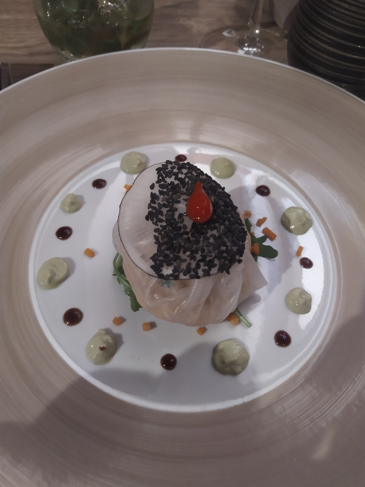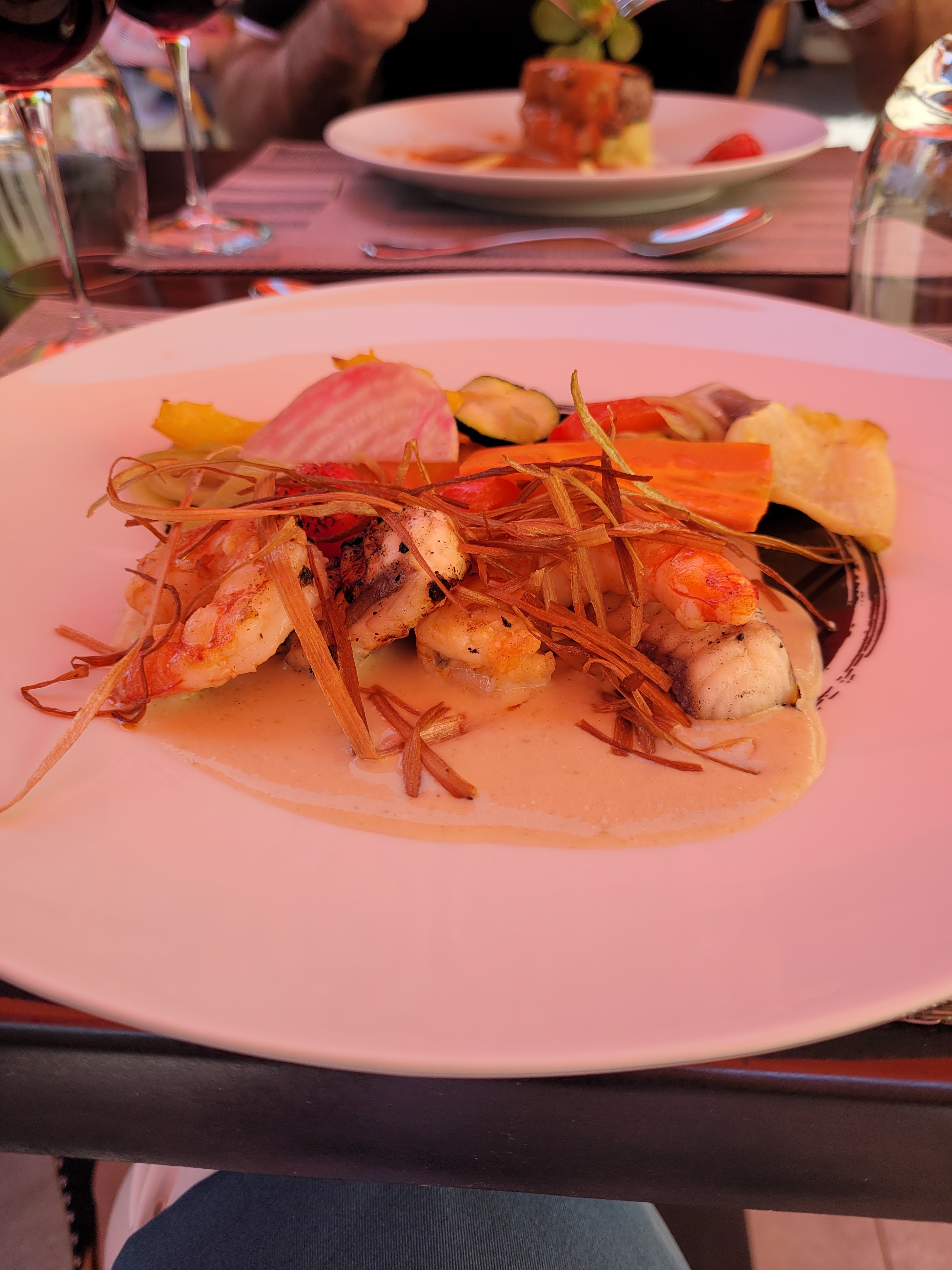 Terrasse très agréable, très bon service et assiettes très bien décorées,raffinées mais ayant pris la lotte je trouve qu'on la cherche un peu dans l'assiette.. Je ne mange pas beaucoup mais c'est vraiment peu pour quelqu'un qui mange normalement....
