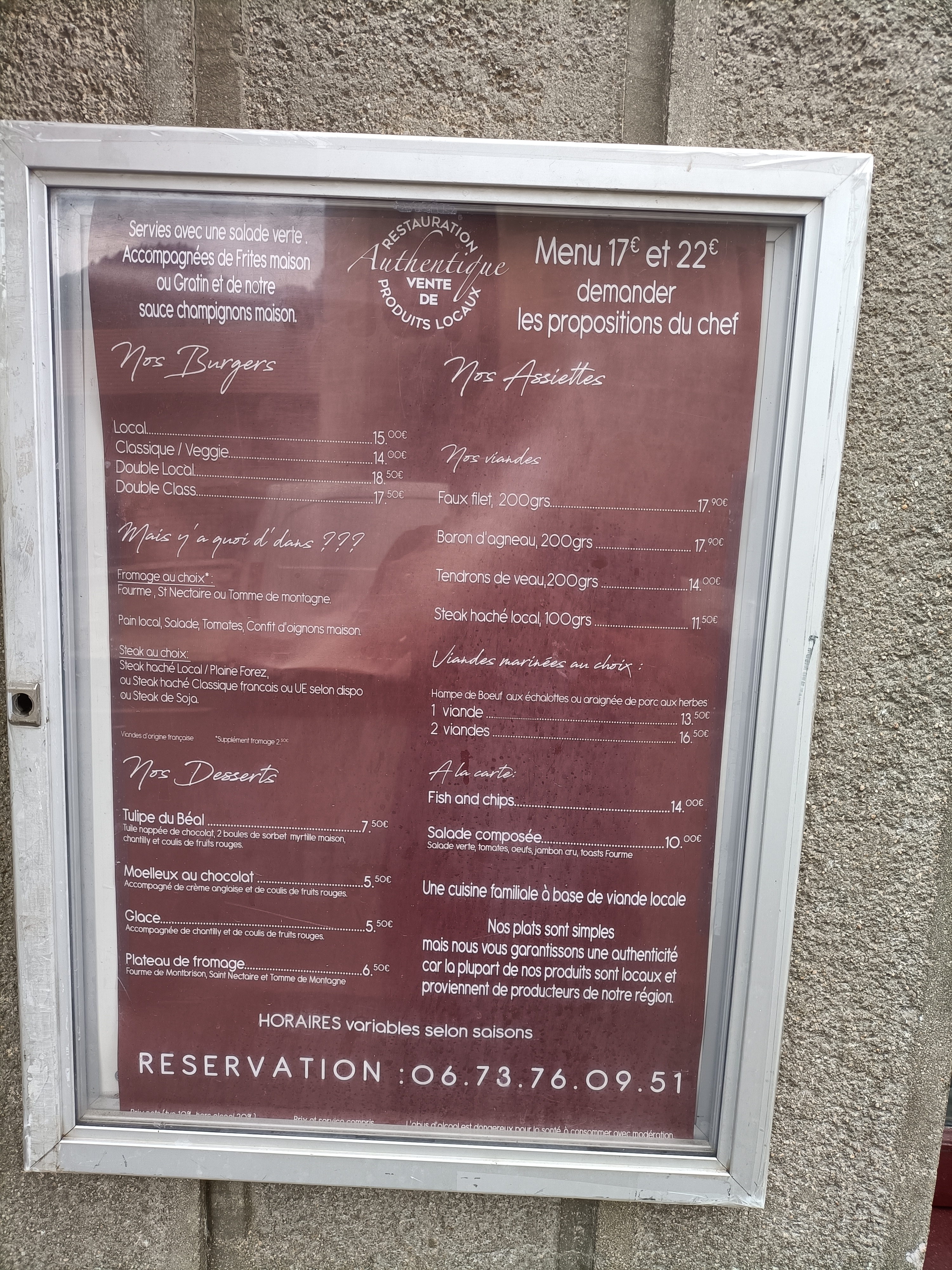 Posté le 15/02/2018 à 20:38"Après une demi journée de ski et vu le monde aux restaurants à la station de ski, nous avons décidé de tenter notre chance dans ce restaurant qui vend aussi des produits locaux (bières, alcools, sirops, bonbons,...) Très simple et sans prétention mais on y fait vraiment attention quant à la qualité de la viande et des produits en général. Accueil parfait, sourire et bonne ambiance garantis! Le rapport qualité prix est imbattable. Nous vous conseillons le burger à la fourme de Montbrison."