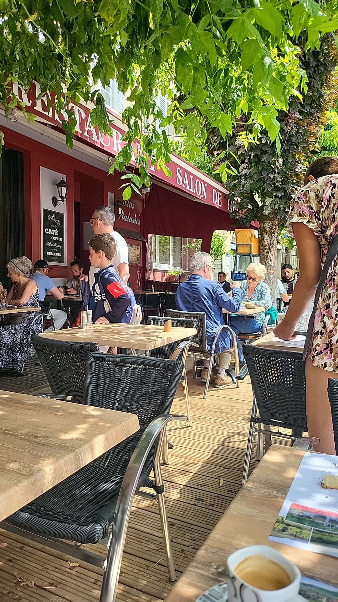 Des plats généreux et de bonne qualité à l'ombre des platanes avec un service efficace.