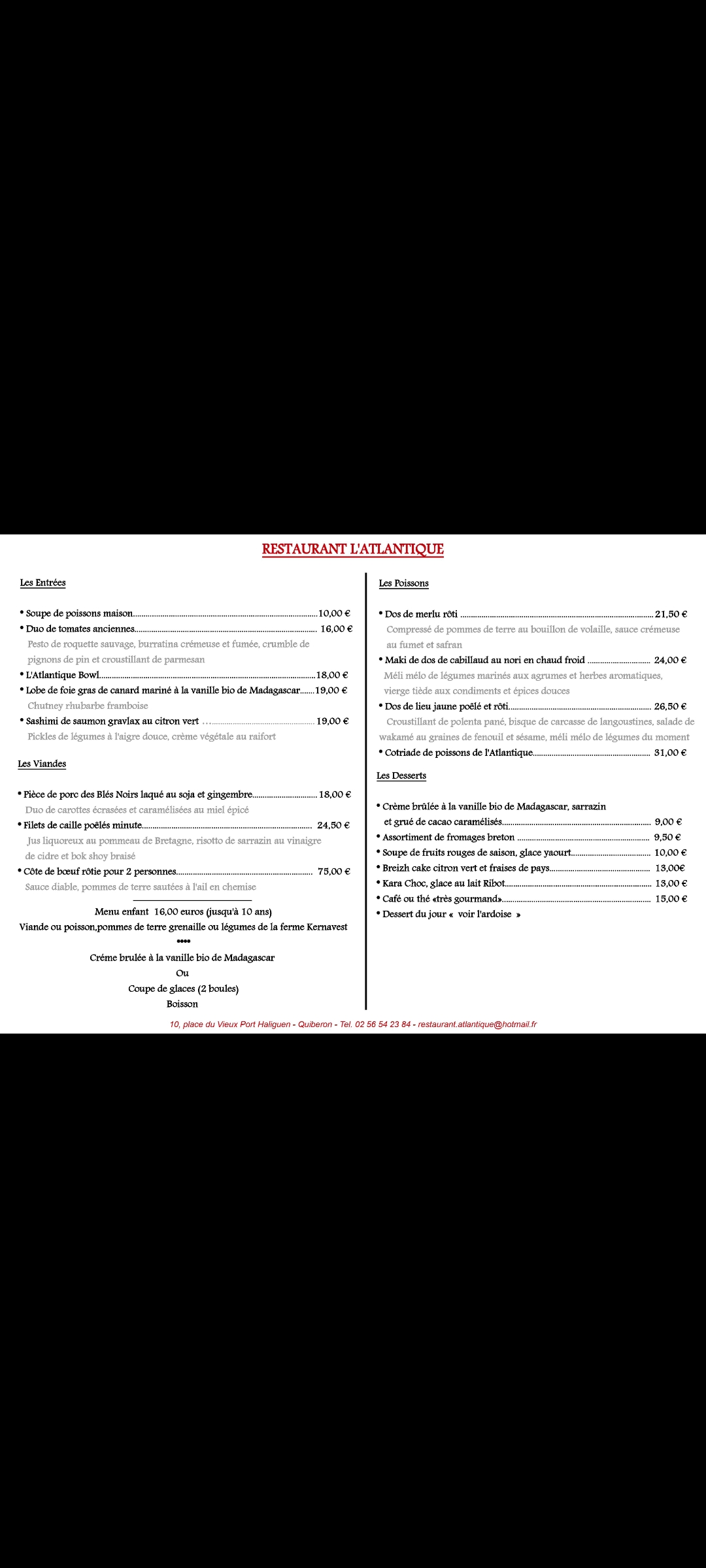 Nous avons pris une table pour dîner le 22/09/2021, pour ma part j'ai pris une soupe de poisson et un plateau de fruit de mer pour une personne ma compagne a pris une soupe de poisson et une assiette de poisson du jour (lieu noir). La soupe de poisson était bonne, mais il manquait du fromage, j'ai demandé à la serveuse, elle est revenu quelques minutes après et elle me dit qu'il est impossible d'avoir du fromage râpé avec ma soupe. Tant pis Le plateau de fruit de mer était frais et bon, hormis les amandes qui n'était pas très bonne. Le lieu noir était bon mais il manquait de la quantité dans l'assiette. Il y avait également un petit rectangle de pomme de terre qui était insuffisant. La corbeille de pain était bonne et heureusement qu'elle était là. Nous n'avons pas voulu prendre de dessert. Nous avons demande l'addition à 20h41. Au moment où j'écris cet avis, il est 20h53 et je n'ai toujours pas l'addition malgré une relance à 20h50. J'en profite pour écrire cet avis. La considération pour le client n'est pas excellente étant donné le prix des plats on pourrait s'attendre à mieux. Je vous conseille le petite bar / restaurant en face qui s'appelle LE CAFÉ DU MIDI. l'accueil y est chaleureux et convivial. Le prix est très raisonnable pour la quantité et la qualité. Il est 20h56 et je me déplace au bar pour demander l'addition. Le serveur nous tend le terminal, nous payons la somme de 75€. Il se retourne et part sans dire au revoir. Nous croisons la serveuse qui ne nous dis pas également au revoir. Il s'agit du premier avis que je rédige sur Google et pour l'occasion j'ai créé un compte. En conclusion je vous conseille le café du midi situé en face pour passer une bonne soirée et bine manger. À l'inverse rendez vous au restaurant l'Atlantique si vous souhaitez être snobé. Par chance un ami travaille au guide Michelin, je vais lui conseiller de se rendre dans les deux établissements et de faire son propre avis.