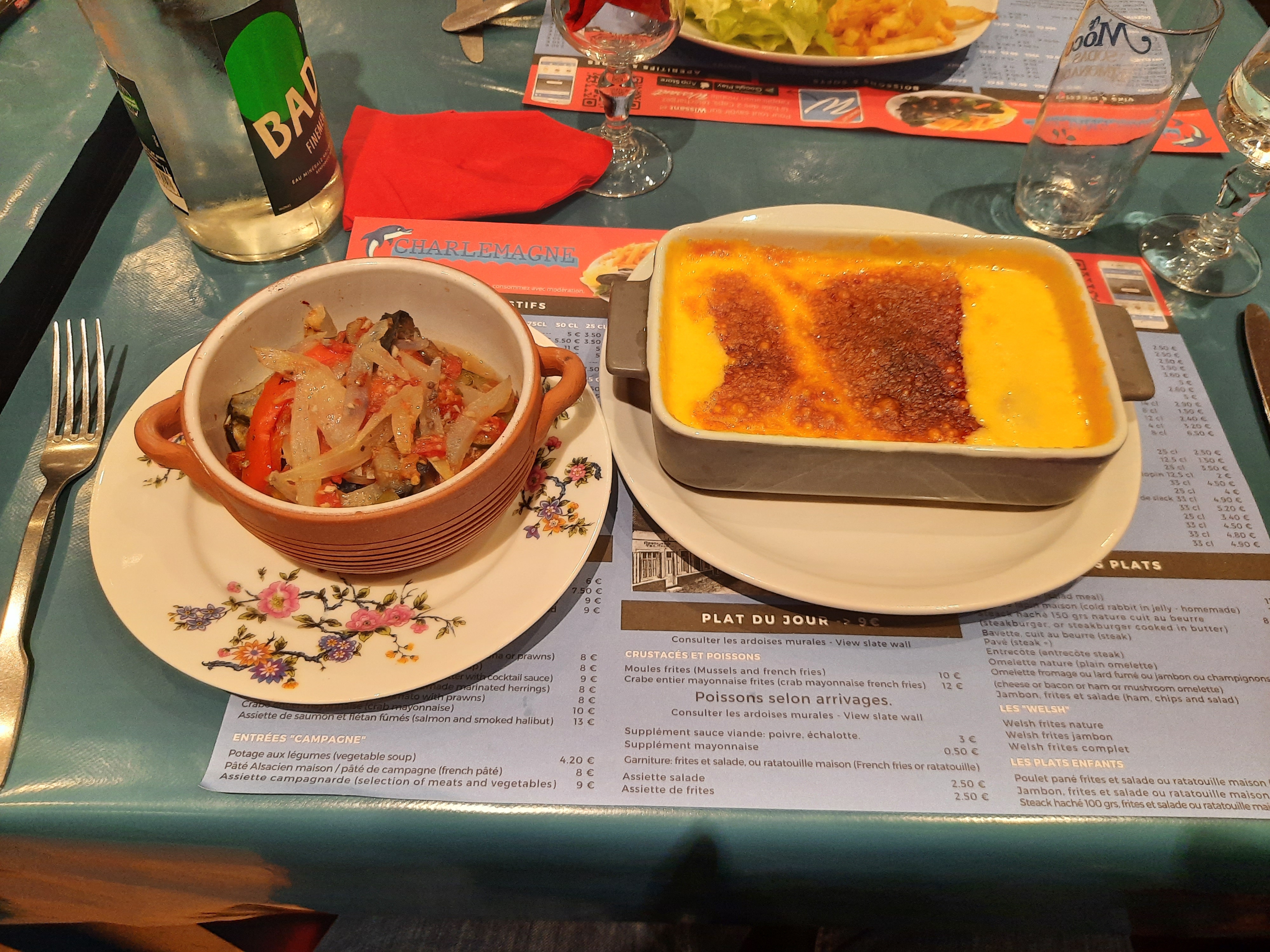 Premier placement a côté des cuisines très bruyant nous avons demandé a changer de place le temps d'attente pour la commande était très long 30 minutes pour un poisson et moules frites . Le poisons vendu comme frais ne l'est pas c'est du surgelé les moules sont corrects mais je vous déconseille le supplément crème et ail car cela rajoute beaucoup de sel au plat celle du haut ne le sont pas mais celle qui baigne dans la sauce sont immangeable . Cependant La ratatouille est bonne. Le prix est un peux décevant au vu de la qualité ainsi que de l'amabilité des serveurs.