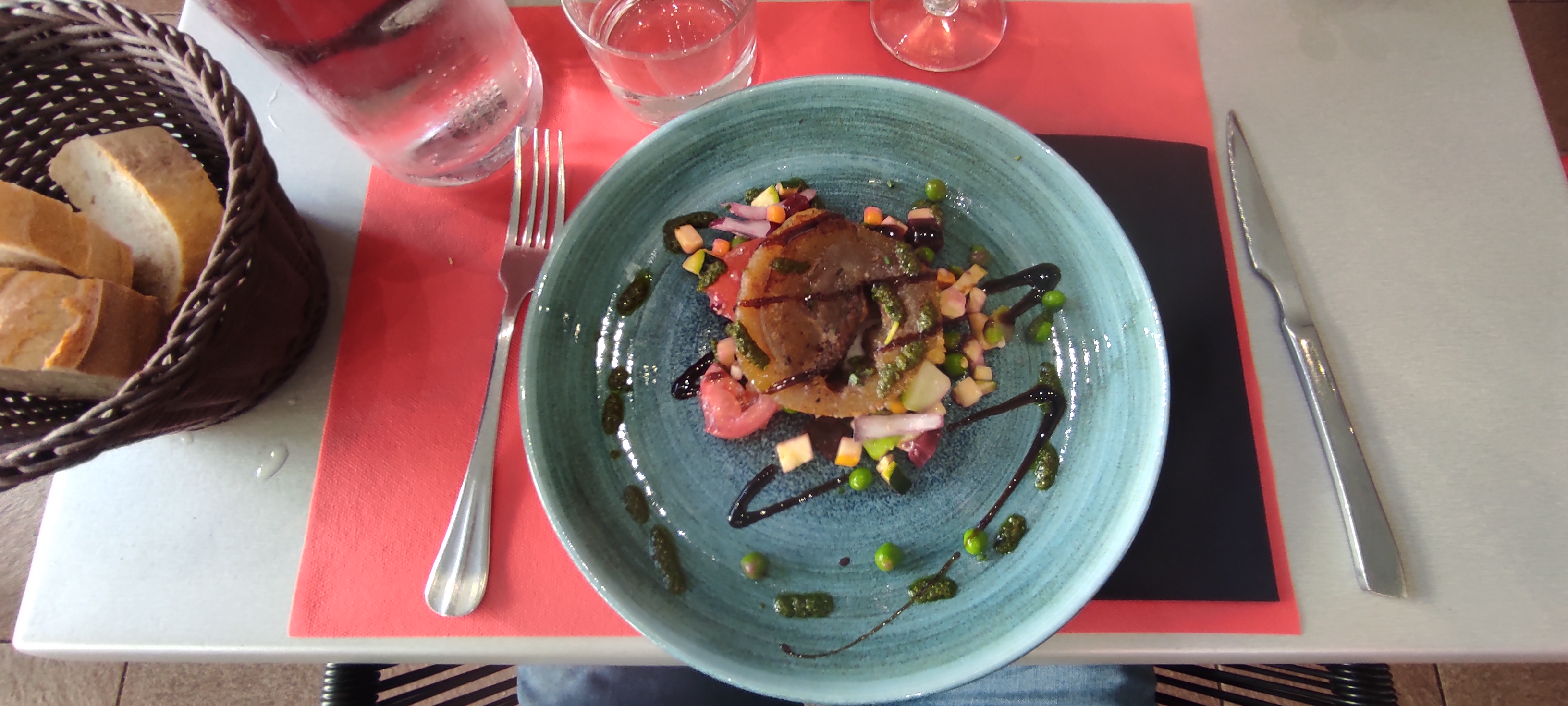 Nous avons très bien mangé : pâtes aux petits légumes, gambas grillées et petits légumes ainsi que le pied de porc croustillant confit et désossé
