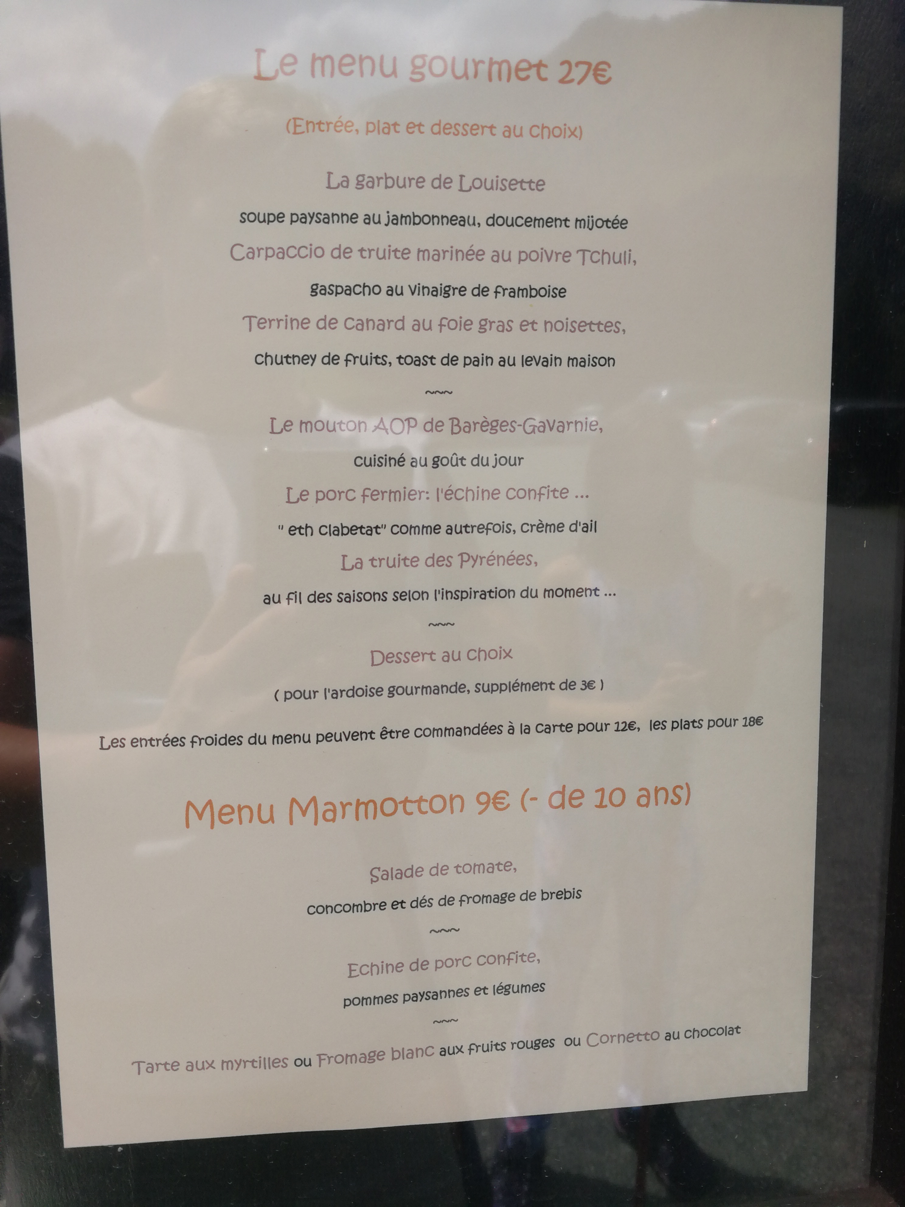 Simplement un cadre unique! Ensoleillé mais il ne fait pas trop chaud. Le menu enfant pour 10€ comprend entrée,plat et dessert et la quantité ne fait aucune ombre à la qualité. Le menu à 30€ comprenant l'entrée, le plat et le dessert vaut vraiment le coup. La garbure en entrée est très bonne et ouvre bien l'appétit. Ensuite vient le mouton AOP de Barèges qui est sans doute l'un des meilleurs voire le meilleur que j'ai mangé de toute ma vie. Et pour le dessert, il n'y a aucune hésitation à avoir. Prenez la tarte aux myrtilles ! Plus qu'une simple tarte aux myrtilles : la pâte est excellente, la fine couche de chocolat se fait justement remarquer, et la feuille de menthe sur le dessus vient s'ajouter comme comme la cerise sur le gâteau. En conclusion, un repas que vous n'oublierez pas de si tôt. Idéal pour une occasion unique en famille.