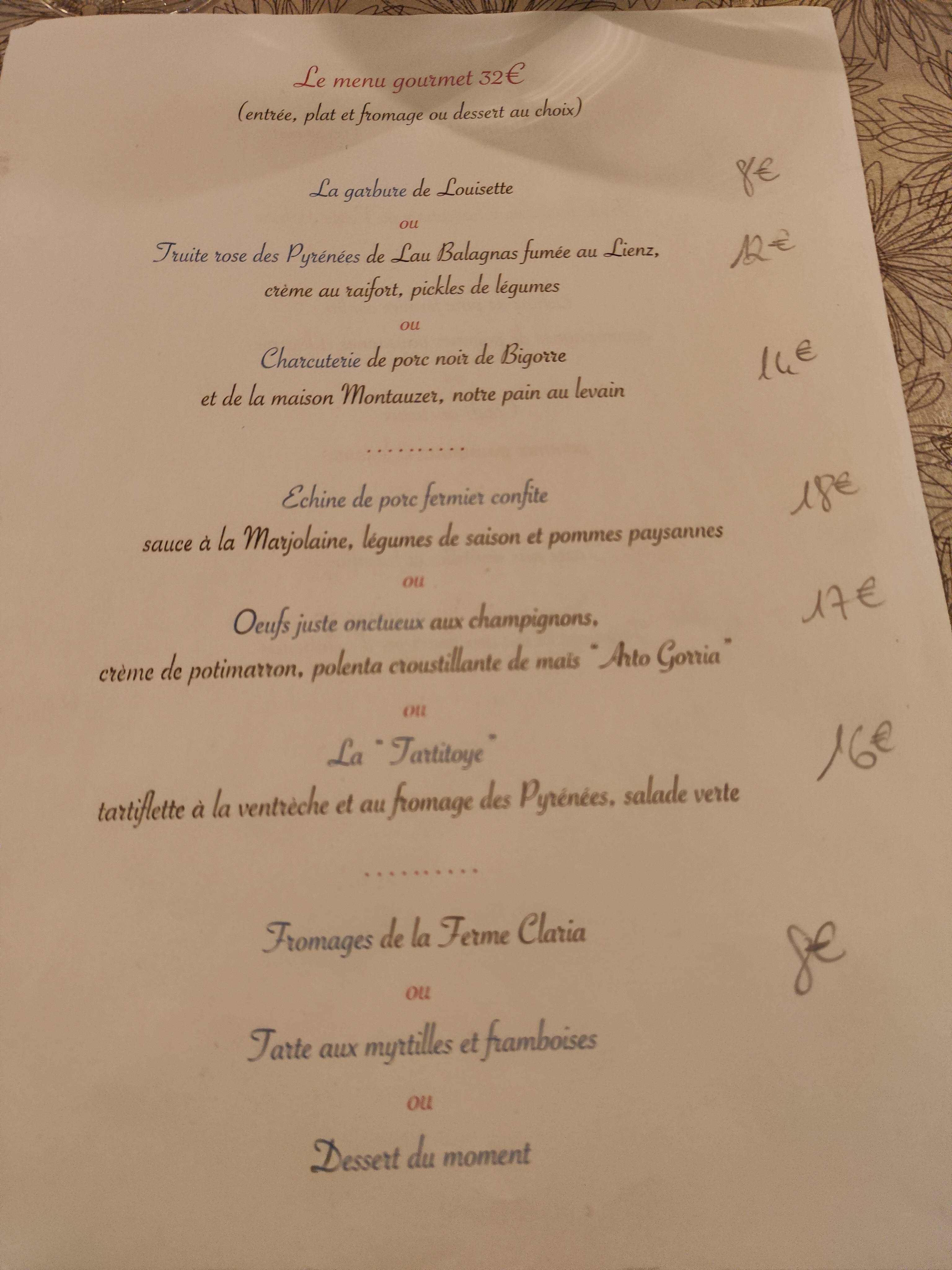 Garbure mauvaise avait goût de rance et la viande dure à mastiquer. La truite pas bien vidée car il reste un boyau de me.... L' attente un peu longue. Le prix trop cher pour le repas pris à la carte ainsi que le verre de vin. Déçue !!!