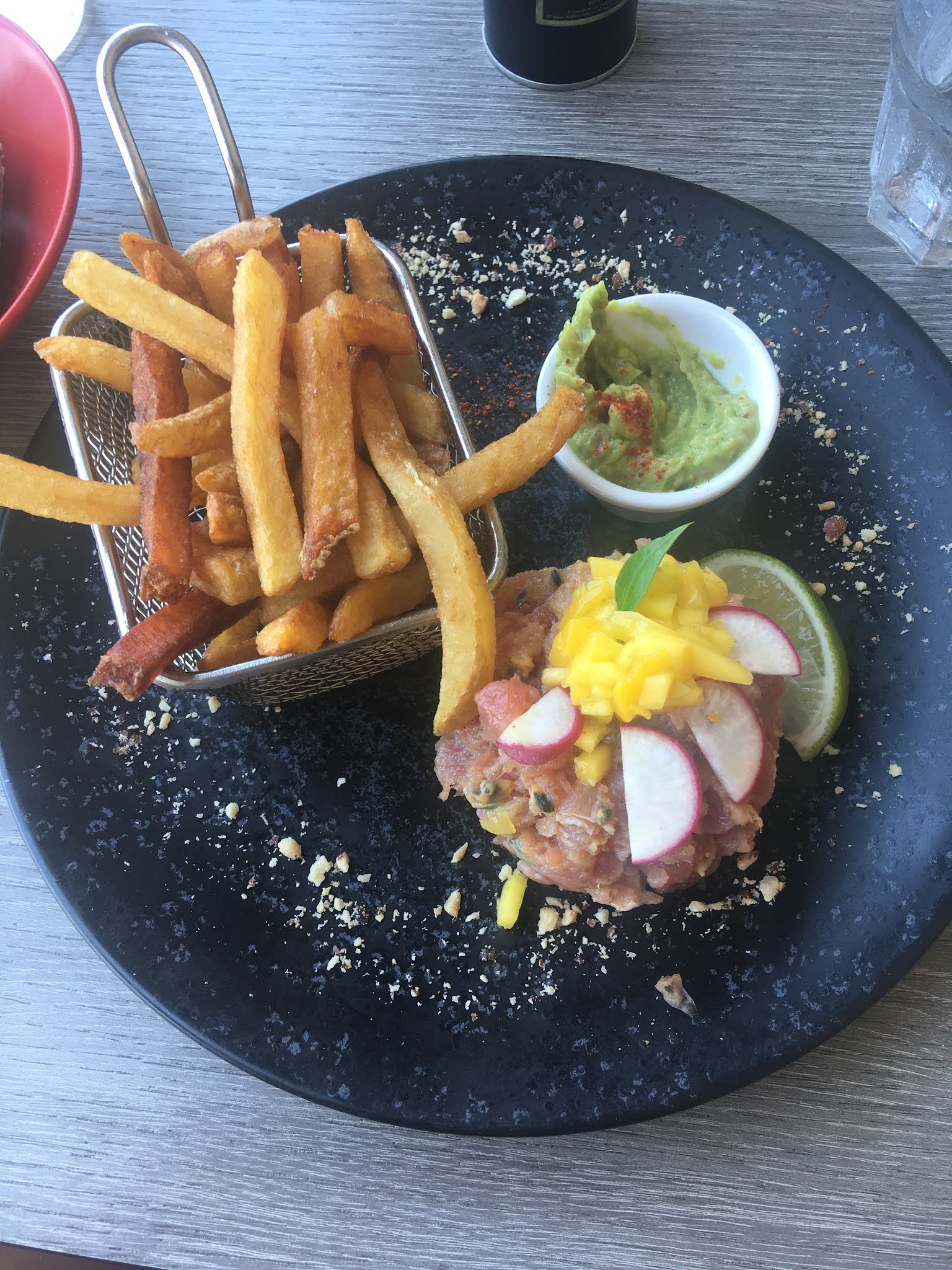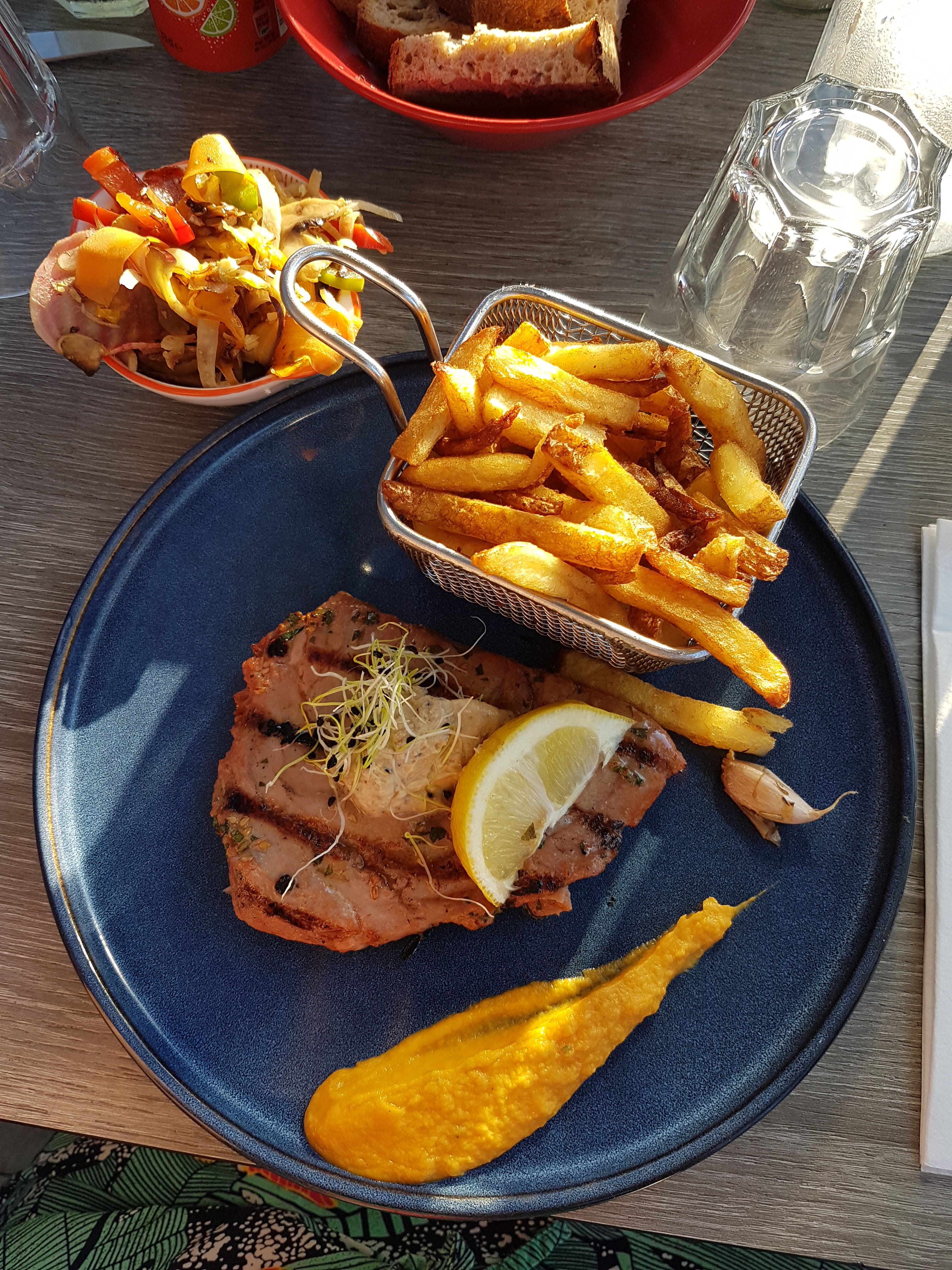 Excellent Thon, très bon, bien cuit, malheureusement sans sauce du coup sec, dry! Cela reste cependant un excellent endroit que je recommande vivement ! Notre commande avait été oubliée par erreur, quand ils s’en sont rendus compte ils nous ont offert une entrée rapide pour combler notre attente. Smart move !