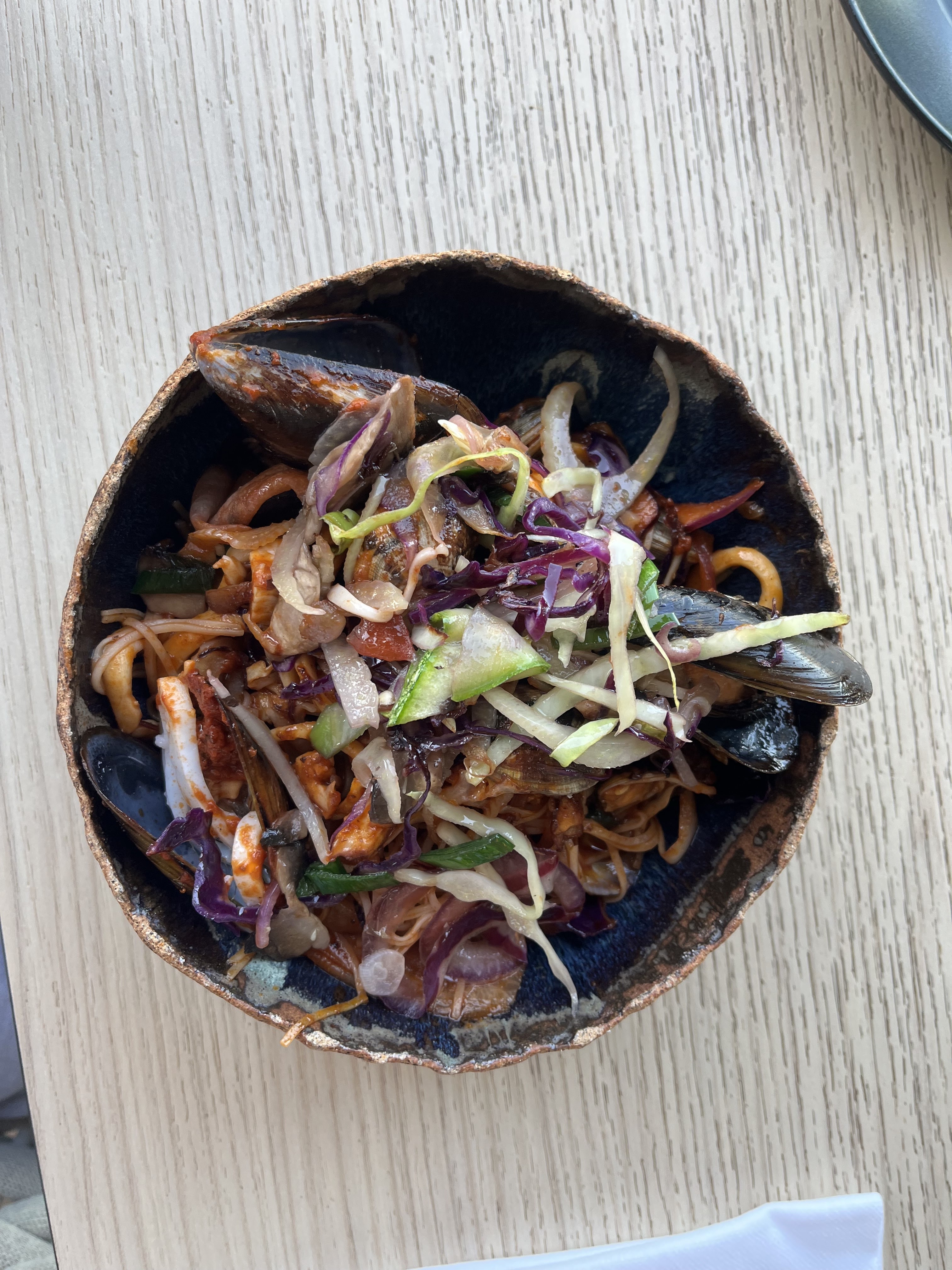 Un endroit très agréable ! Malgré le fait que le restaurant était plein, le chef nous a tout de même arrangé une super table avec vue sur la mer. Nous avons commandé un burger et un wok, tous deux avec des fruits de mer. Le burger avec le pain à l'encre de seiche était délicieux ! Le wok aussi, mais plutôt inhabituel. Le personnel était très sympathique et s'est bien occupé de nous. Les prix sont assez élevés, mais très justifiés car la nourriture est de bonne qualité. Je recommande à tous ceux qui passent par ce village de visiter ce restaurant.