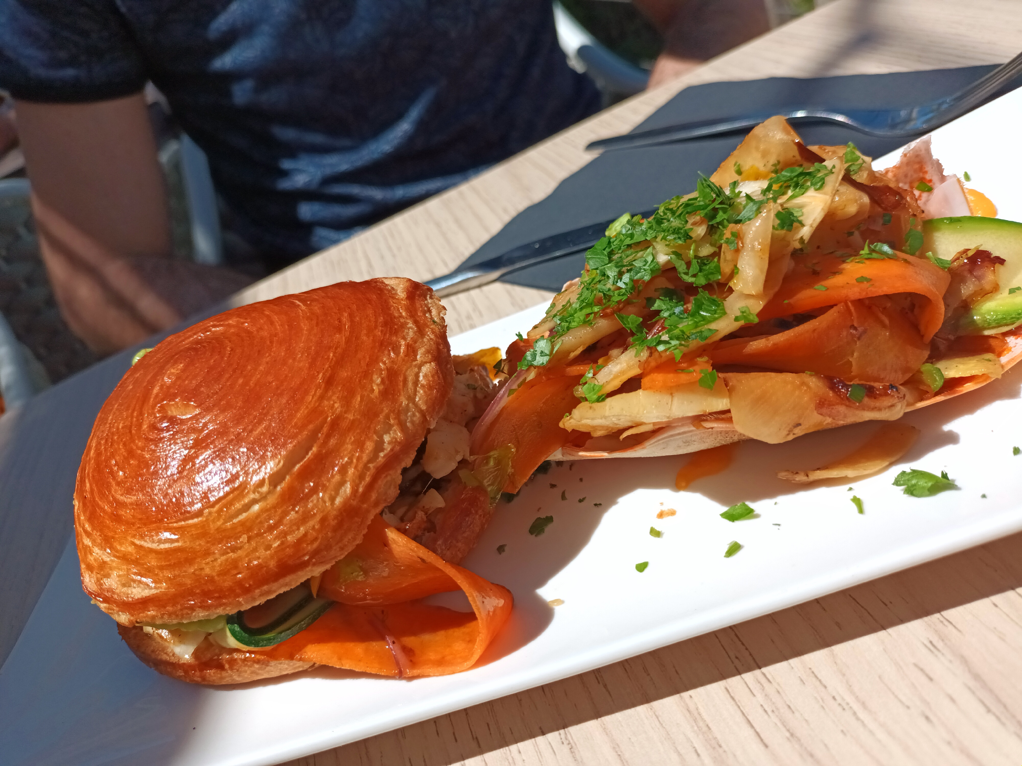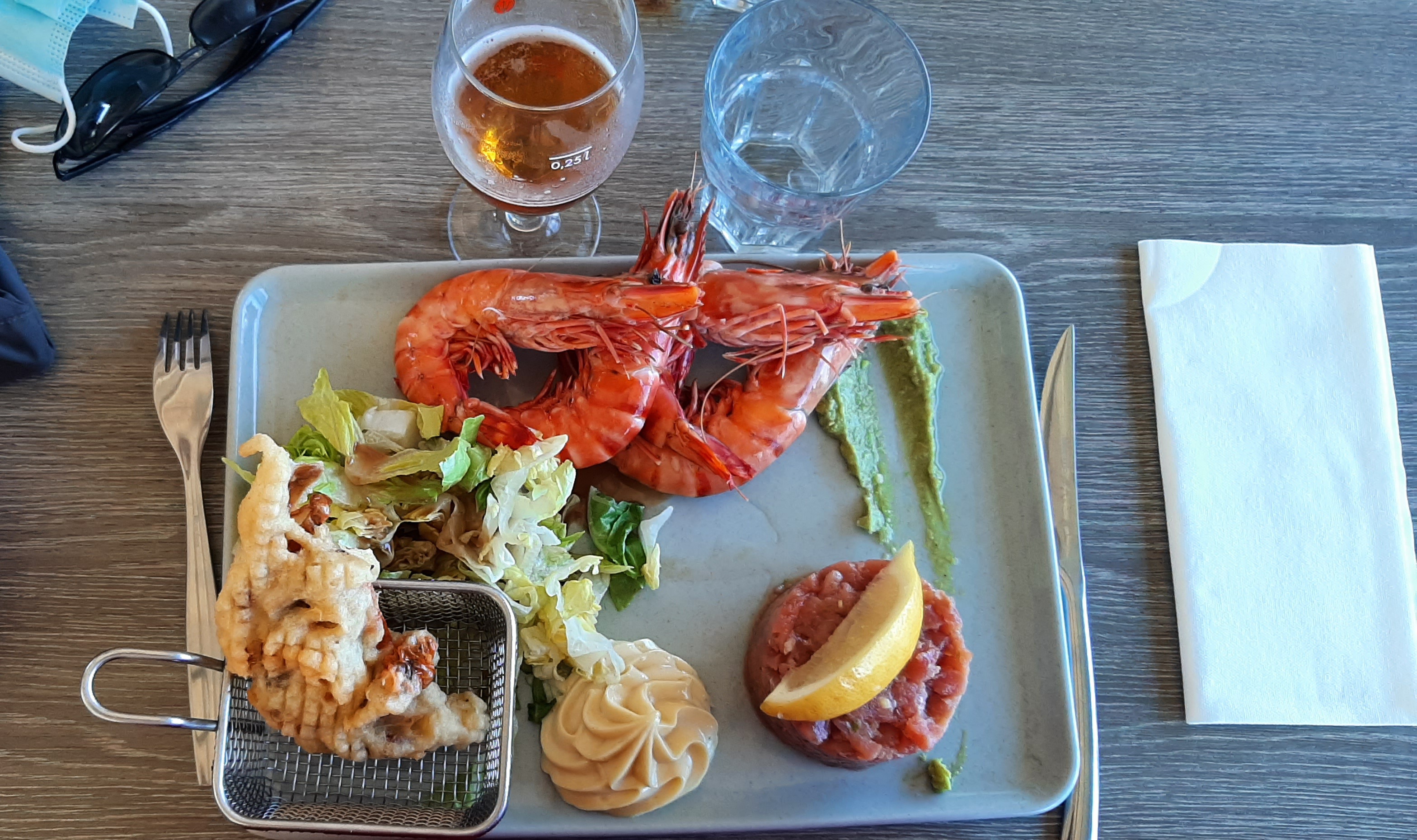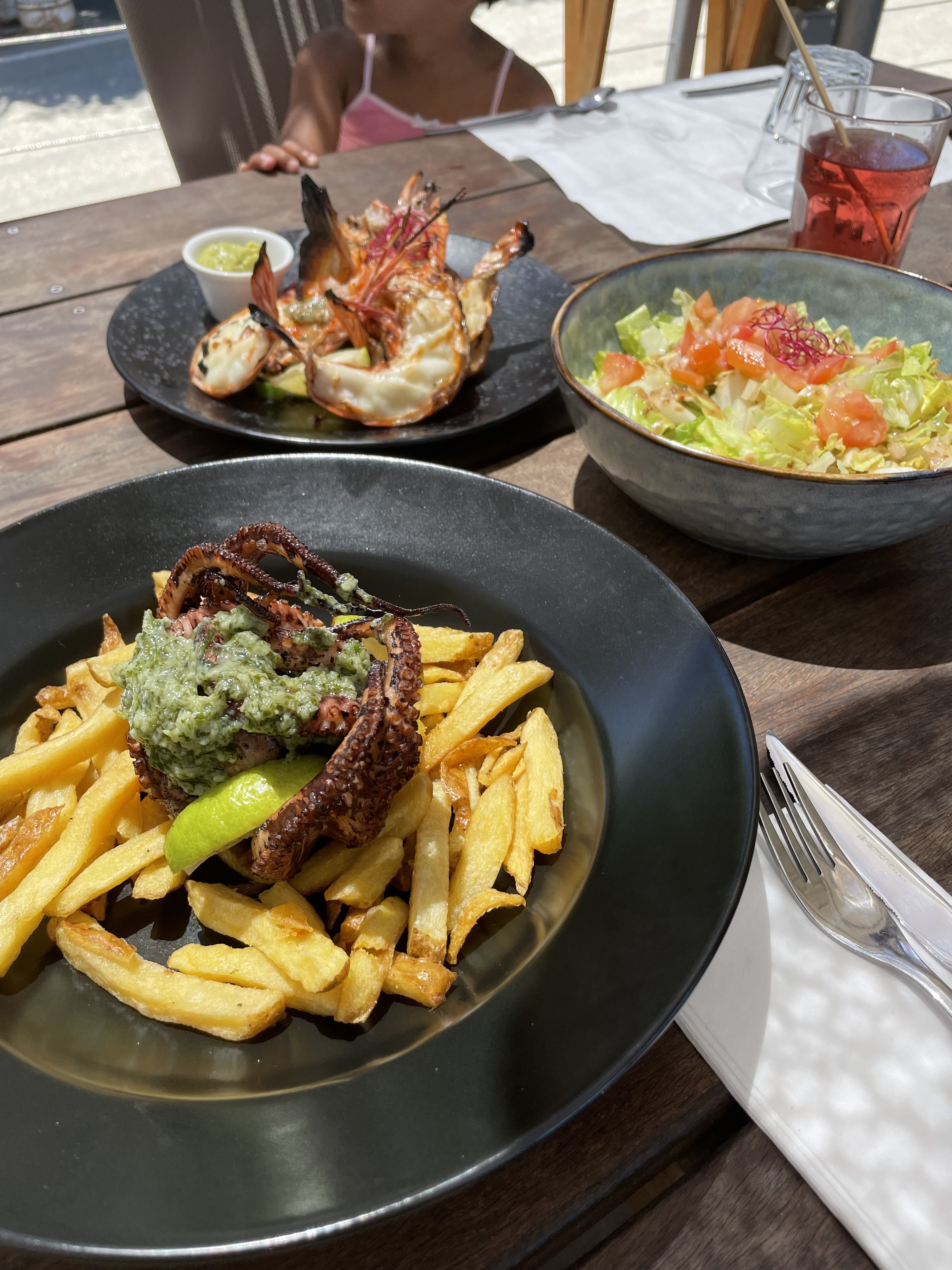 Très bon moment. Un plateau surélevé sur la plage pour manger une salade d'araignée au top !