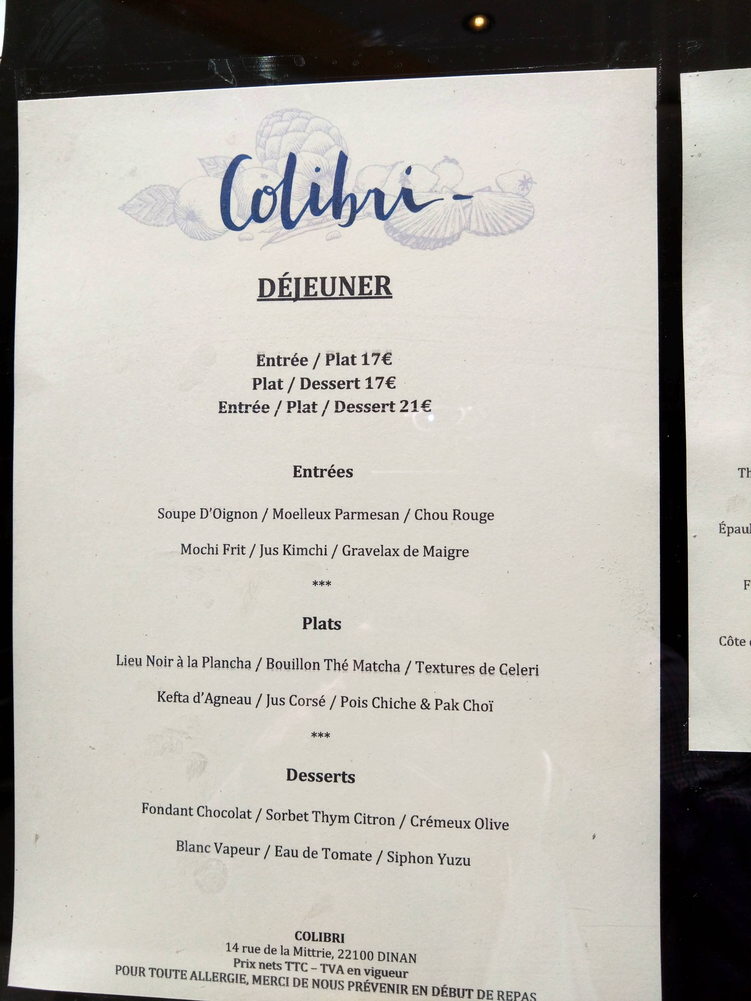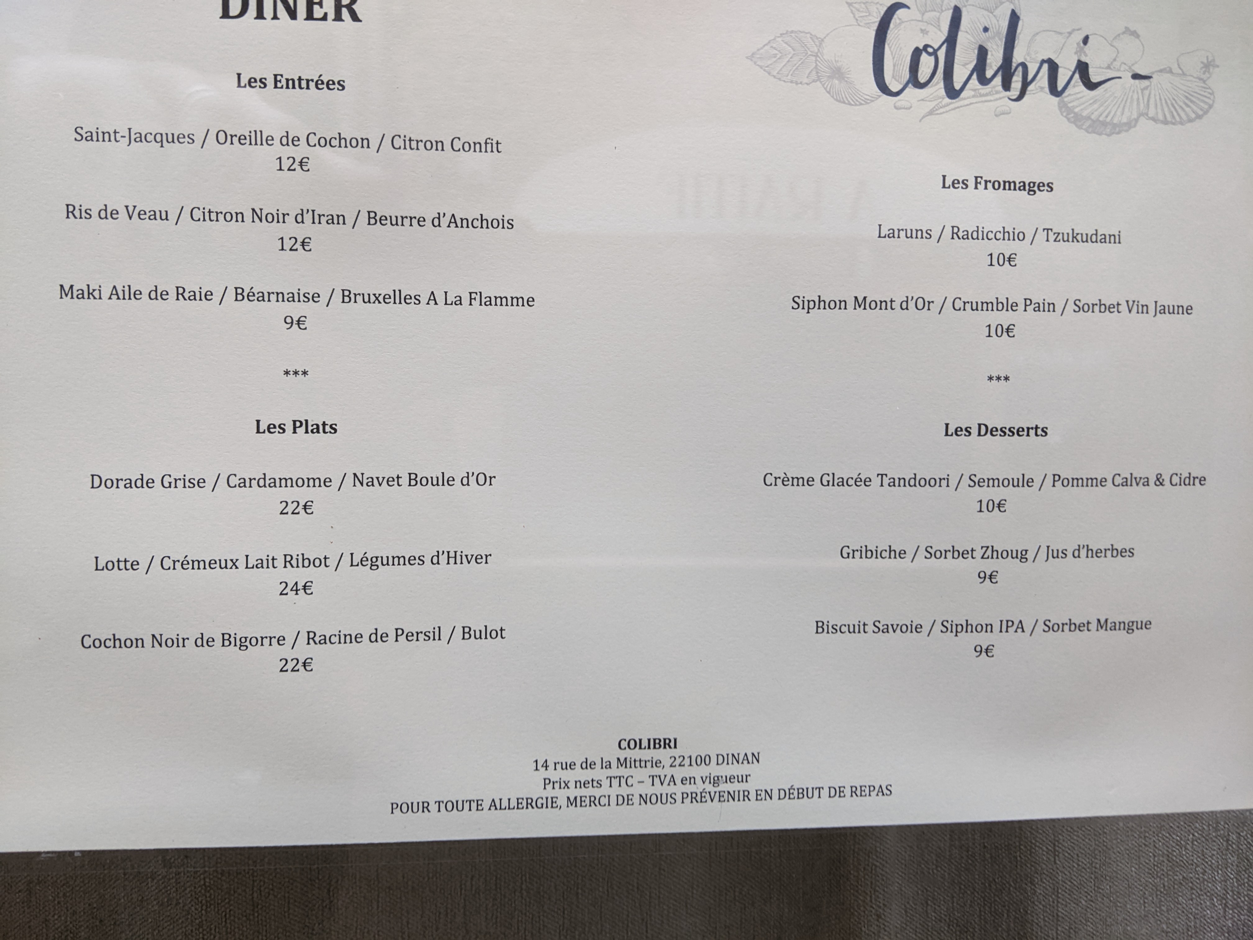 Excellent établissement, acceuil, service, cuisine atypique et très très bonne cuisine, le mariage des saveurs, la finesse des assiettes, les cuissons parfaites. Tarif abordable. On peut y aller les yeux fermé. Bravo à toute l équipe 👏👍😉. Respect aux cuisiniers vu la taille de la cuisine, très petite ouverte mais une organisation exceptionnelle vu le qualité du résultat, bravo 👏🙏. C est un établissement que je conseille vivement. Si vous passez par Dinan, l arrêt au Colibri est fortement conseillé. Pour ma part, j y retournerai 👍