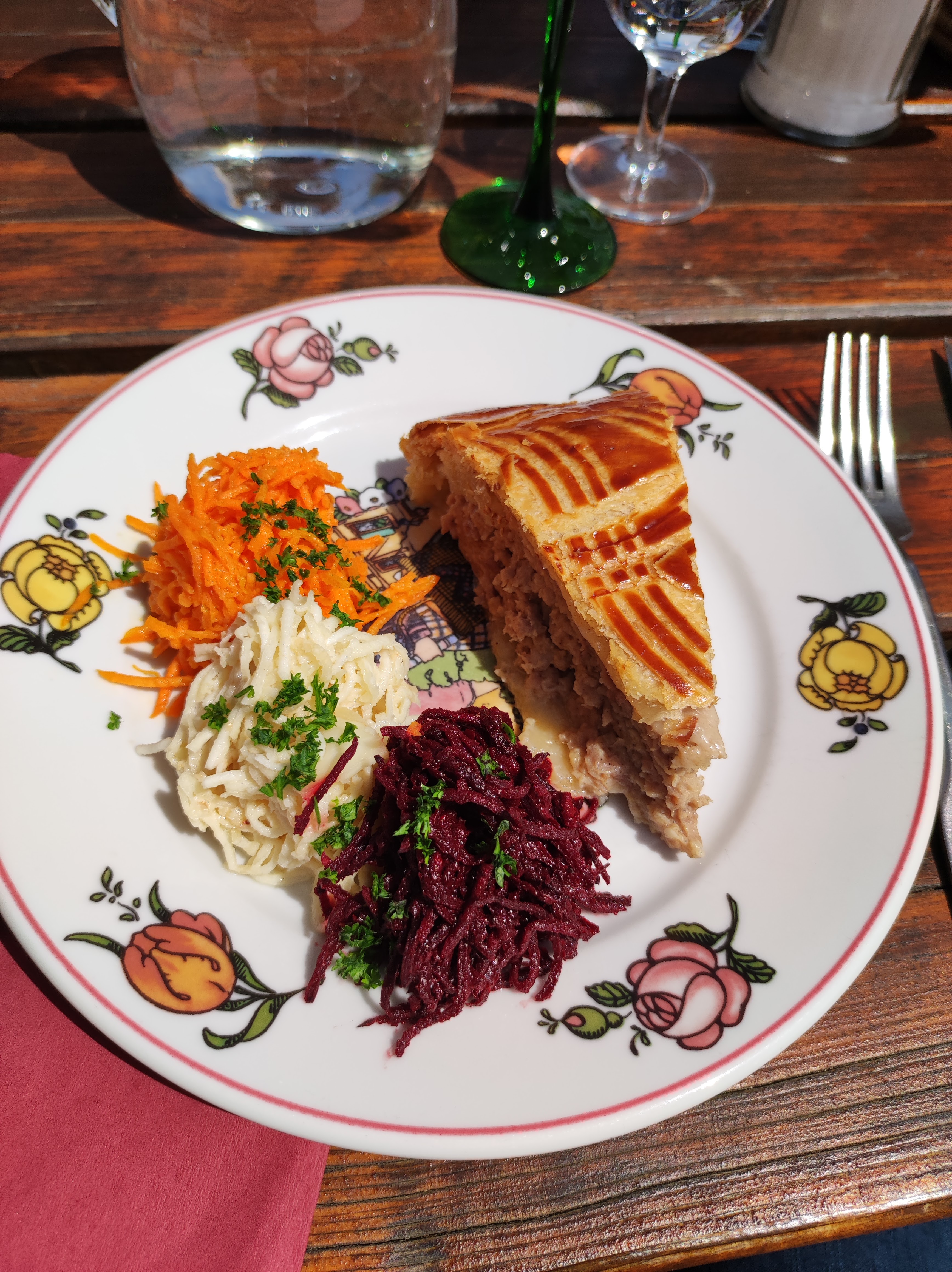 La tourte est excellente. Le lieu très sympa. Beaucoup de place en extérieur. La pinte de meteor a 5€ ça me semble raisonnable.