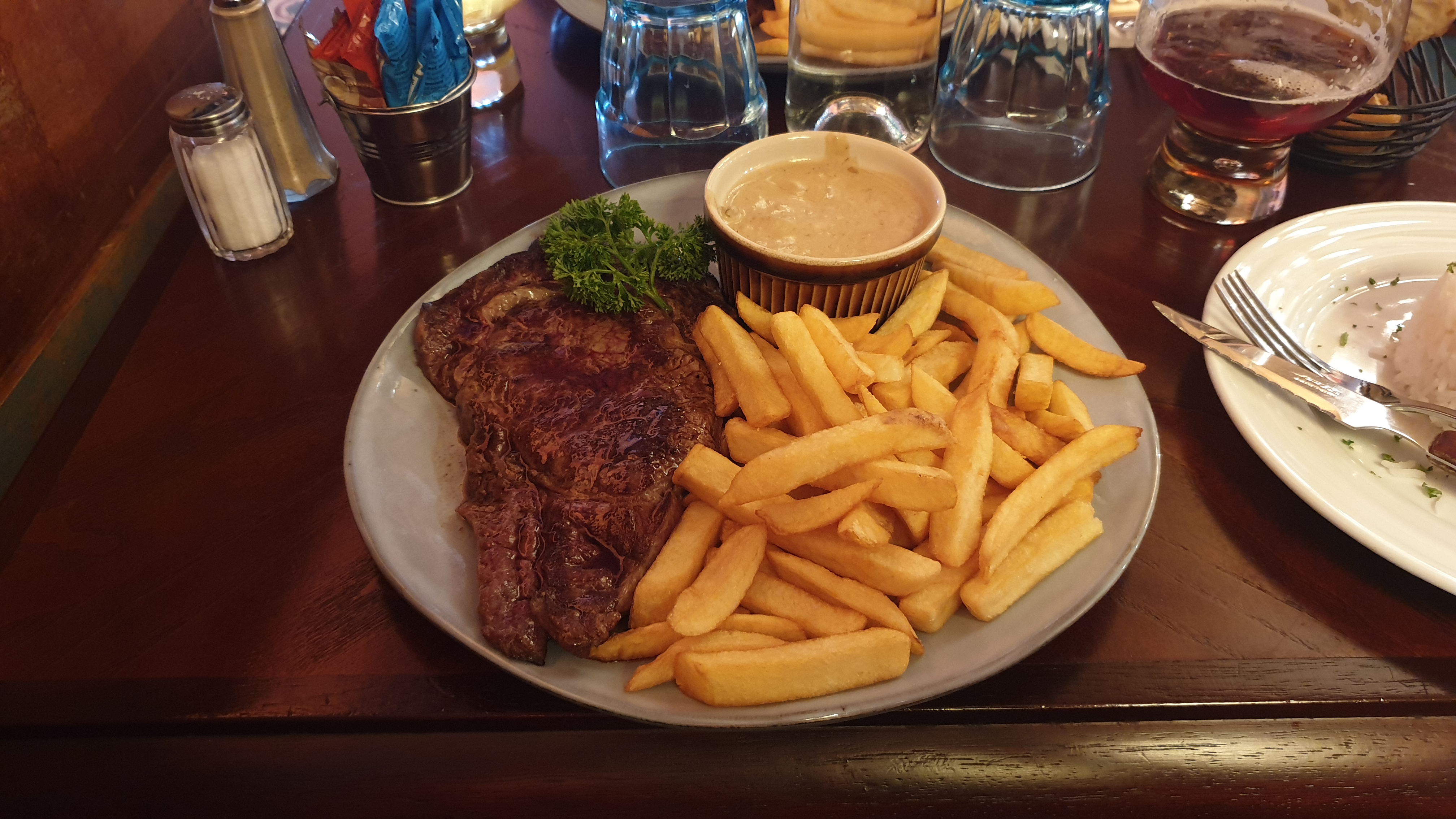 L'accueil est très chaleureux et la serveuse qui s'est occupé de nous toute la soirée a été vraiment géniale, par contre j'ai trouvé le rumsteak saignant très dur de la vraie semelle compliquée à mâcher dommage. Et le beurre à l'ail surgelé n'a jamais voulu fondre😅 Le plat de mon conjoint lui était bon!