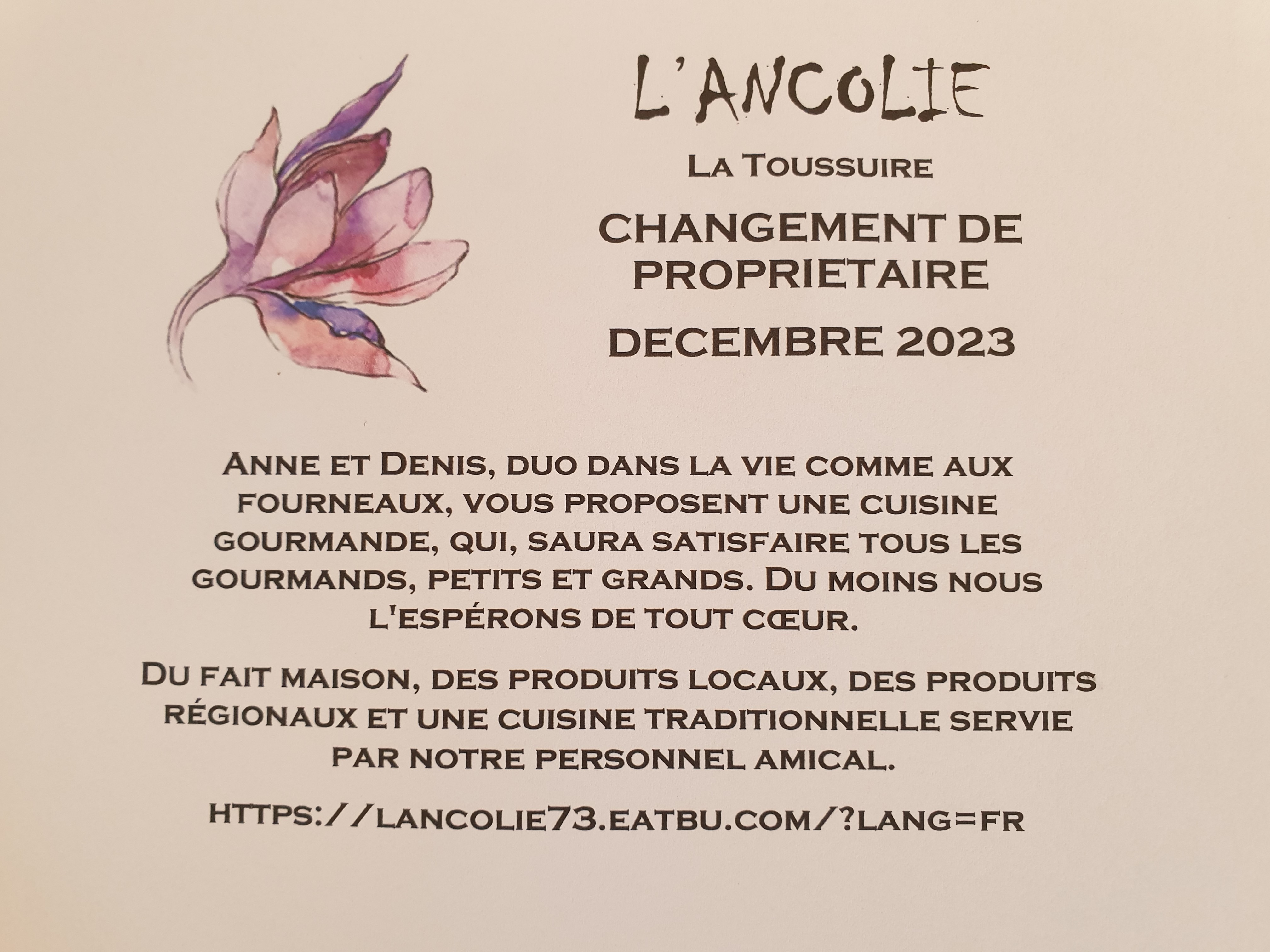 Nous avons passé un très bon moment, la responsable nous a même appelé sur notre téléphone pour nous dire que notre table était prête avant l'heure. Les serveur(se)s sont très aimable et souriant. Je recommande !!! Bonne continuation l'Ancolie