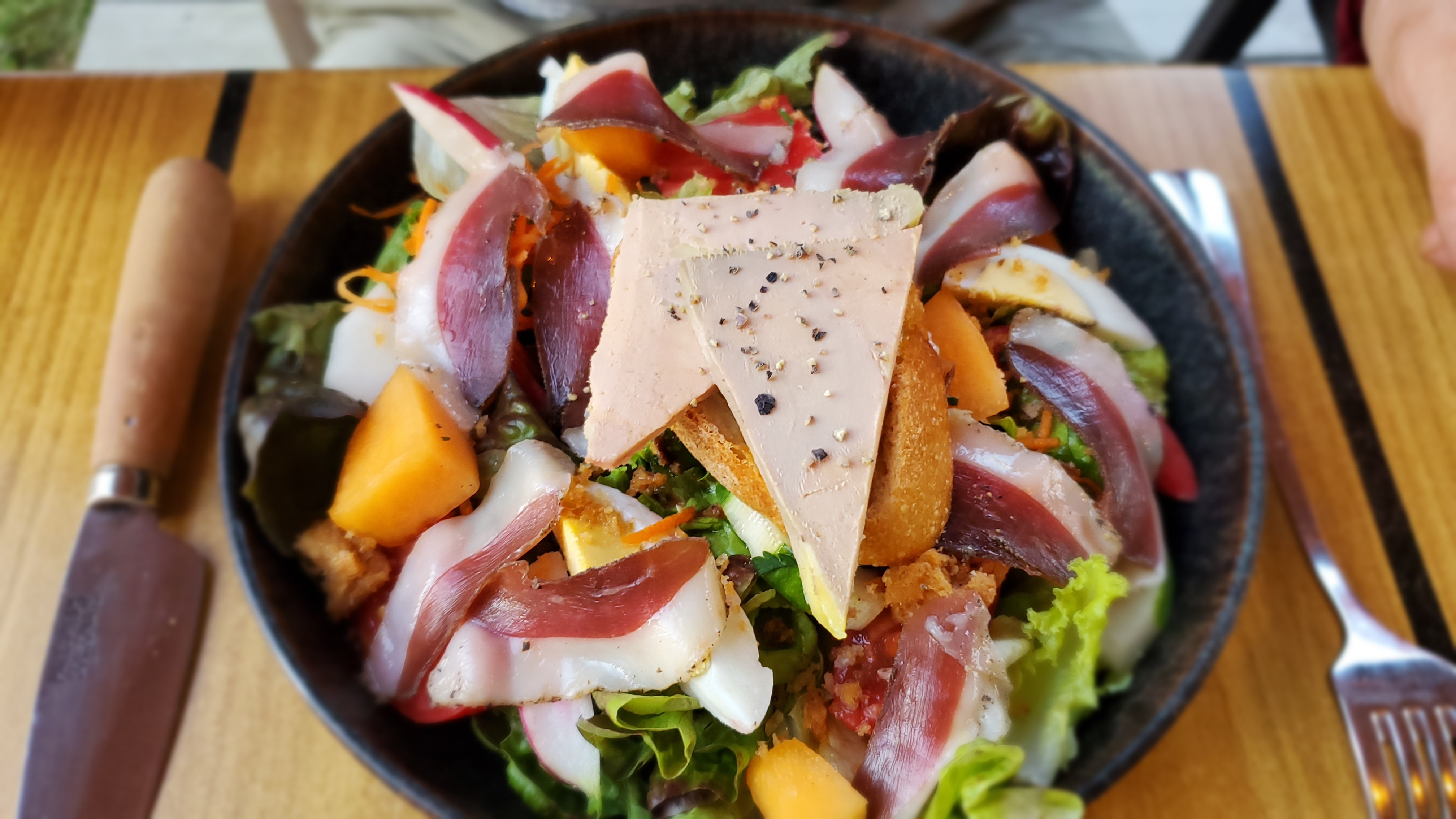 Boeuf servi froid, foie gras un peut trop salé Les frite extra