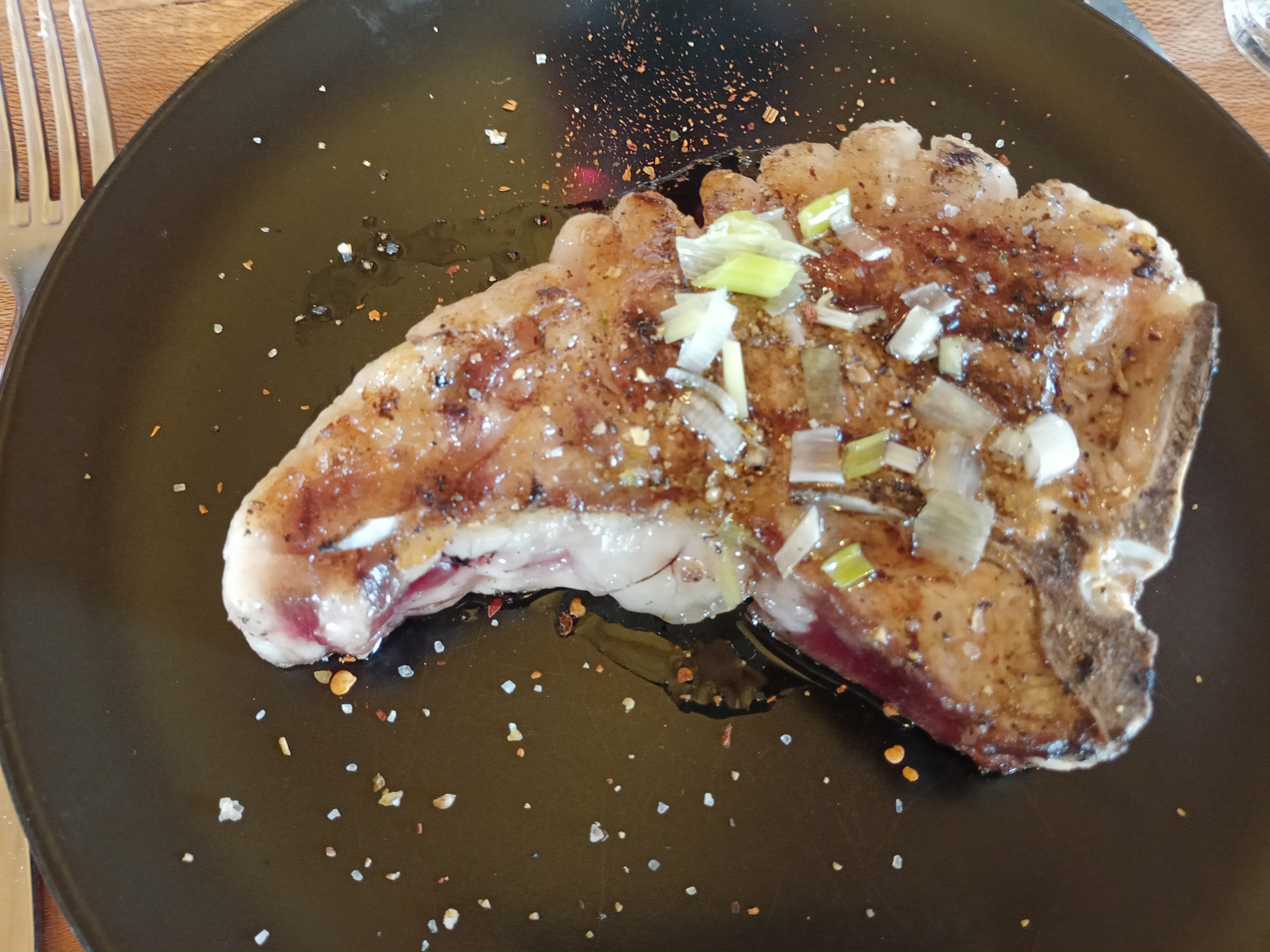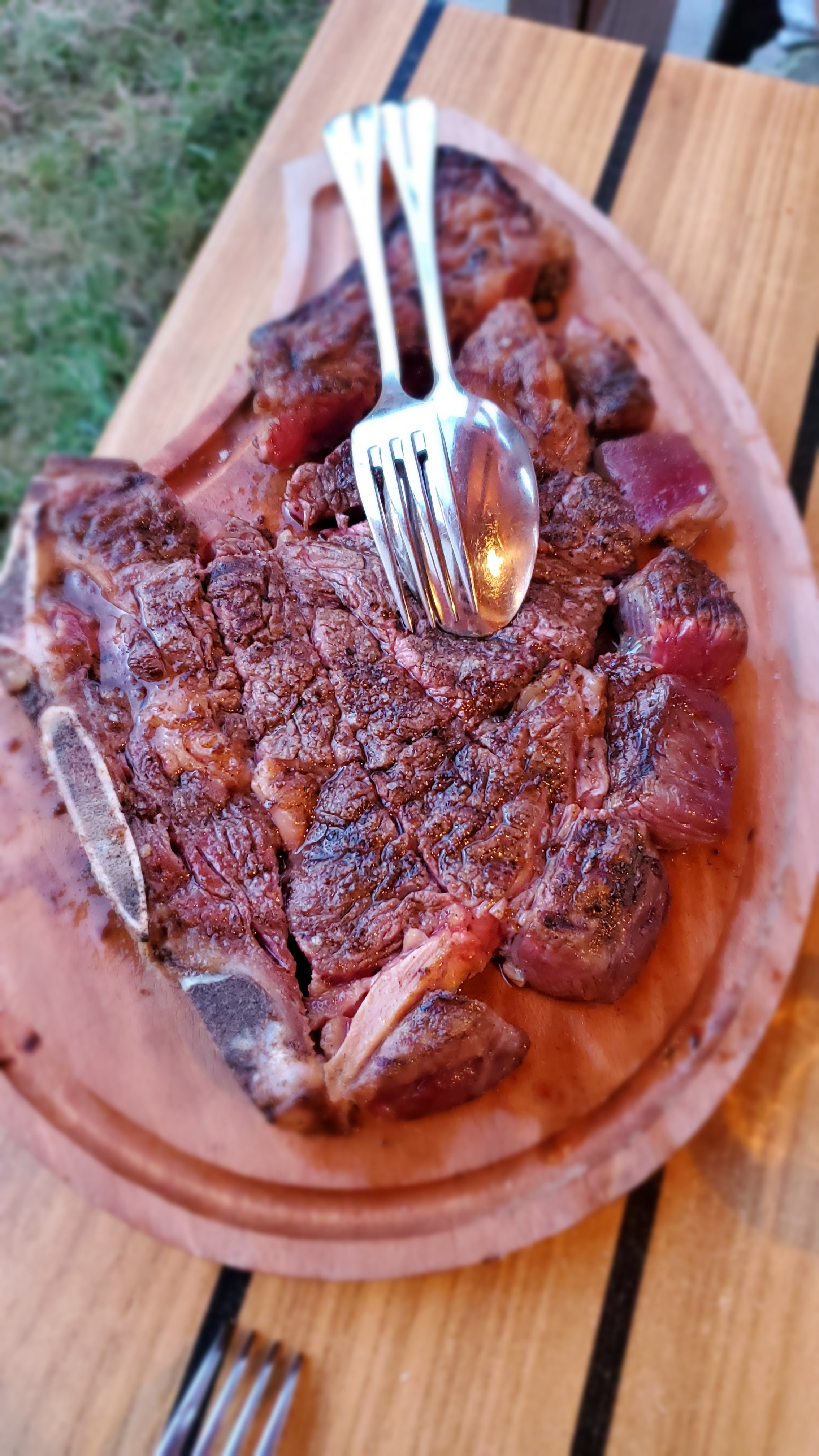 Excellente viande cuite au feu de bois. Salle magnifique et terrasse très agréable pour ce beau dimanche ensoleillé. Merci a toute l'équipe