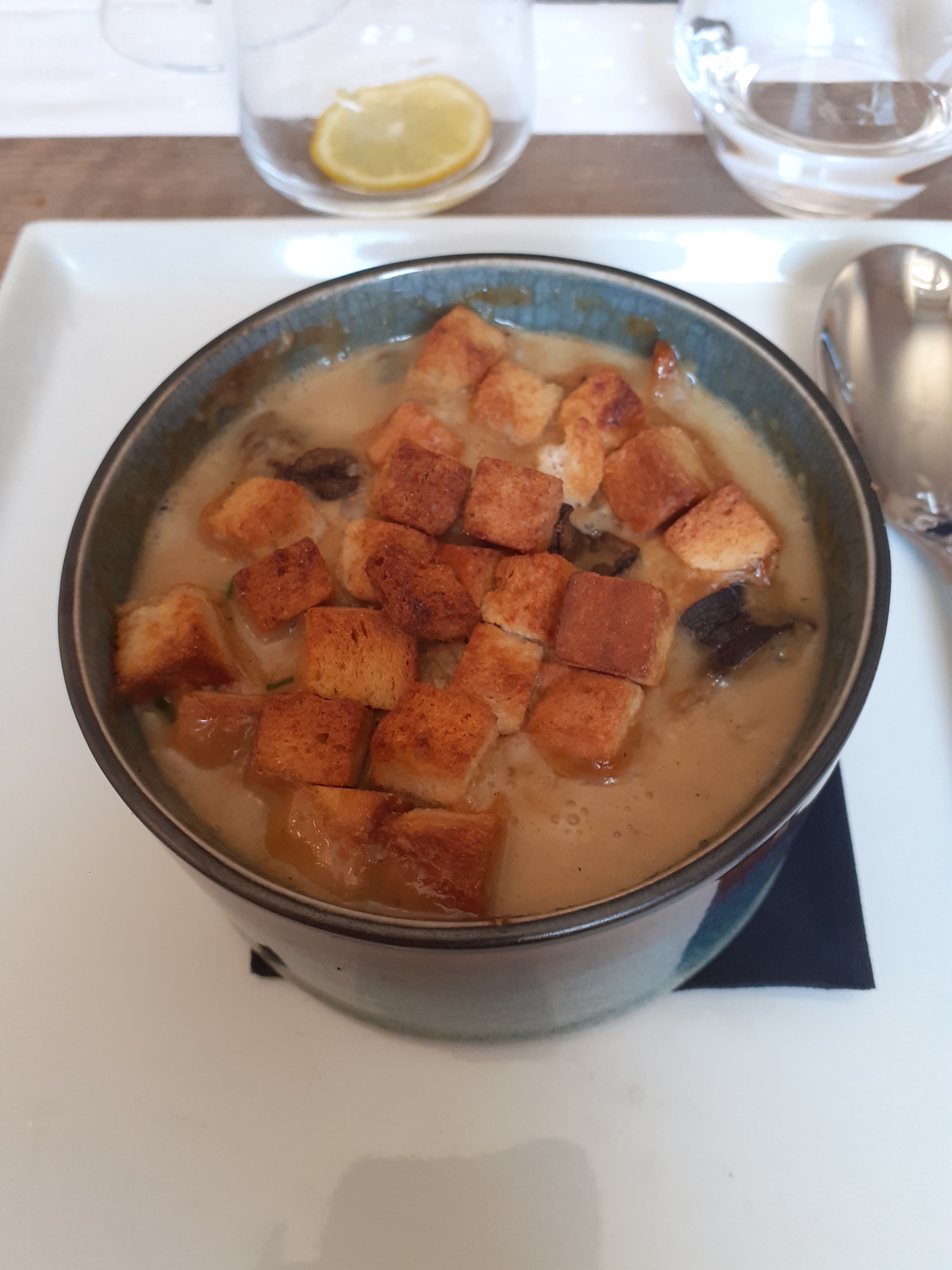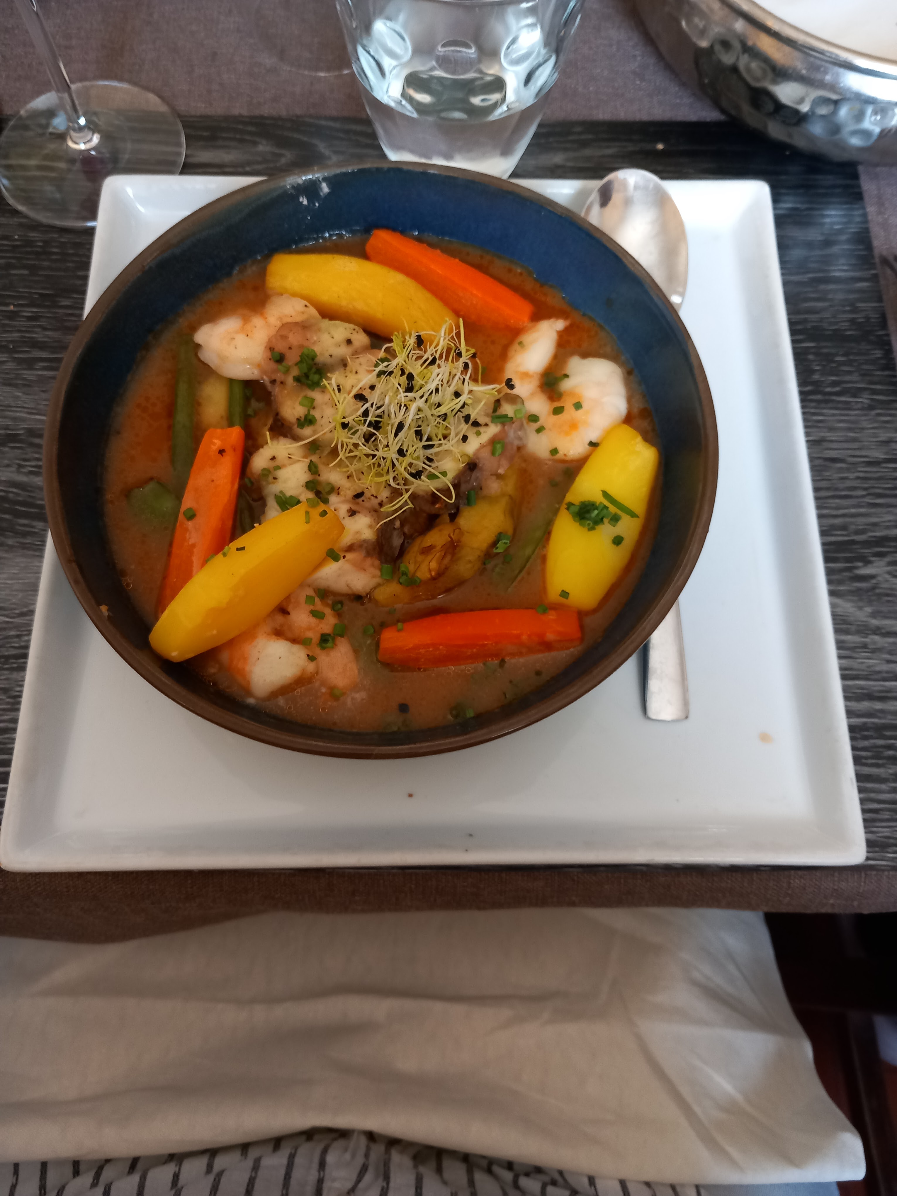 Posté le 17/10/2023 à 13:50"Première visite dans cet établissement à 10, les saint jacques sur le velouté de butternut ont ravi les papilles par rapport aux œufs en meurettes qui étaient trop cuits et la sauce un peu trop salée à notre goût.Nous nous sommes régalés avec la tête de veau,le navarin de lotte et gambas, le filet de boeuf qui était extrêmement tendre, le filet de bar était lui bien cuit,bonne surprise avec le saumon frite du menu enfant de moins de 10 ans, présentation et préparation soignée,juste une petite déception pour le dessert du ce menu, en effet manque de précision sur la carte qui n'indiquait pas qu'il n'y avait pas de choix pour les boules de glace. La brioche caramélisée était un délice. Nous avons été satisfaits dans l'ensemble."