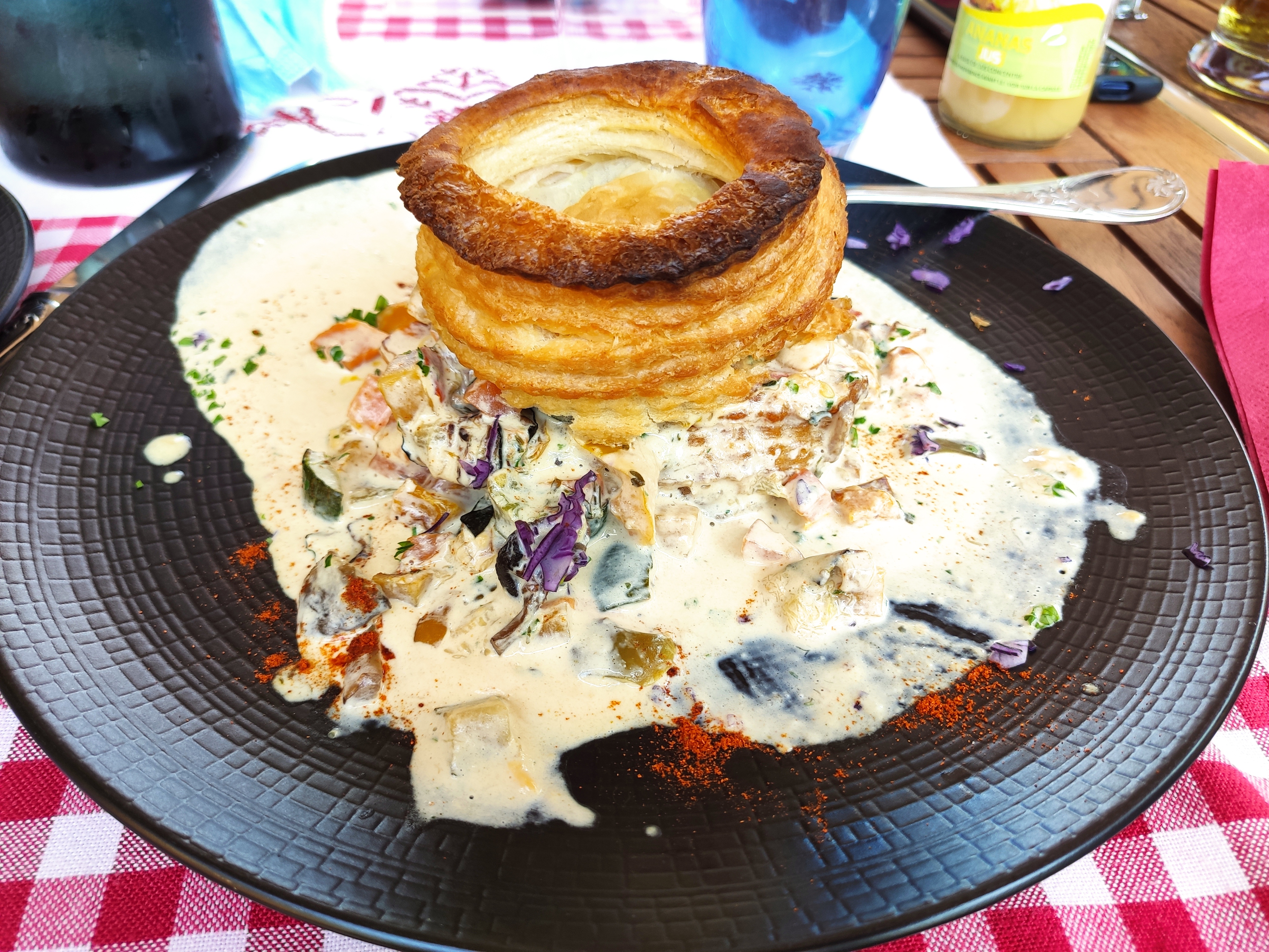 J ai mangé une choucroute. Trop de clous de girofle. Mon mari. Une bouchée à la reine. Où est la reine? Des boulettes. Des carrés de poulet. Beaucoup de champignons. Il a été malade. Vraiment pas bon.