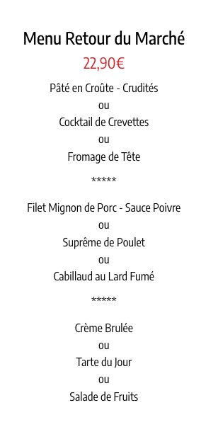 5 étoiles pour le repas d'hier soir. Je trouve le lieu très sympa. Le service était un peu long mais la serveuse était seule et elle est tellement gentille et agréable que ce n'etait finalement pas grave du tout. 2 menus retour du marché avec bavette pour moi et poisson pour madame. Cuisson parfaite pour les deux. Le dessert du menu ne me convenait pas j'ai demandé si je pouvais avoir une coupe de glace à la place. 1€ plus chère sur la carte mais on ne m'a pas facturé de supplément. Les tarifs sont raisonnables. Nous avions très bien mangés en partant et c'est bien le plus important. On y retournera c'est une certitude.