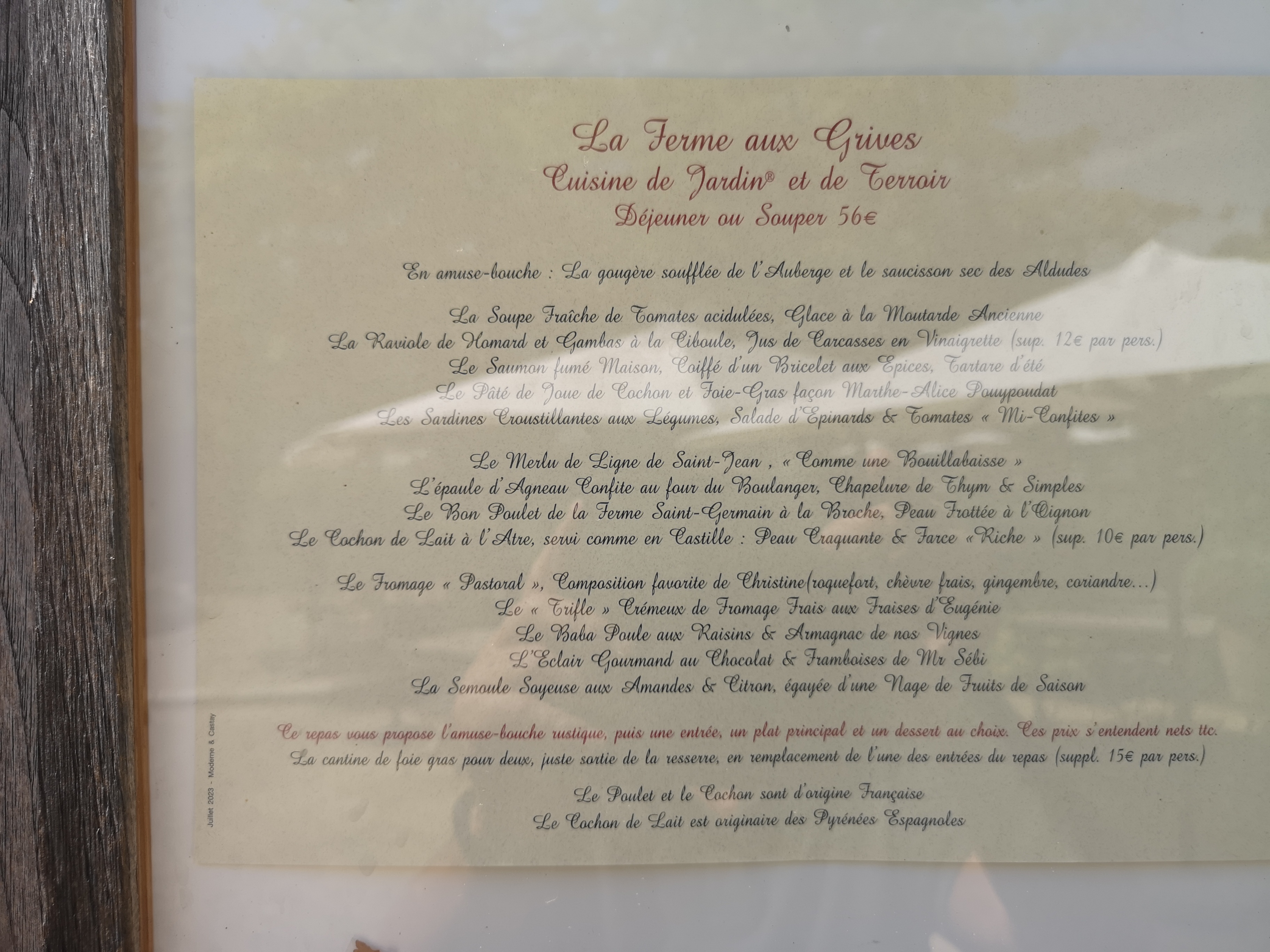 La notoriété de Michel Guérard nous a attiré vers la ferme aux grives ,le décor est très agréable, la vieille ferme restaurée avec des cordes de piments suspendus aux poutres ,un magnifique parc soigneusement fleuri , ce jour là (fête des pères) un orchestre de jazz super bon ,la table mise sur la terrasse ombragée (sauf la notre ,il a fallu insister lourdement pour obtenir un parasol) .L'apéritif maison (délicieux) sauf pour mon épouse qui a vu son verre renversé par la serveuse et pas remplacé. Le repas quelconque vu le prix , présentation sans recherche, (poulet grillé (trop) sec),service pléthorique mais peu ou mal organisé , délai d'attente entre plat et dessert 45 minutes , bref nous sommes déçus .