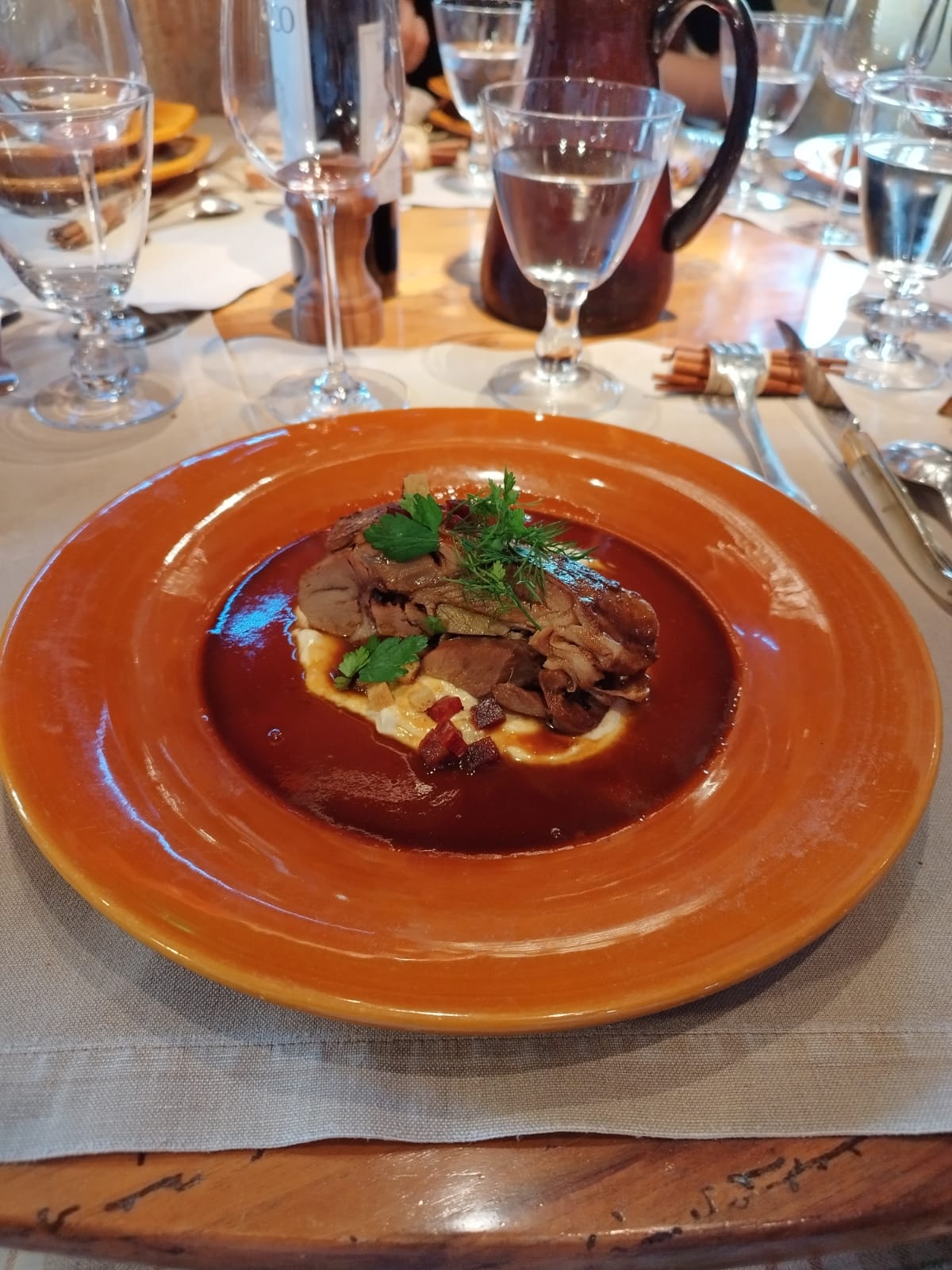 Dans une vieille ferme landaise rustique, un cochon de lait rôtit dans l’âtre, des légumes colorés sur une grande table devant. Les serveurs, joviaux et attentifs, vous expliquent les apéritifs, le menu, les plats et les vins. Ensuite, de la mise en bouche au dessert, pas de fausse note, tout est bon, fin, goutu, parfaitement assaisonné, cuit et suffisant en quantité. Le jarret de veau fondant est un pur bonheur.