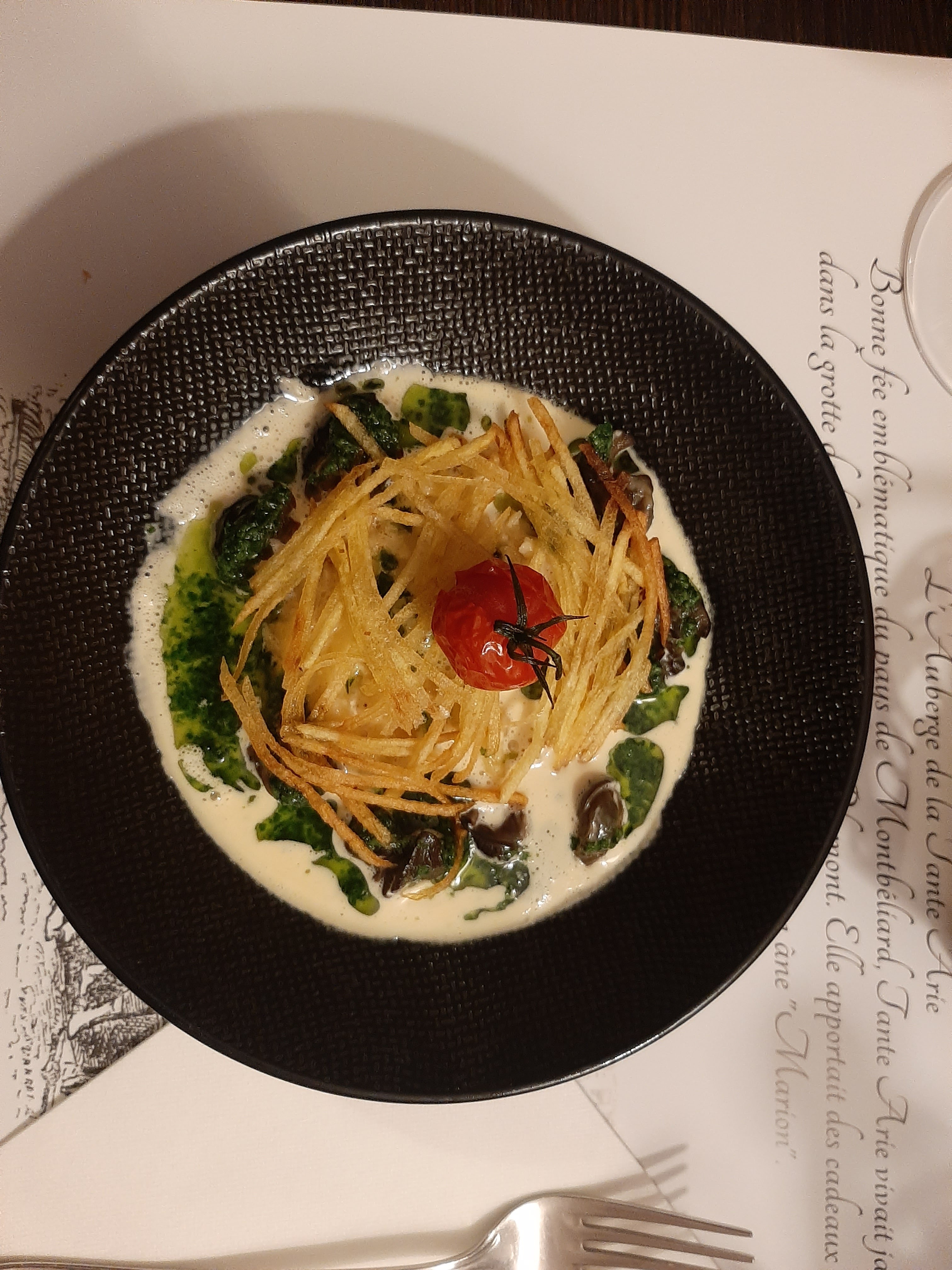 Le repas était succulent Œuf poche a la cancoillotte Cuisse de grenouille et risotto Baba au rhum Un pur délice... l'accueil et le service au top,des serveurs tres attentionnés.