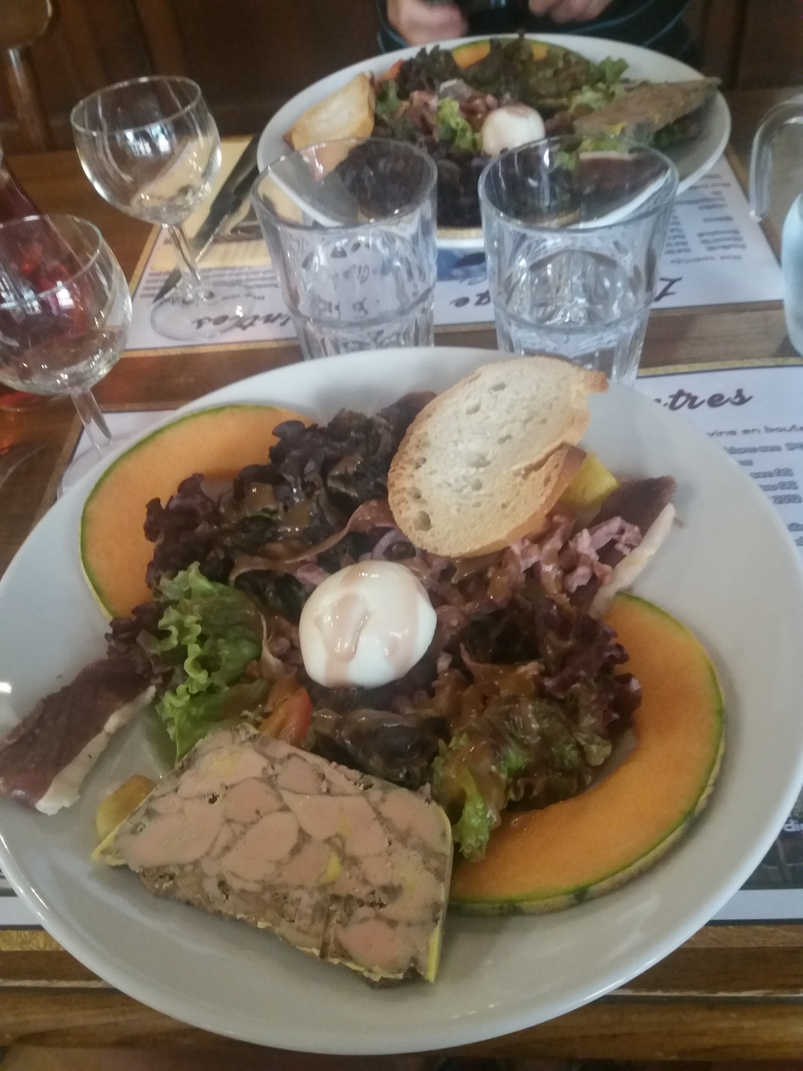 De passage pour visité le village une petite pose a l Auberge des peintres. La salade Géante du Perigord ( salade , Foie Gras, Lardon, Melon , oeuf dur, 1 petite tranche de jambon de serrano , magret de canard) . Pour 15 € la salade .Nous avons trouvez cela cher beaucoup de salade . Quelques morceaux d ananas et de pastèque se promene par ci par la ont se demande pourquoi dans cette salade ? Bref déçu.