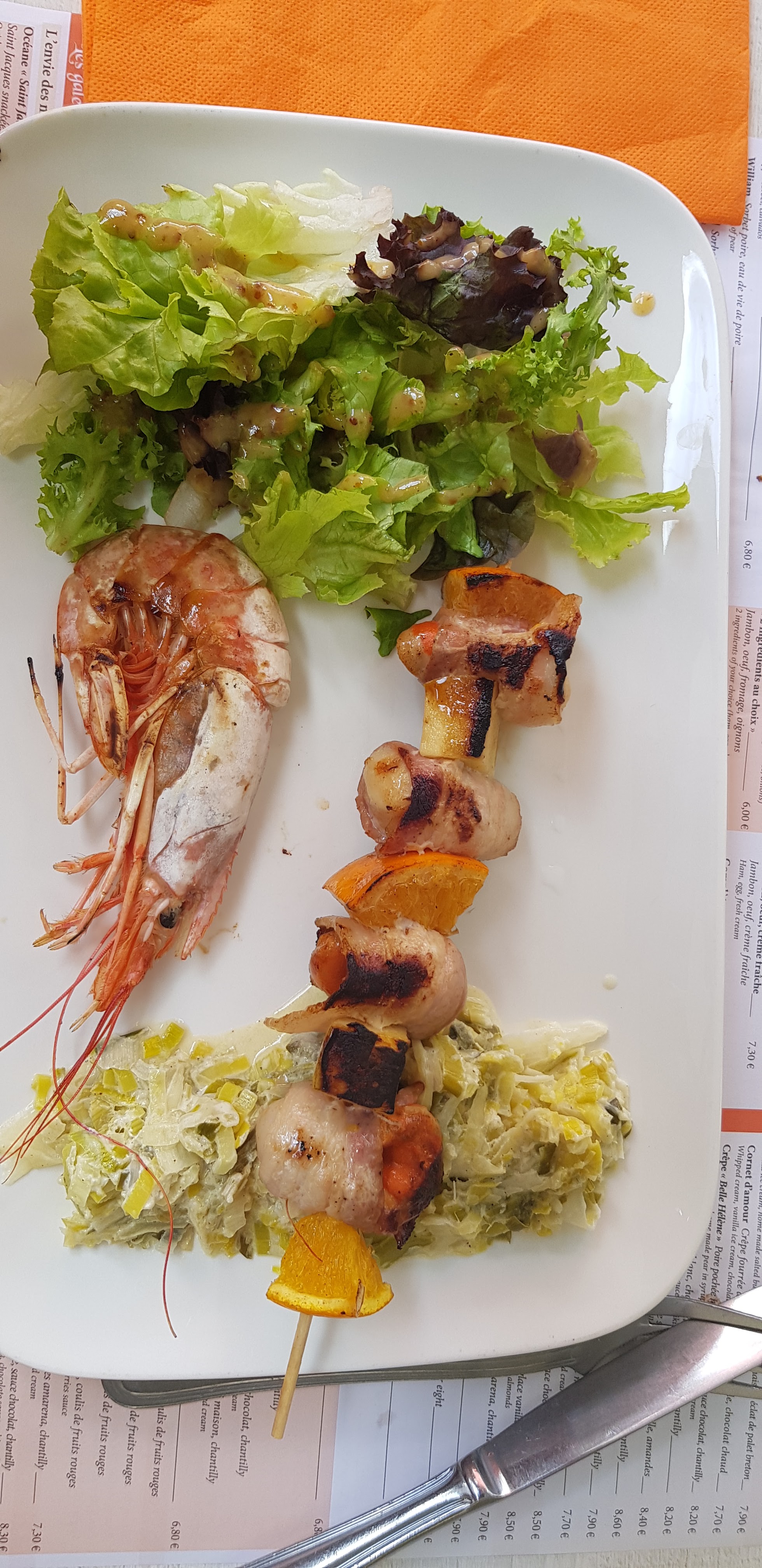 Plantureux repas. Nous nous sommes partagé une entrée de fois gras avec 3 accompagnements différents sur toast délicieux de gâche vendéenne Par contre avons été déçus par le plat principal Galette avec poêlée de coquilles st jacques0 En fait 5 noix cuites , une tranche jambon fumé, 1 gambas, salade verte couverte de sauce. Fondue de poireau en grande quantité. Galette bien cuite, très fine et particulièrement réussie. Pas pris de dessert mais 1 bon café. Service souriant efficace et attentif.