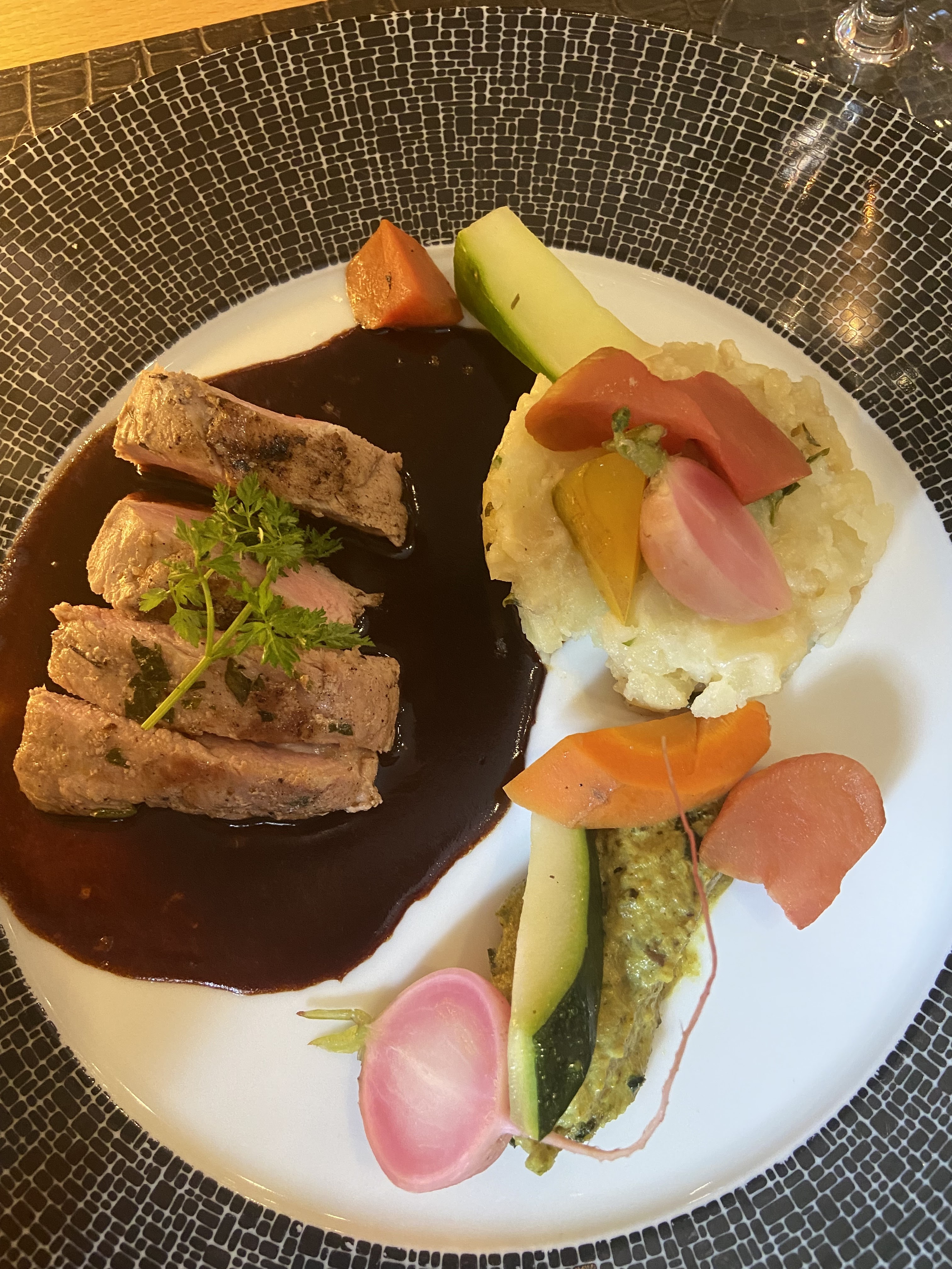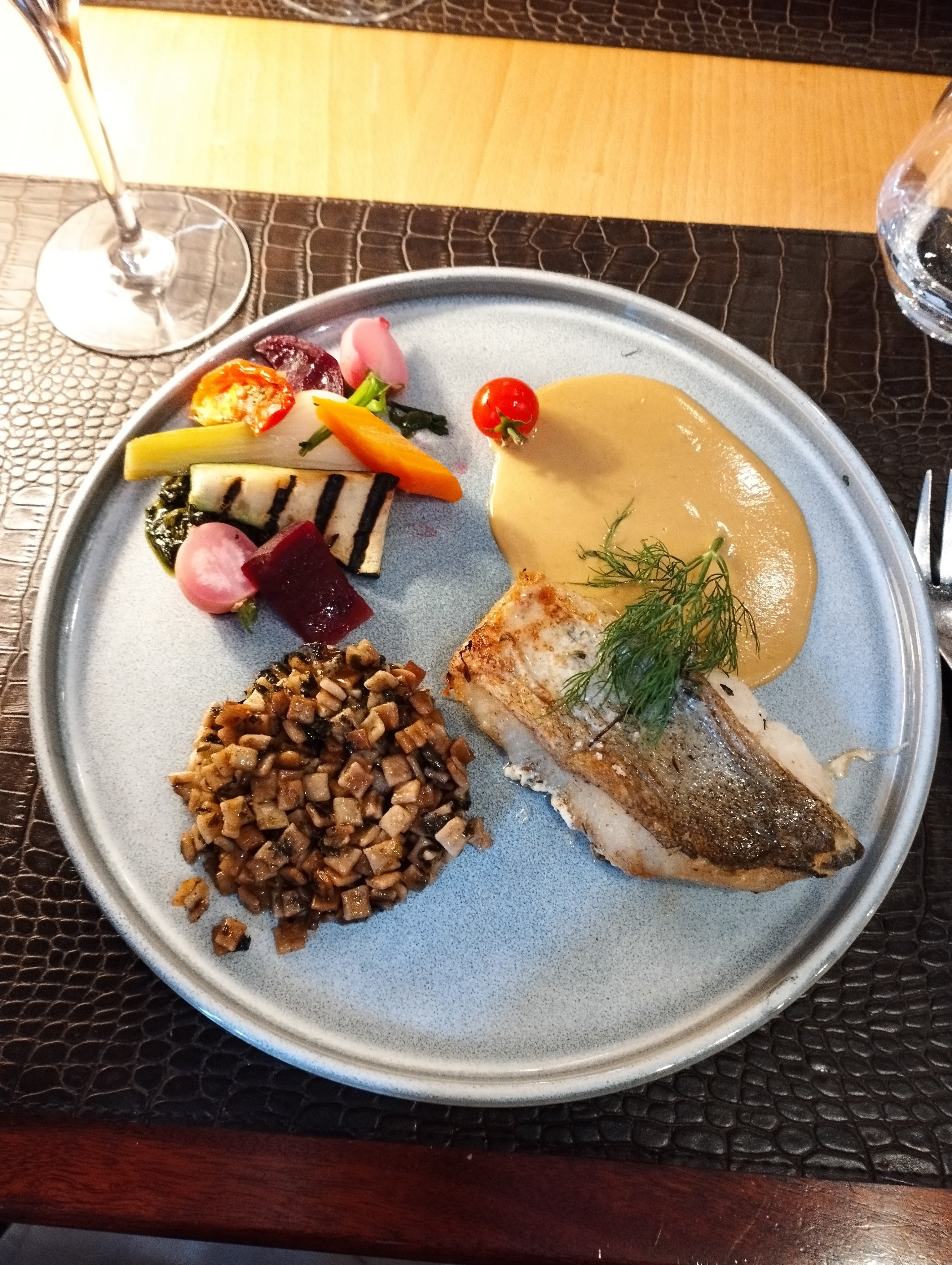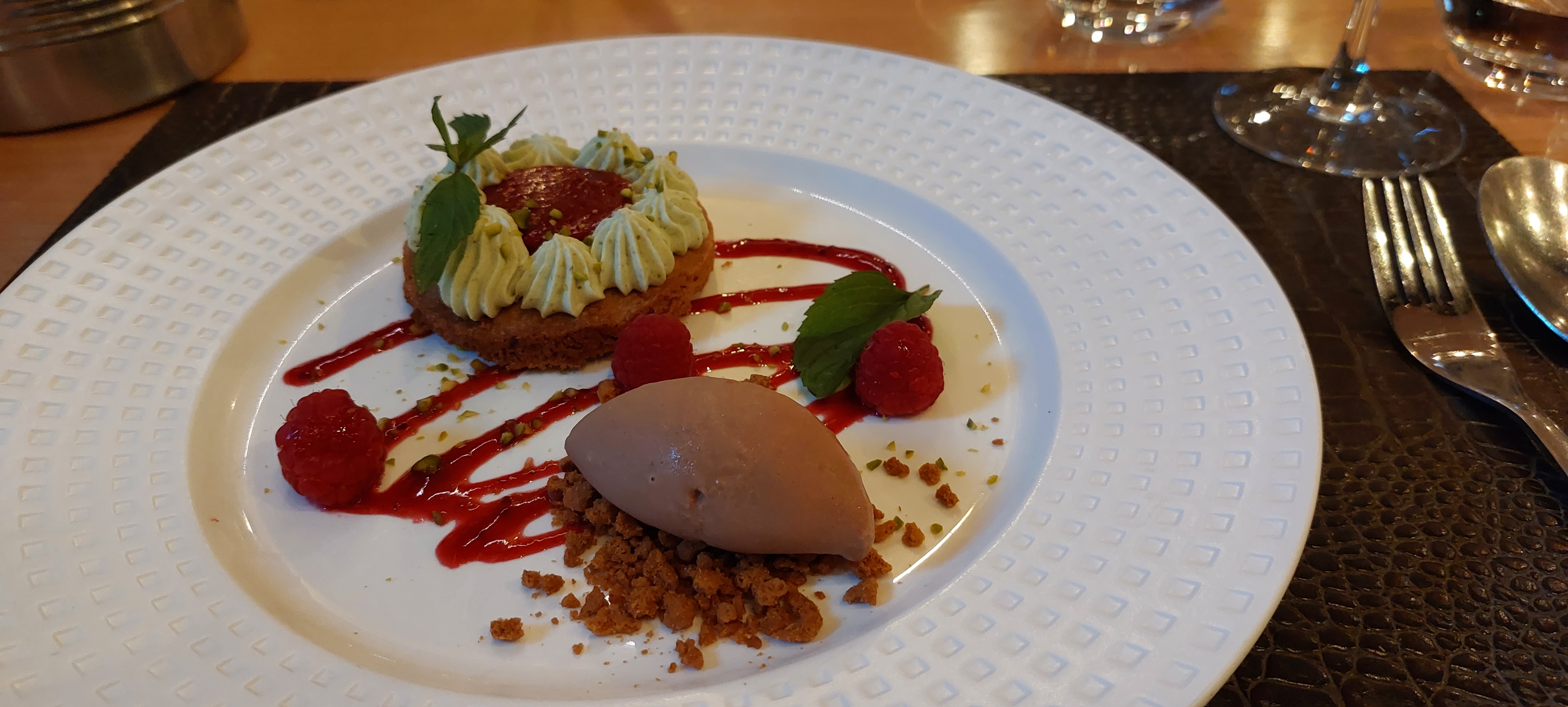 Bel établissement, belle vaisselle, plats goûteux joliment dressés, dessert manque d’originalité, personnel de service au petit soin