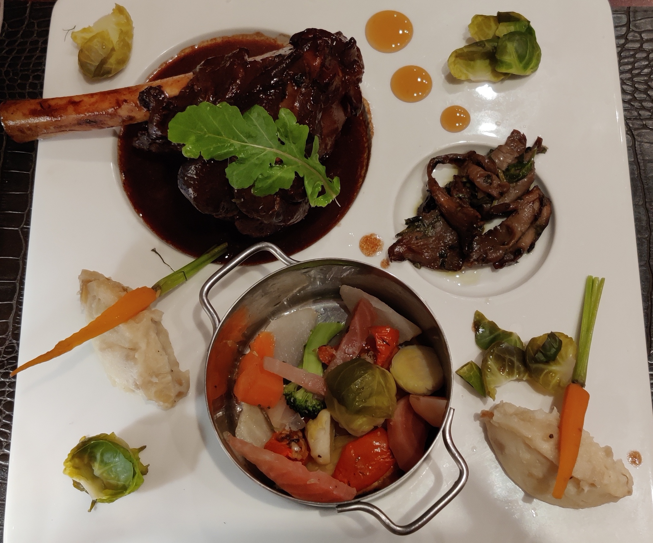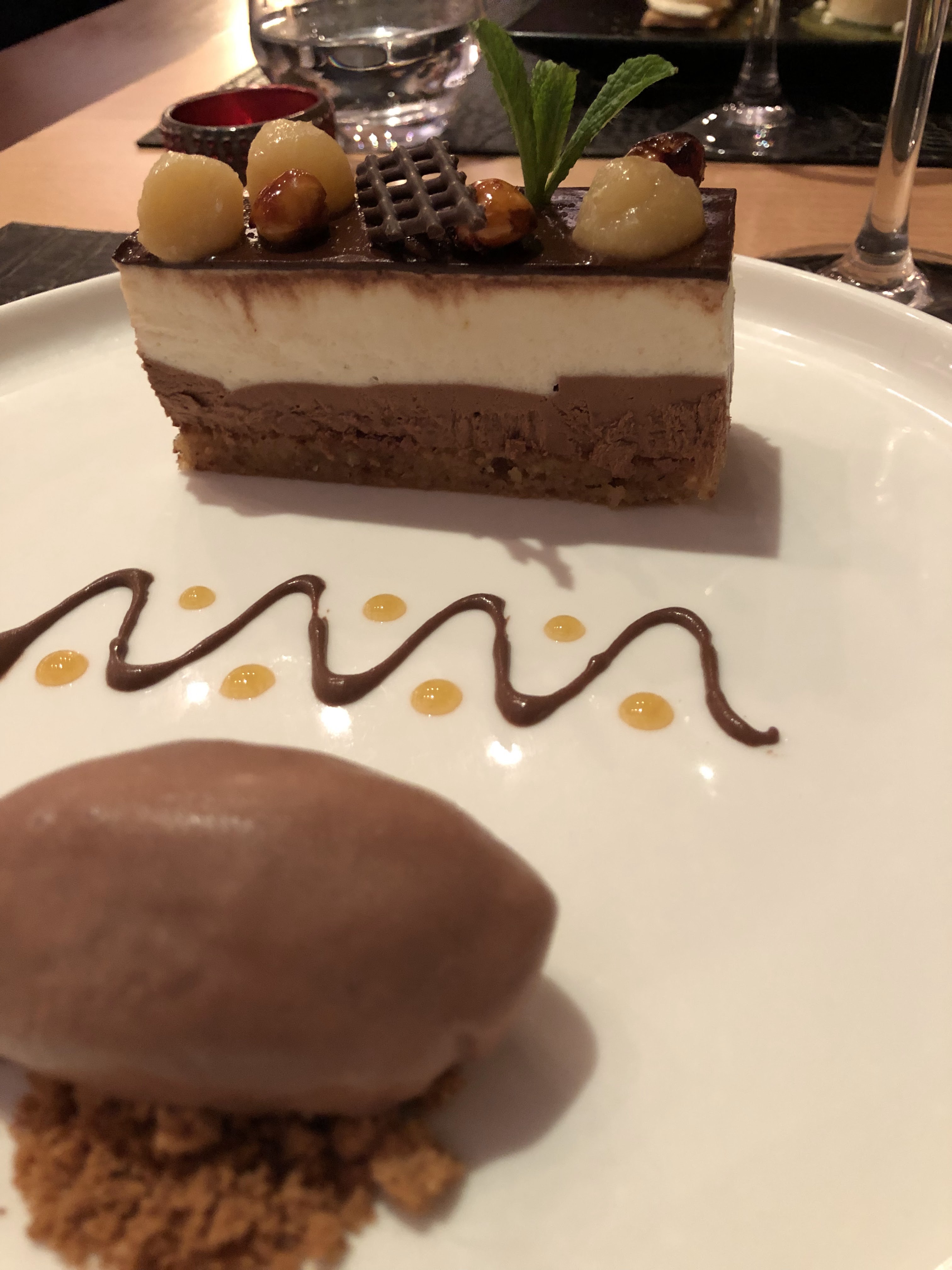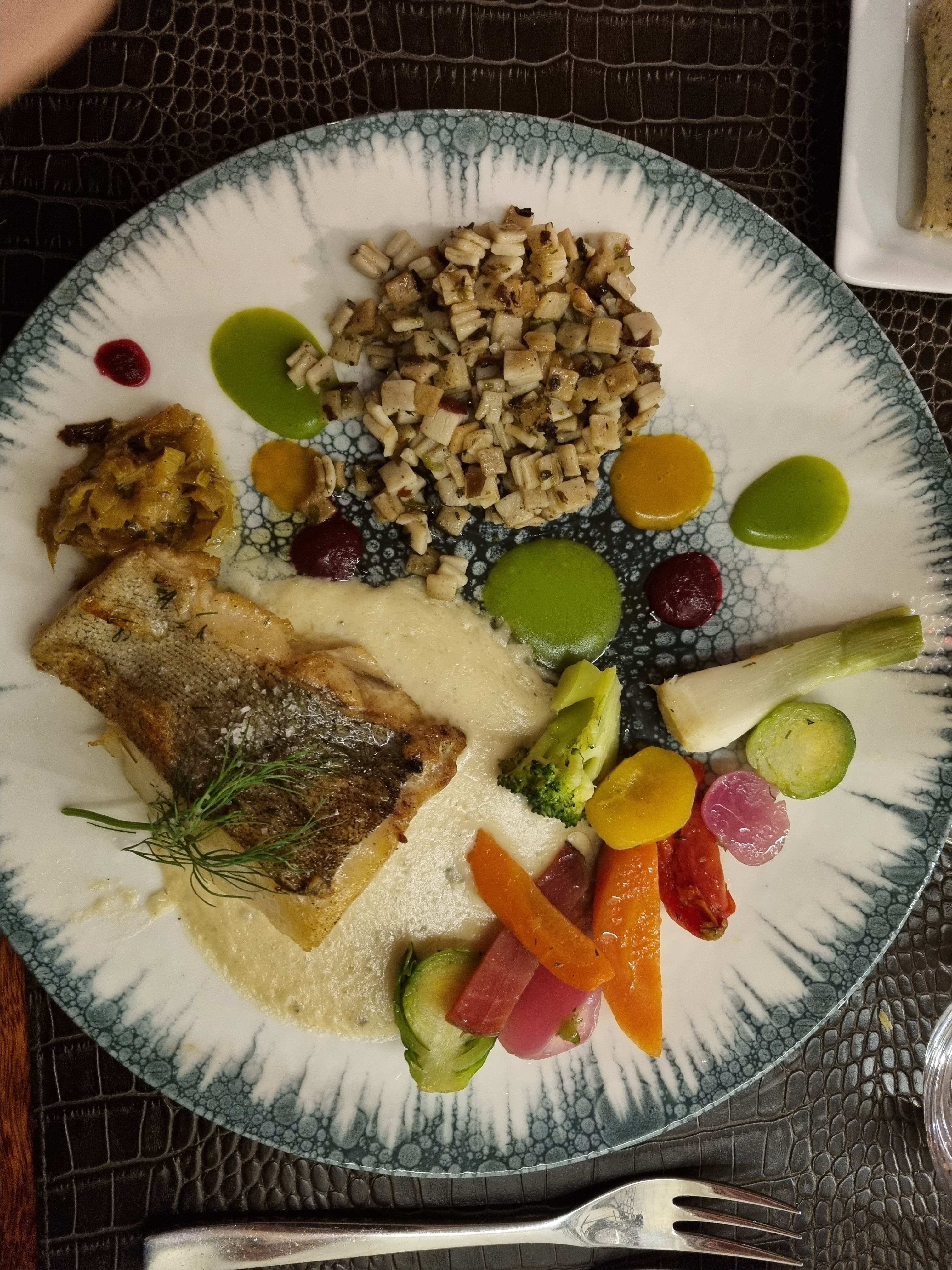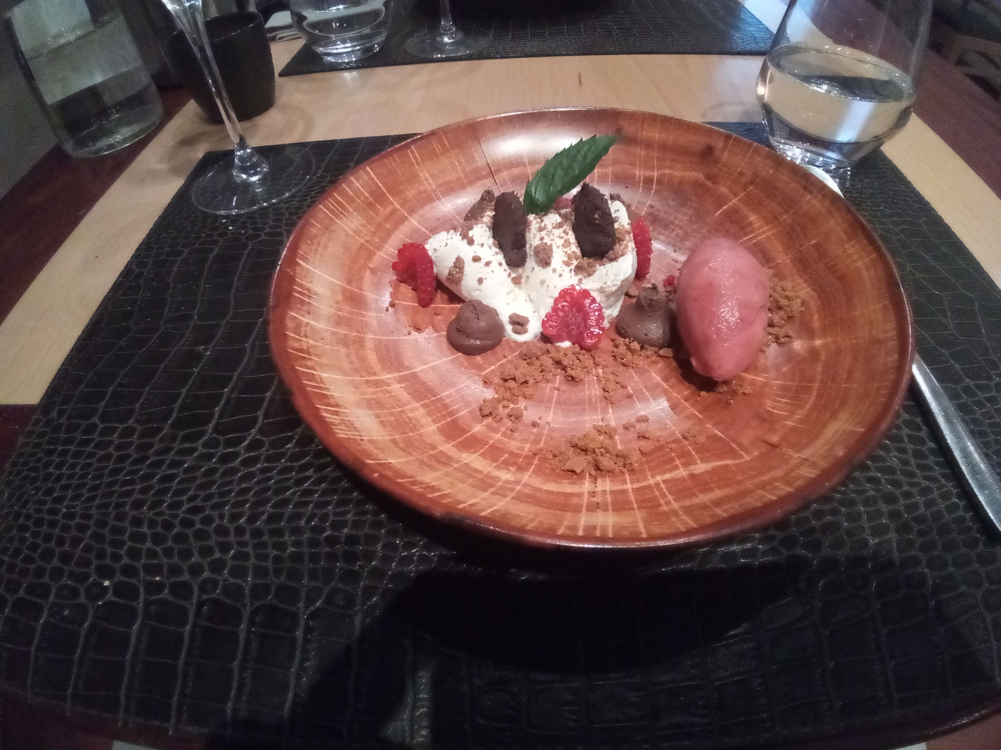Bel établissement, belle vaisselle, plats goûteux joliment dressés, dessert manque d’originalité, personnel de service au petit soin